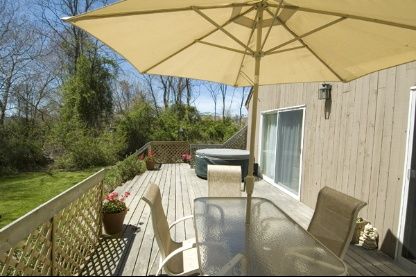 Privately sited amidst .85-acre of mature landscaping, this darling Saltbox is a wonderful retreat, with many amenities. Bright and airy, the 1,800+ square-foot house features a living room with fireplace and high ceiling, sunny dining area, charming kitchen and a second-floor den. Sliding glass doors open to a large sun deck. There are three bedrooms, including a large master suite, two baths, a full basement and central air-conditioning. Th