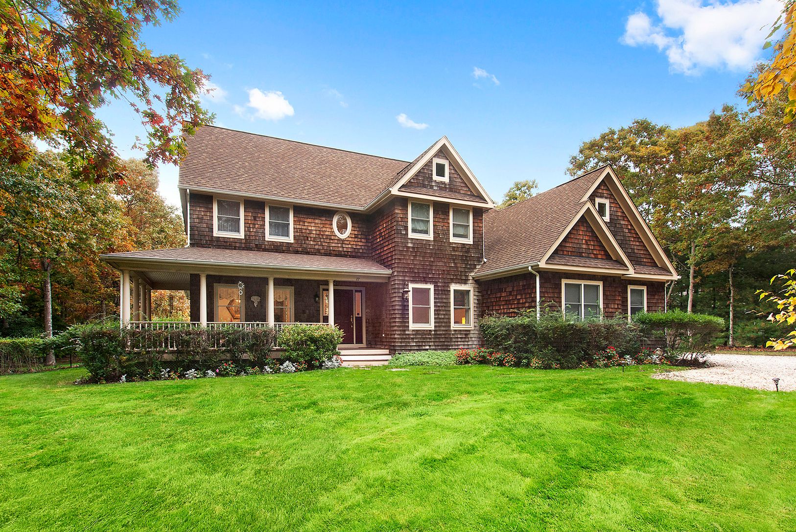 Stylish shingled traditional located on private cul-de-sac in the heart of Southampton. Perfectly sited on 0.81 +/-acres. Offering 3,140 +/- sf of living space, four bedrooms, 3 full and one half baths. Beautiful foyer leads to light filled living room with double height ceiling, fireplace and French doors opening to large patio and sprawling lawn. Eat-in kitchen with stainless appliances, formal dining room, den and first floor master suite