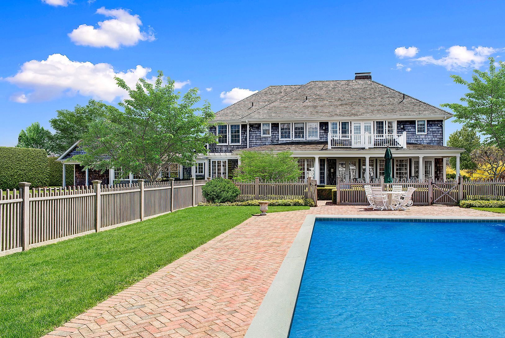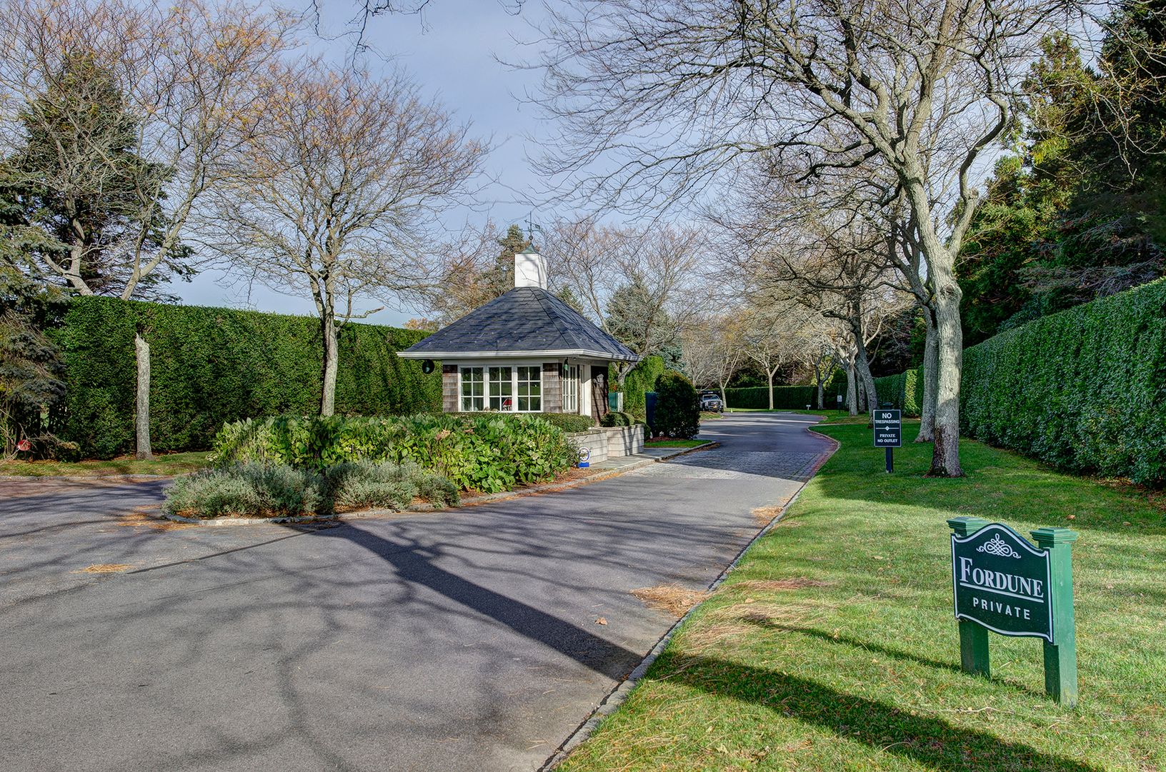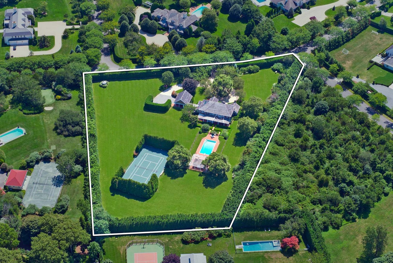 Meticulously landscaped with mature trees and plantings, this park-like property is situated in the prestigious and gated Fordune estate section of Southampton. Highly sought-after with deeded ocean access, this magnificent parcel offers more than 3 acres of possibilities. The existing home is a lovely shingled traditional featuring six bedrooms, five and one-half baths, a pool house, gunite pool, and Har-Tru tennis court. The property has th