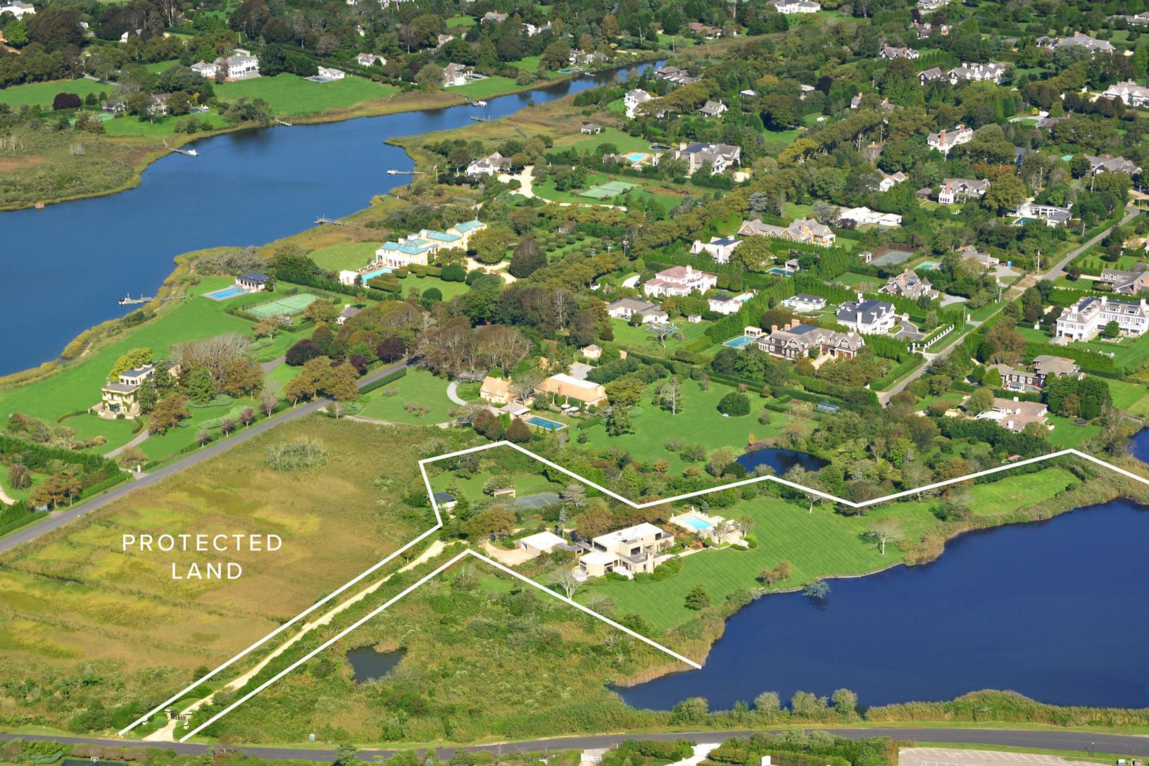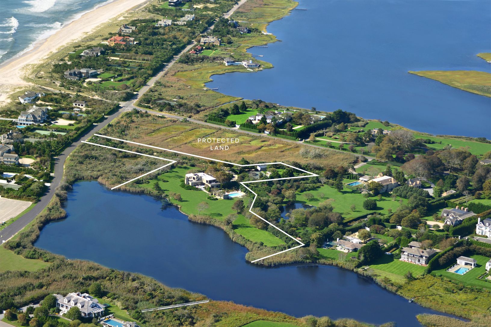 Idyllically situated on Halsey Neck Pond, steps from the ocean and Hamptons' finest beaches, this contemporary waterfront estate is set on 5.53+/- sprawling acres and offers magnificent ocean and pond views. With over 700+/- feet of direct water frontage, the property is perfectly positioned to enjoy picturesque waterfront sunrises and brilliant sunsets over the adjacent protected land to the west that can never be built upon.