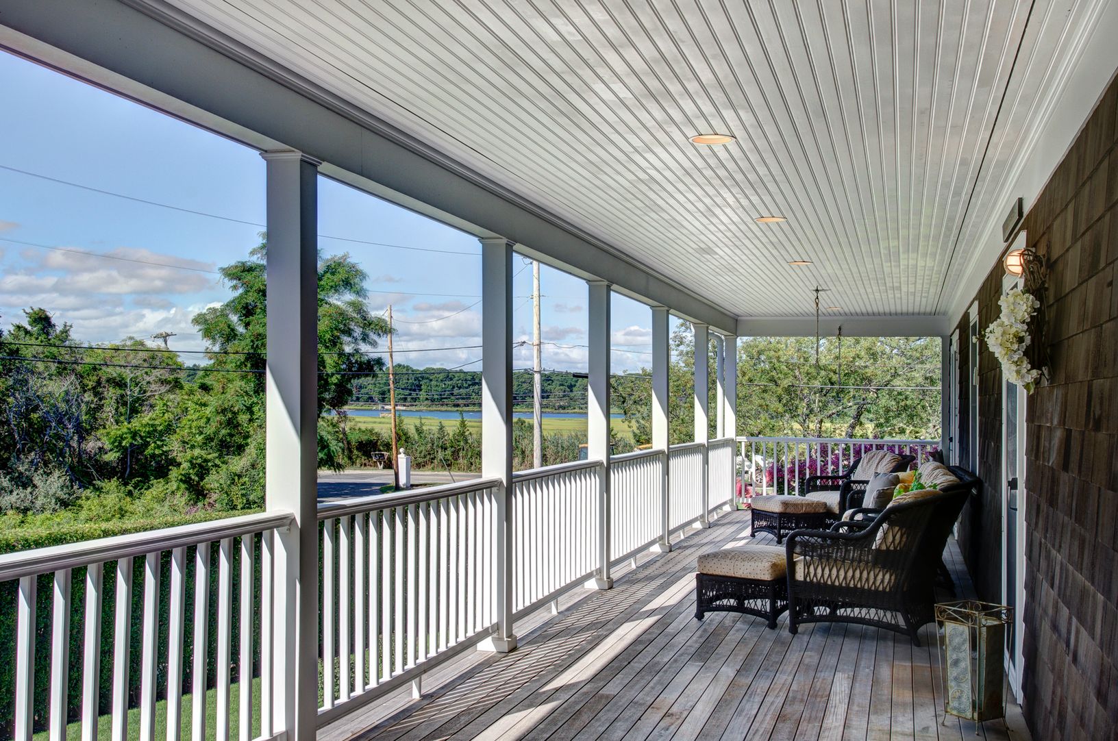 ***SALE PENDING - CURRENTLY UNDER CONTRACT*** Located in "North Sea Beach Colony", this property offers deeded access to a private bay beach on Peconic Bay and scenic views of pristine Scallop Pond! The spacious three-story shingled Post Modern beach house of 4 bedrooms, 3.5 baths boast an open, main floor with large coffered-ceiling living room, gas fireplace, formal dining room, French doors to a grand covered porch and gourmet chef's kitc