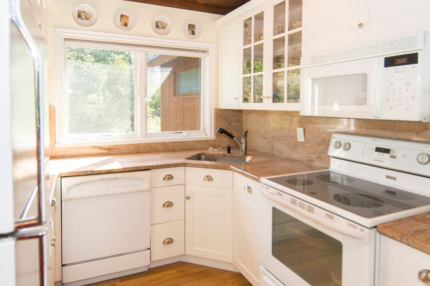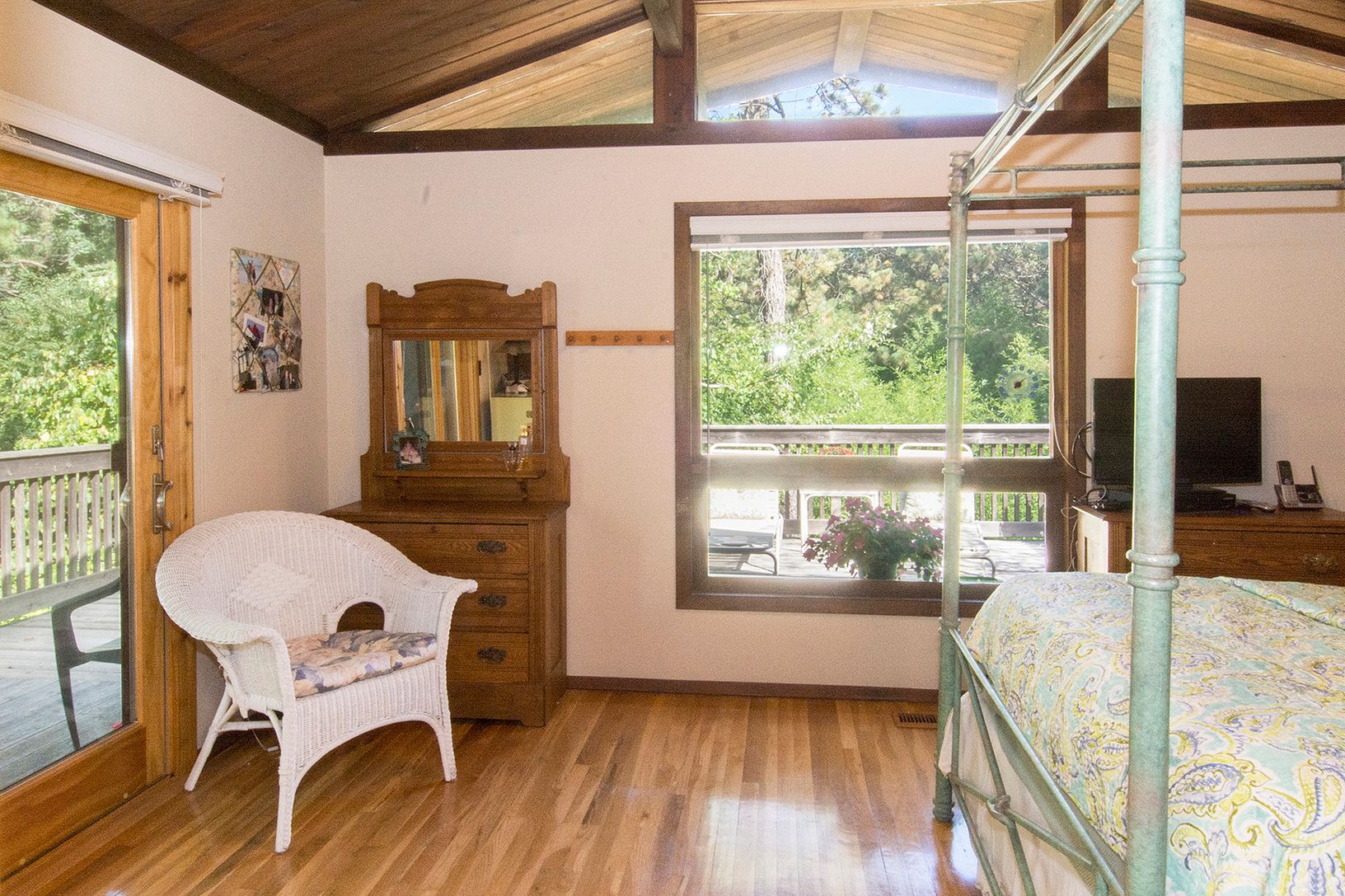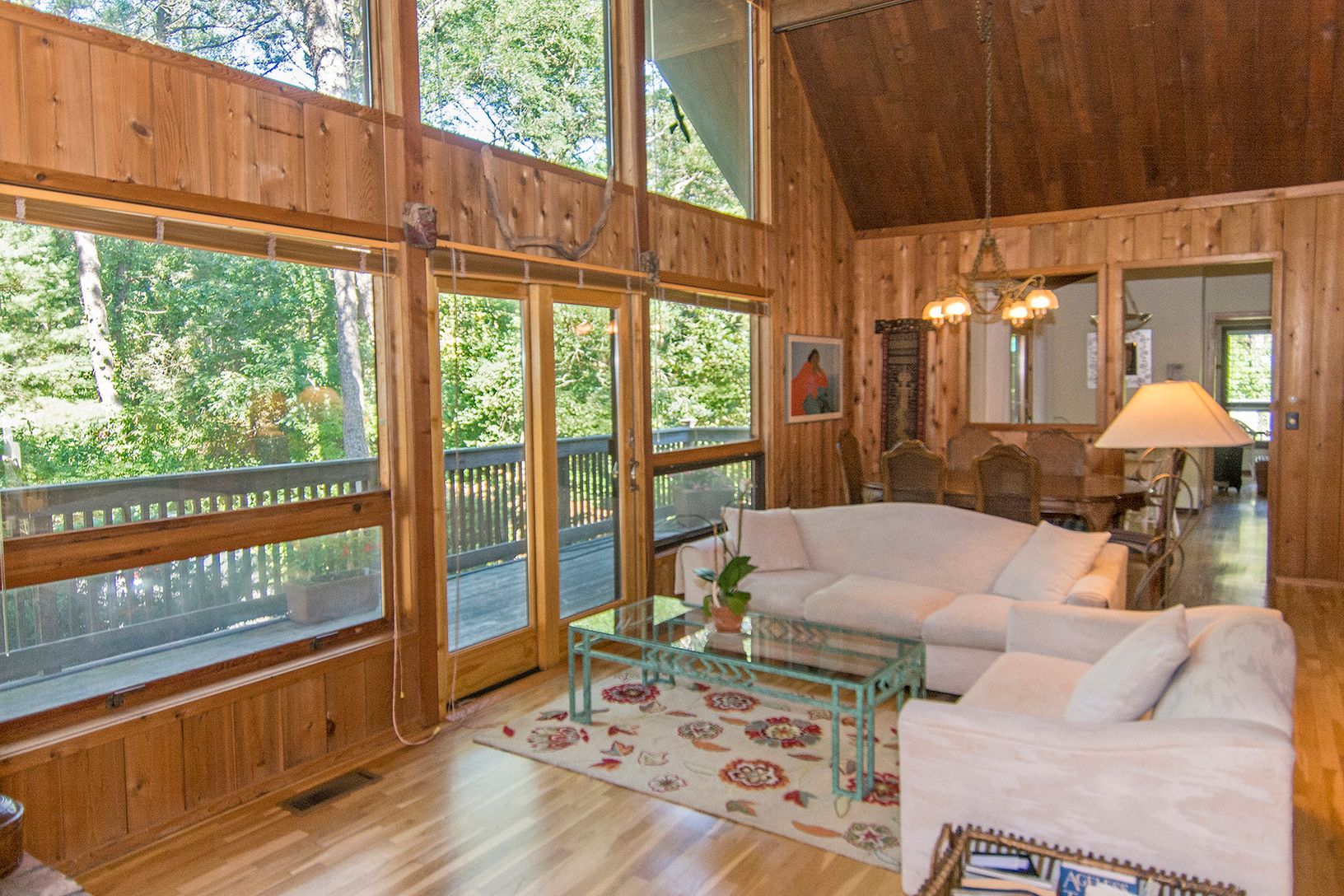 Unique, Lindal designed, chalet style home with an open floor plan is constructed of thick maintenance-free cedar inside and out. Enter into a double height open living and dining room, with wood burning fireplace and floor to ceiling wall of glass. The main floor has a renovated eat-in kitchen with extra storage, a double height master bedroom with a renovated bathroom, two additional guest bedrooms, as well as a renovated and bright guest ba