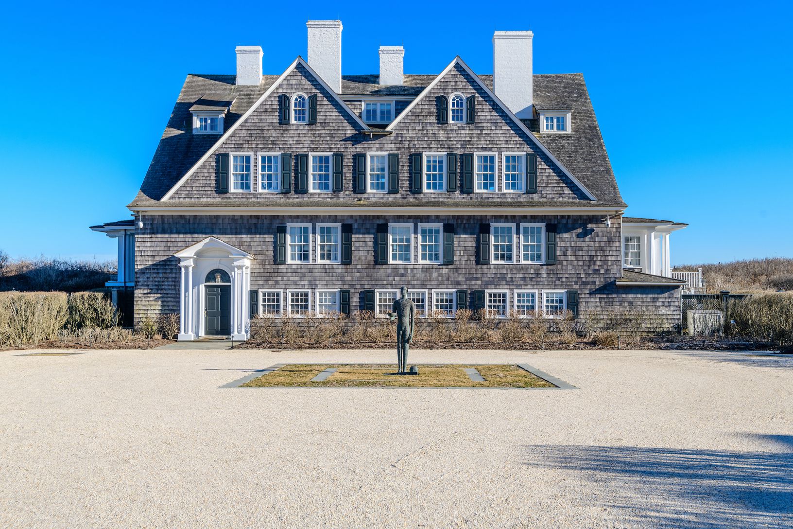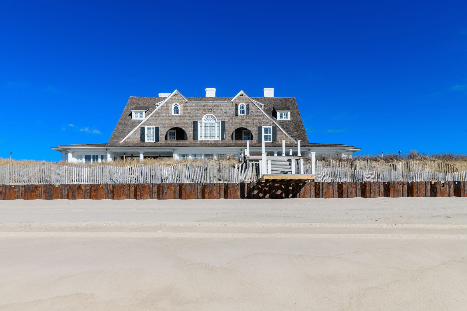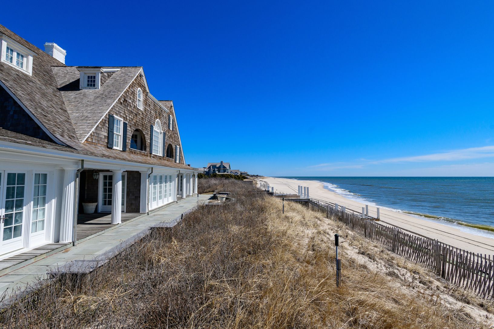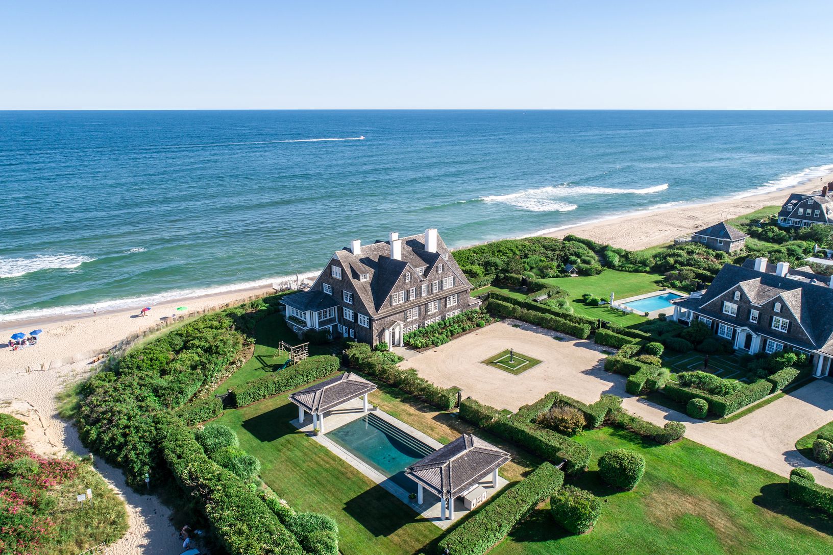 Escape to a Gilded Age jewel with abundant modern amenities, oceanfront on Southampton’s fabled Gin Lane. Built in 1890 with links to famed architect Stanford White, this iconic estate—known as “La Dune”— is a world unto its own. Hidden behind a tall hedgerow on the historic lane, a gated entry opens to a long gravel drive leading to the grand three-story, shingle-style residence rising from the central parking court. With more than 15,000 +/-