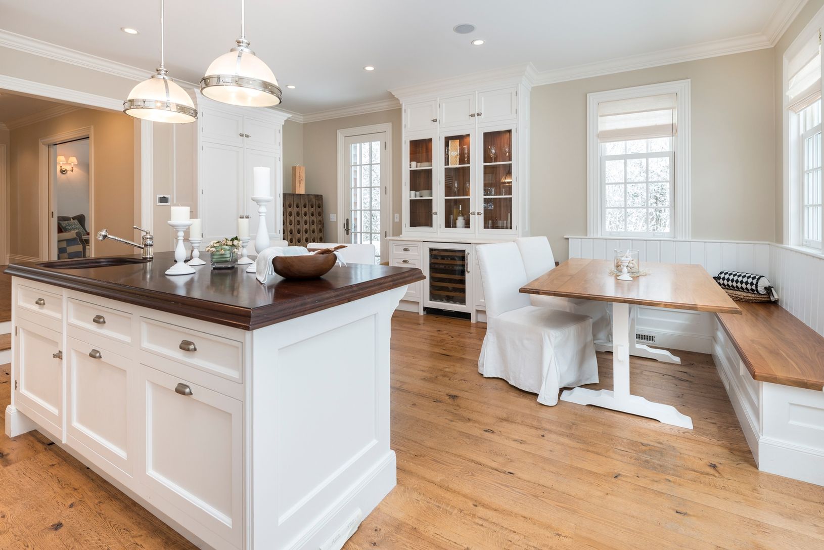 In the heart of Southampton Village, this lovely shingled traditional exemplifies classic Hamptons style. Enter from a covered front porch that's perfect for rocking chairs to a light-filled double height foyer and a hallway leading to a bright living room with fireplace, and a cozy den. The oversized eat-in kitchen centers around a large island with custom 2" teak top and seating, and features Calacatta marble countertops and high-end stainle