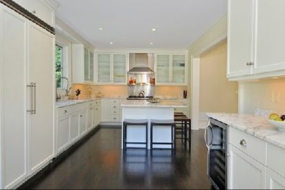gourmet kitchen design with eat-at marble-topped island, glamorous master suite with special cei
