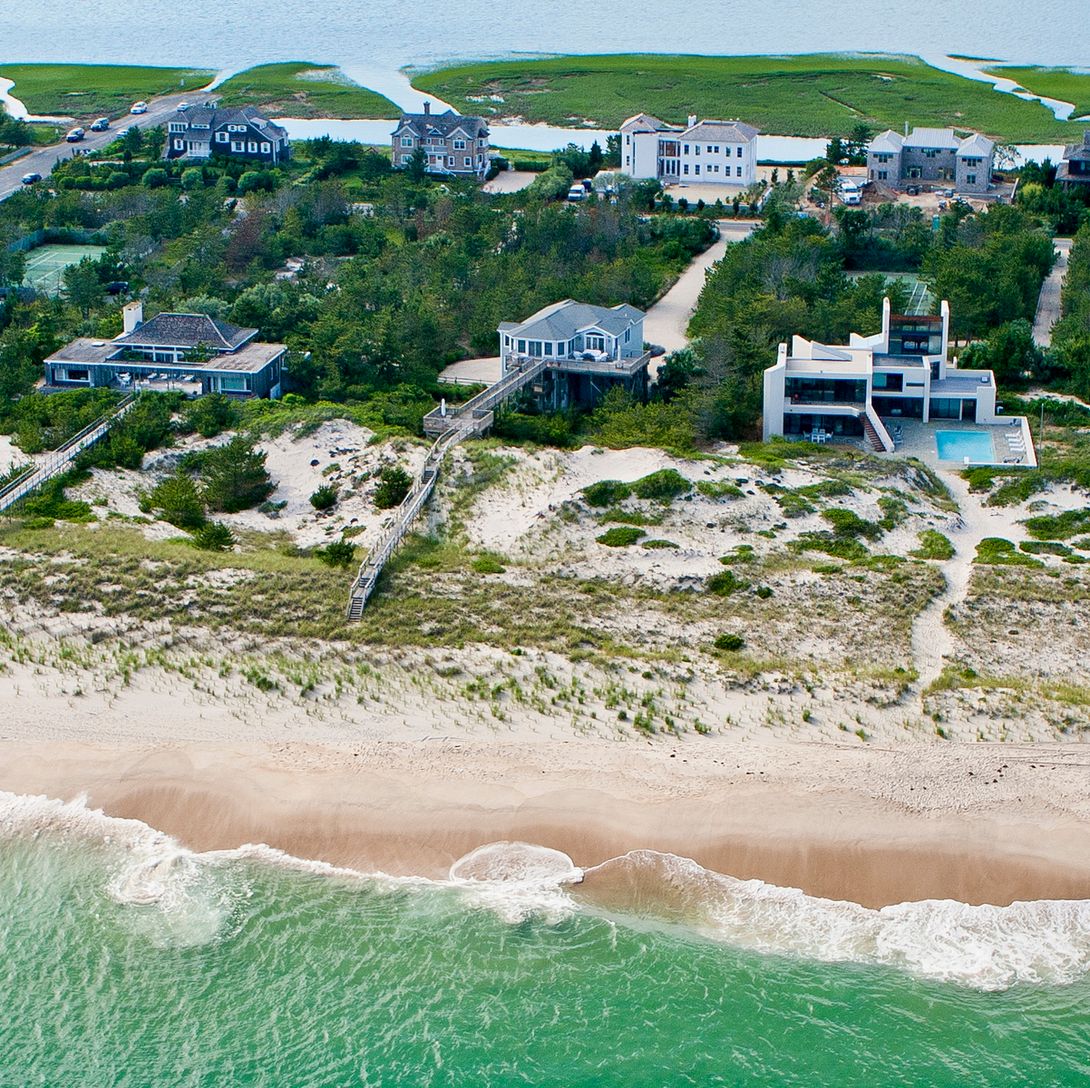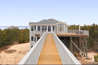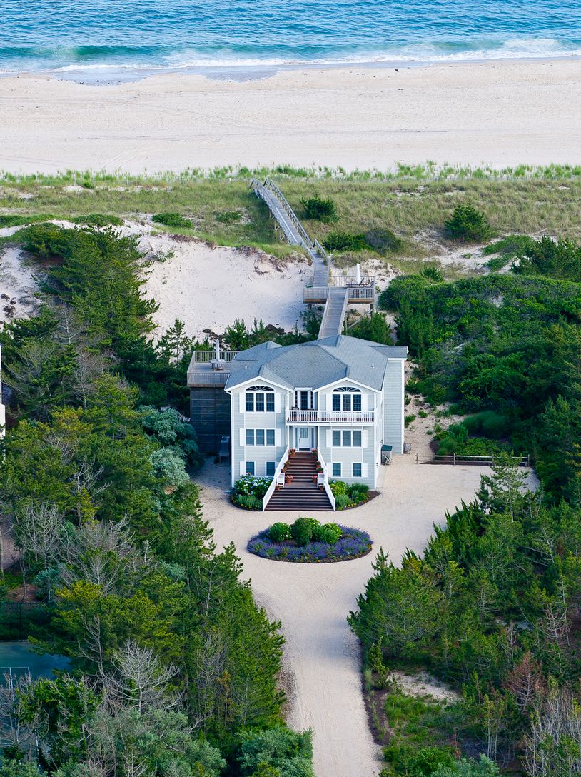 White sand, grassy dunes, and panoramic double views of the Atlantic Ocean and Shinnecock Bay compose the perfect backdrop for this estate on 2 +/- acres with 125 feet of direct beachfront. Beautifully-maintained, this 6000 s.f., three-level post-modern residence takes advantage of every water view and elevated prospect. A long drive leads to a wide stairway to the wainscoted main level, with four gracious guest suites and ocean-side sunroom.