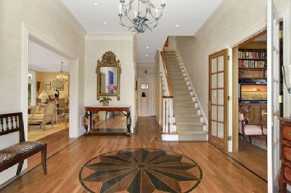 This 4900+/- sq. ft. stately end unit townhouse offers spacious living with 4 bedrooms, 4 full baths and one powder room, formal entry foyer, eat-in kitchen, library, and gym. The large open floor plan living and dining rooms are flanked on one side by a wall of glass doors bathing the rooms in natural light and leading to the generous stone patio with private garden and retractable awning. An elevator services all three floors and the lower
