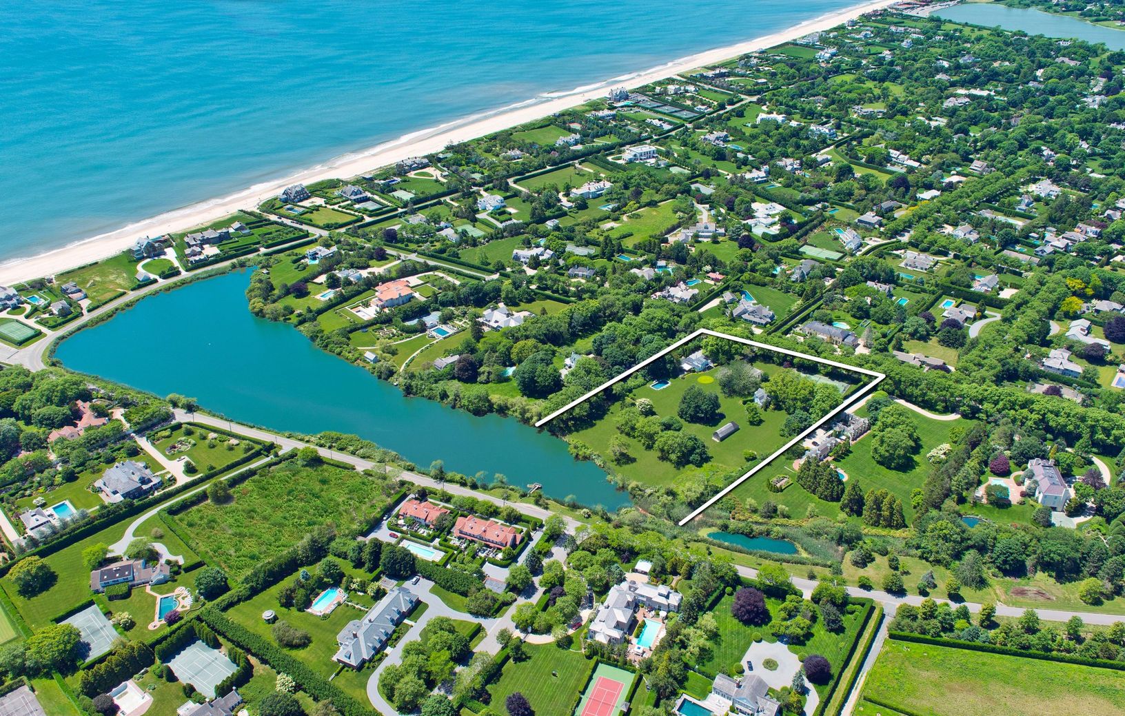 A remarkable estate on coveted, prestigious Wyandanch Lane with almost 400 feet of waterfront on Old Towne Pond offers five +/- acres of natural, unspoiled land in the heart of Southampton Village. One of the last of its kind, this family compound extends from Wyandanch Lane to Old Towne Road, and consists of four buildings, which includes a charming two-story gate house converted into a seven-room home, a barn renovated into a four-bedroom ho