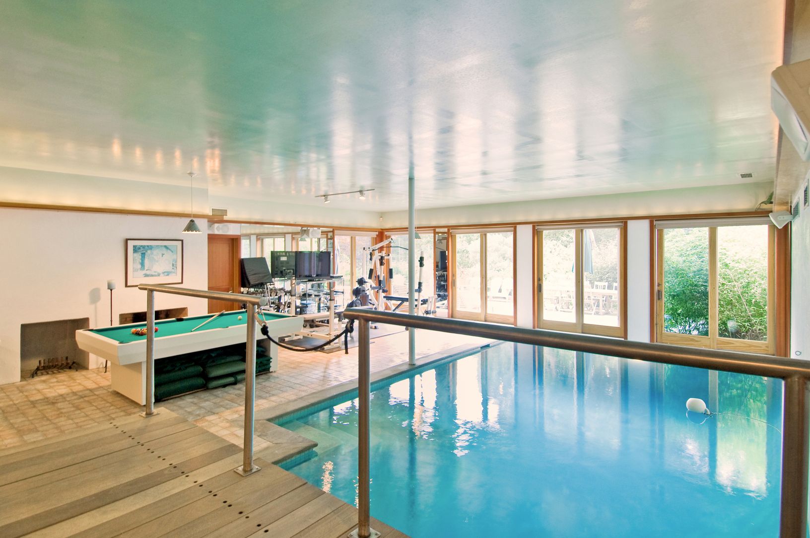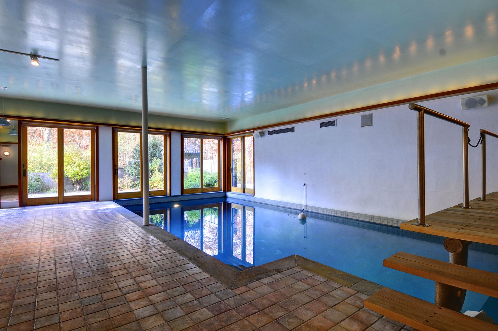 This noted architects own three story, 7 bedroom, 6.5 bath contemporary retreat situated on 4.80 acres has 8000 feet of great open spaces and fabulous amenities, The first floor master suite features a sitting room, two fireplace and a fabulous bath with unique touches. There is a gourmet kitchen and separate formal dining area with fireplace. The lower level features an indoor pool, sauna, and rec room with access to a large terrace and fabul