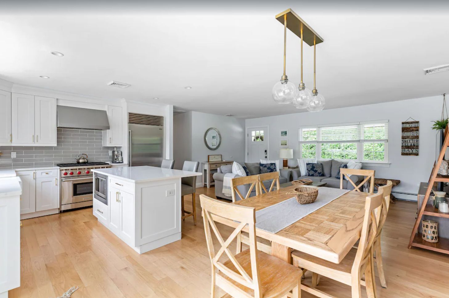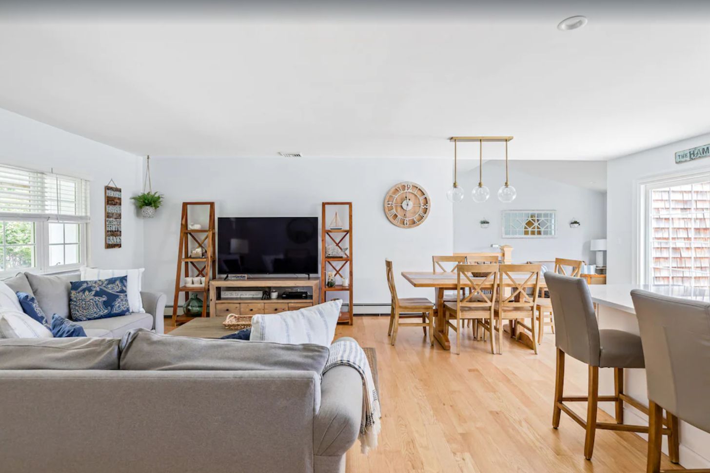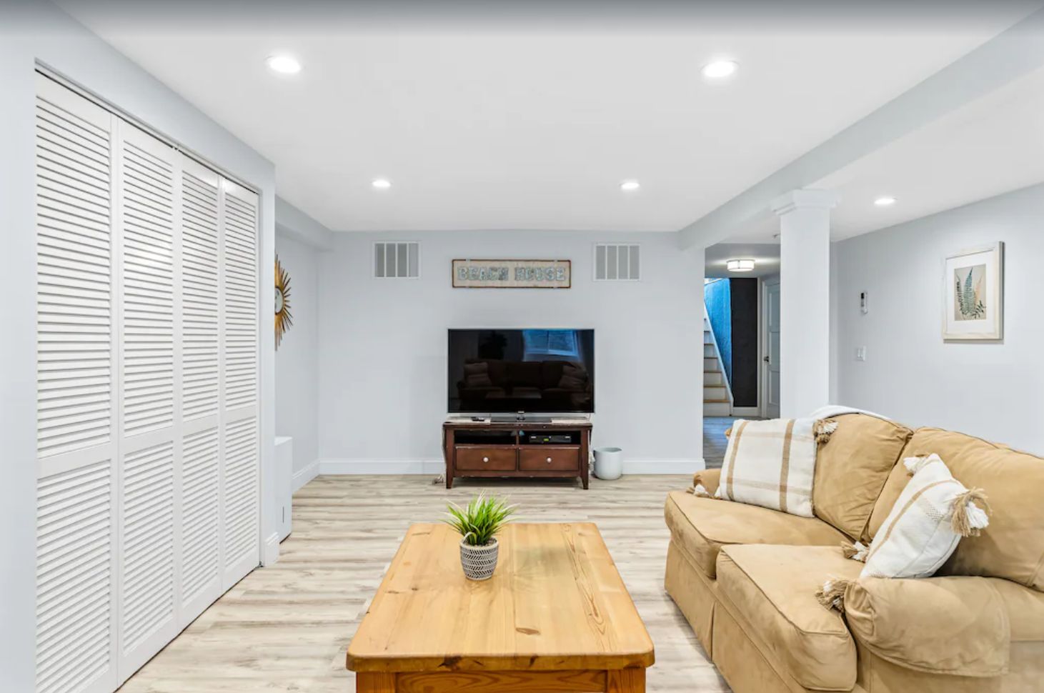 Newly Renovated with Four Bedrooms, Two Full Baths and a finished basement with ample room for all. Living room with flat screen tv open to the kitchen. All designer appliances in the kitchen (6 burner Wolff stove, subzero refrigerator), with an island. The kitchen offers plenty of room for cooking. The kitchen is fully stocked with Calphalon cookware and a Weber grill on the deck outside. Bonus Den with flat screen tv and extra seating.