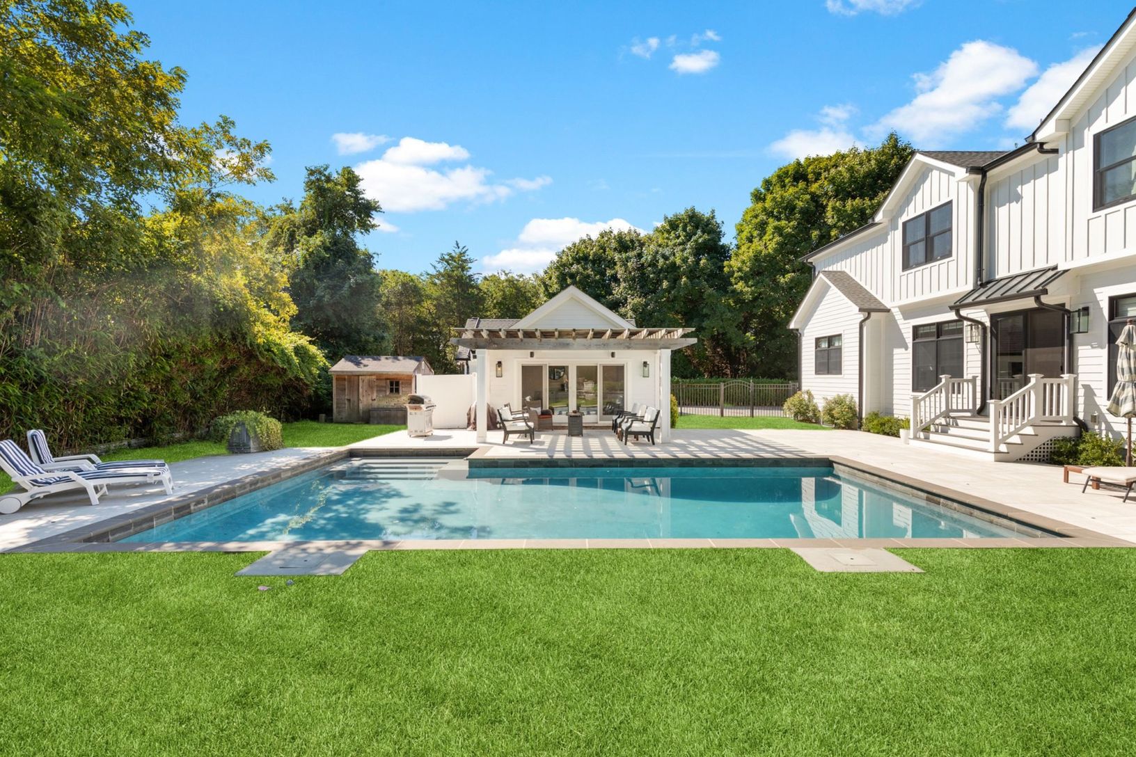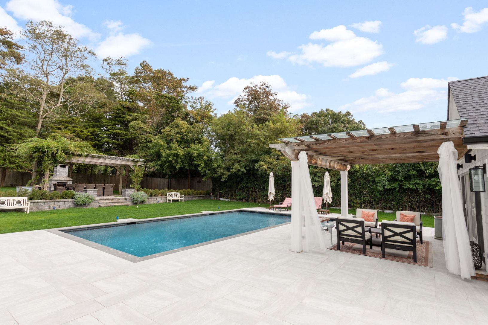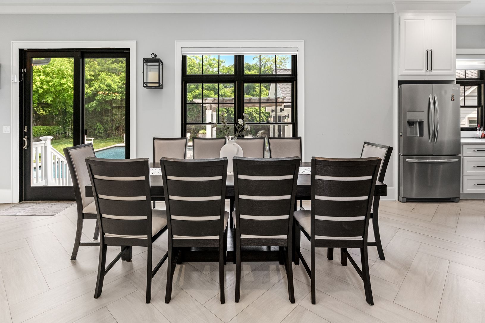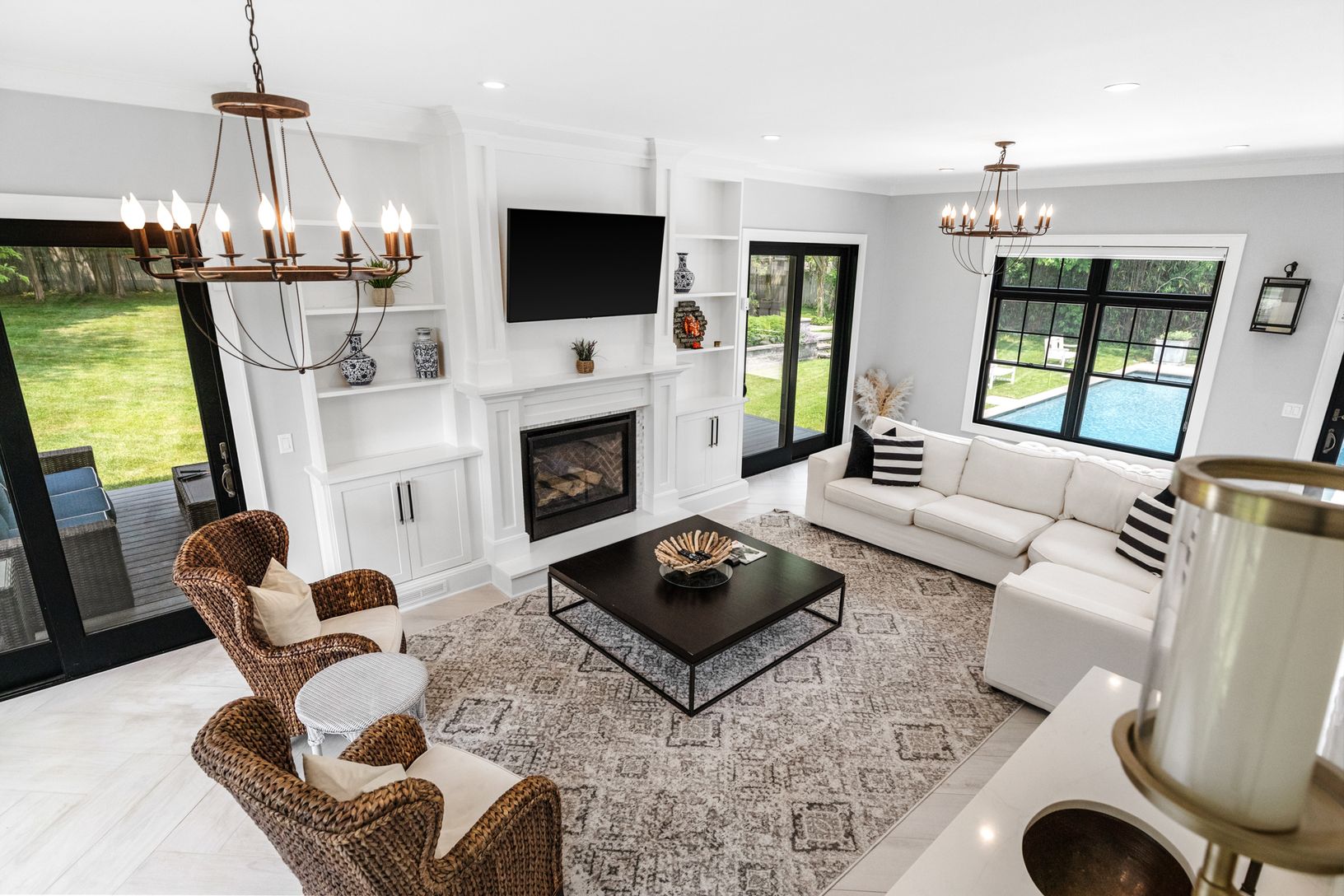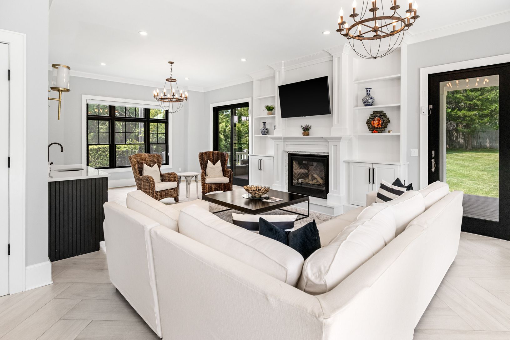 Experience elevated Hamptons living in this impeccable new construction featuring 7 bedrooms and 6 bathrooms across three beautifully finished levels. Designed with a modern open layout, the main floor flows seamlessly from a state-of-the-art gourmet kitchen to a spacious dining area and a sunlit living room anchored by a sleek fireplace. Expansive black-framed windows and three sets of sliding glass doors flood the space with natural light an