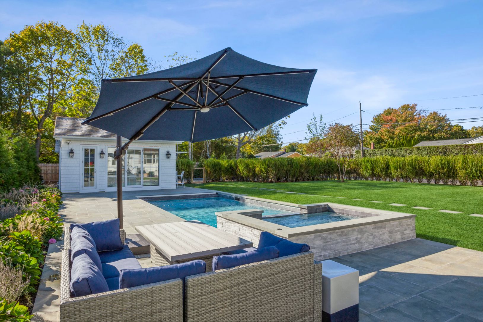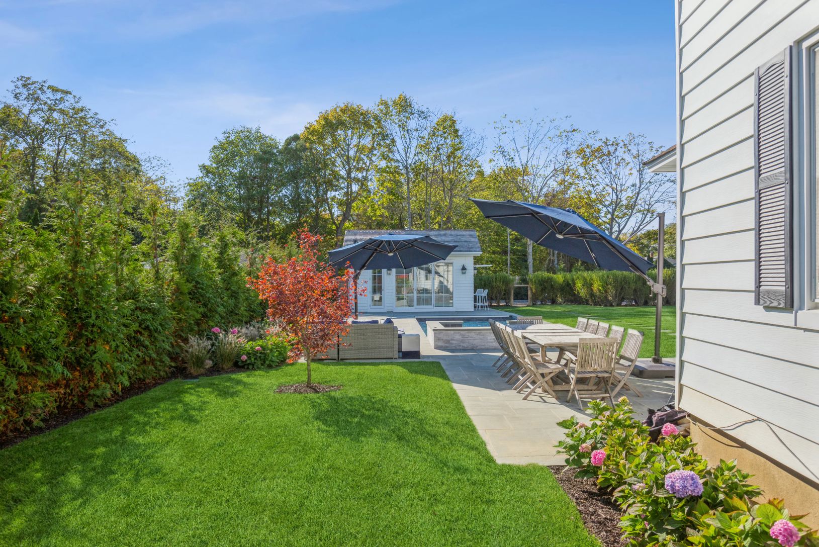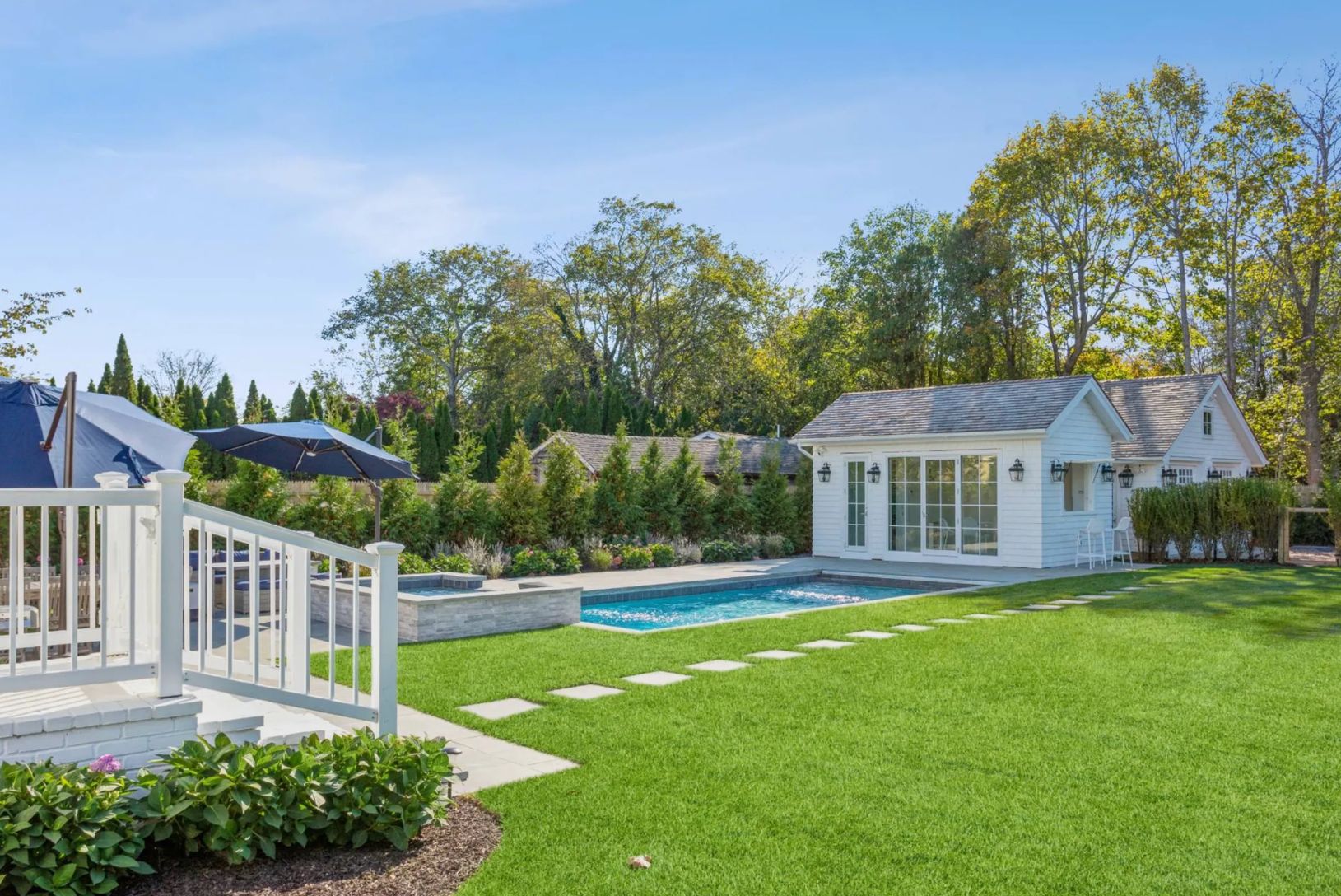 Beautiful Southampton getaway ideally situated in the village, moments from renowned shops, restaurants, ocean beaches, and local markets. Enjoy resort-style living at home with a spectacular outdoor entertaining space featuring a pool, BBQ area, and an exceptional pool house complete with kitchenette, wet bar, 65” television, and a third full bathroom. Newly planted lush landscaping creates a private backyard oasis. This newly and tastefully