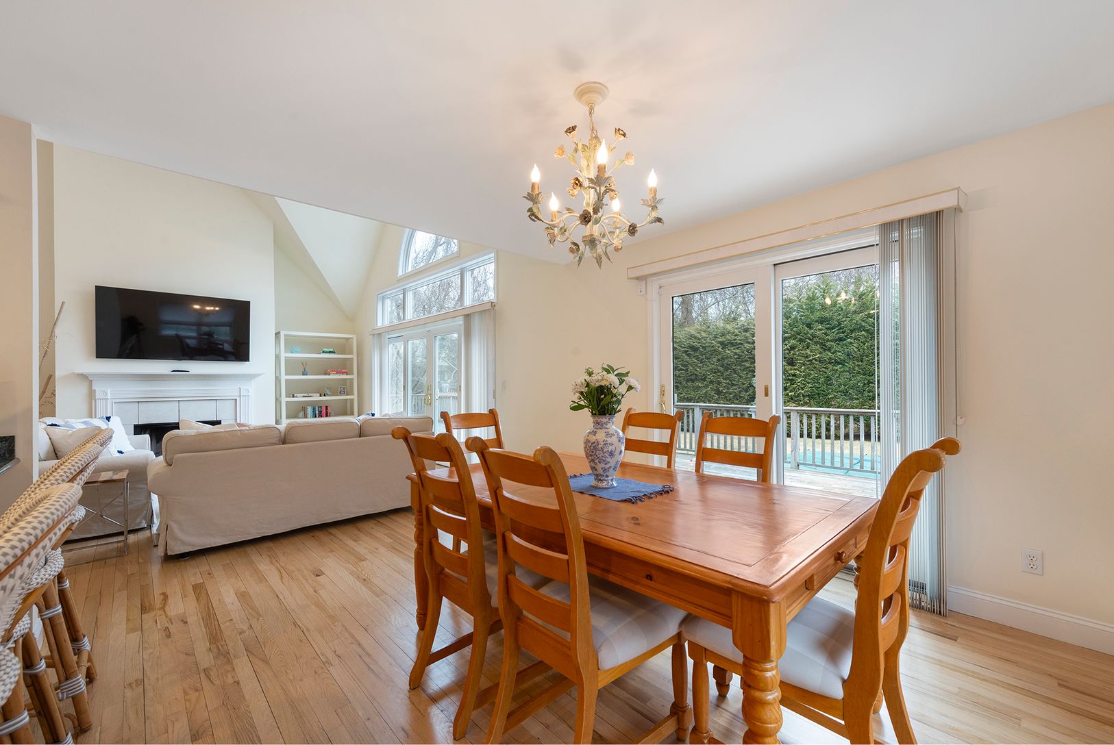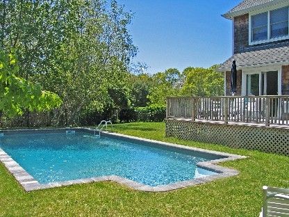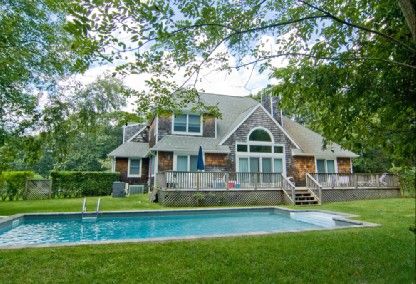 This handsome post modern residence is privately secluded on an acre of landscaped grounds. Features include an open floor plan, light-filled living room with fireplace and double-height ceiling, dining area, and bright eat-in kitchen. There are four bedrooms (including first-floor master suite) and three baths. Additional amenities include central air-conditioning, two-car garage, outdoor deck, and a heated pool. Located minutes out of Sout