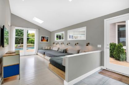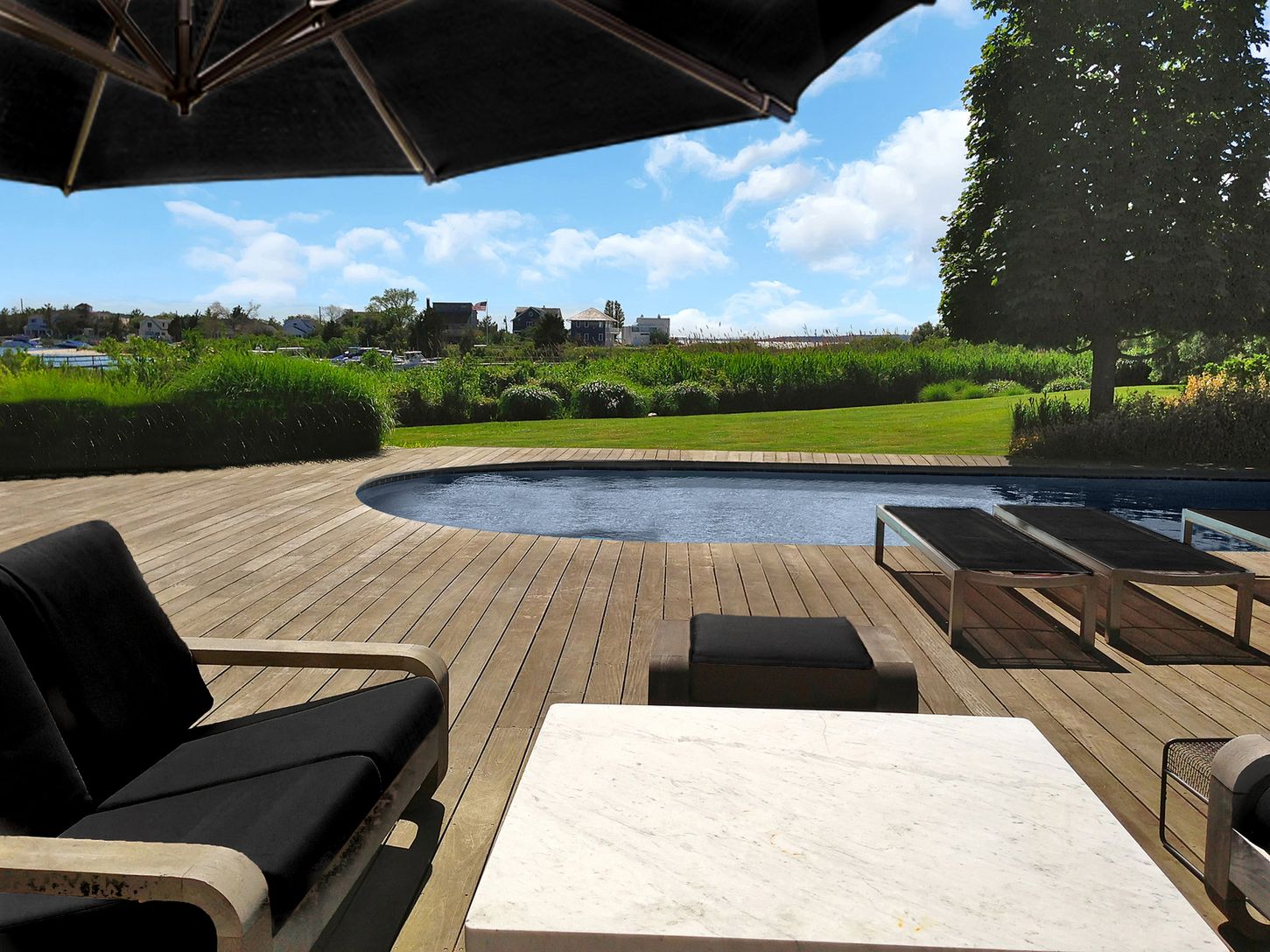 Newly Renovated 3100+- s.f. Southampton waterfront home on almost 2 acres of beautifully landscaped open view bayfront property. Secluded and gated this 4-bedroom 4-bath Modern house designed by Peter Cook has a heated gunite pool and a private boat dock on the bay. This unique property has 3 separate structures. The main house has three bedrooms and 3 baths, a gorgeous great room to gather and enjoy the amazing view and a newly renovated chef
