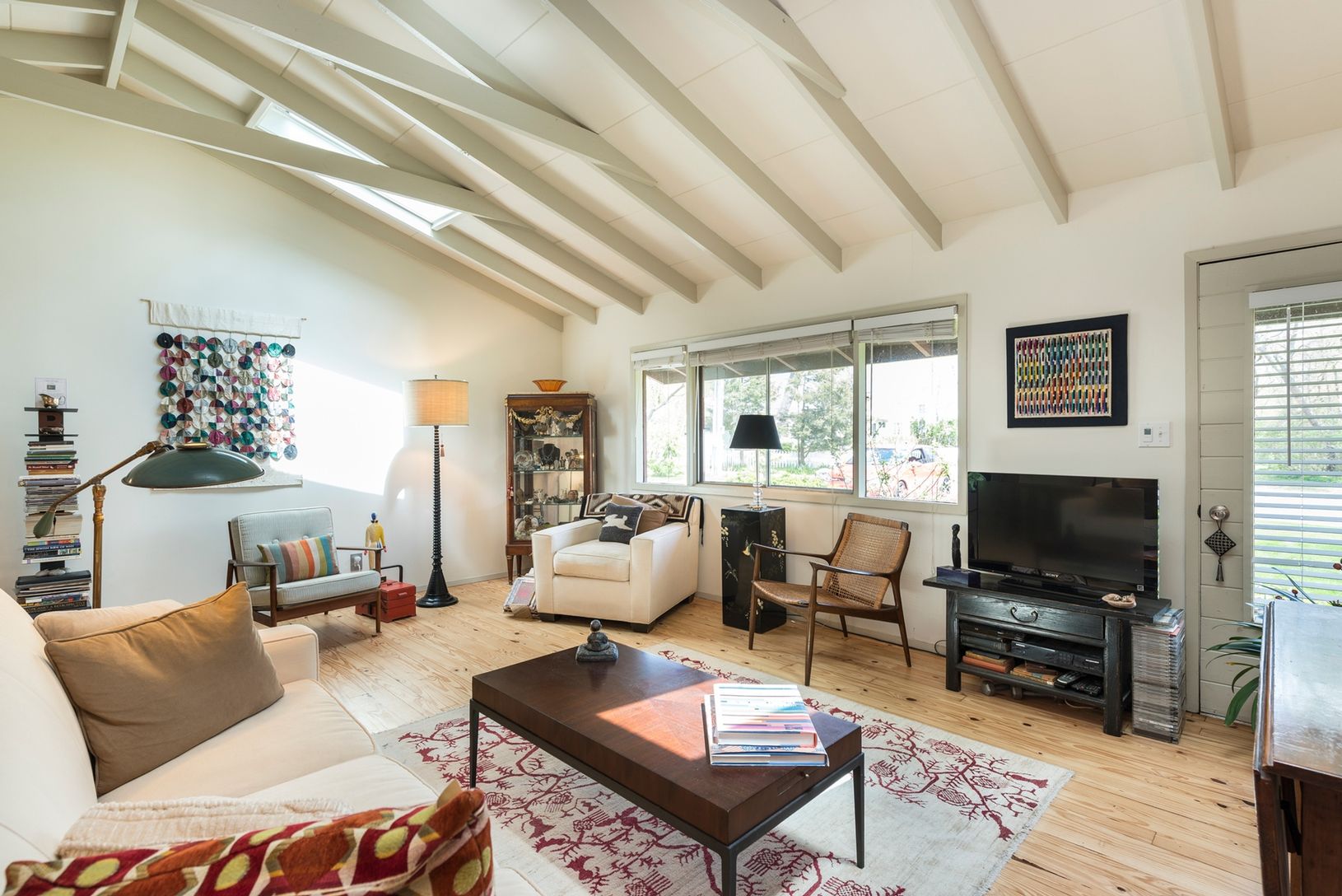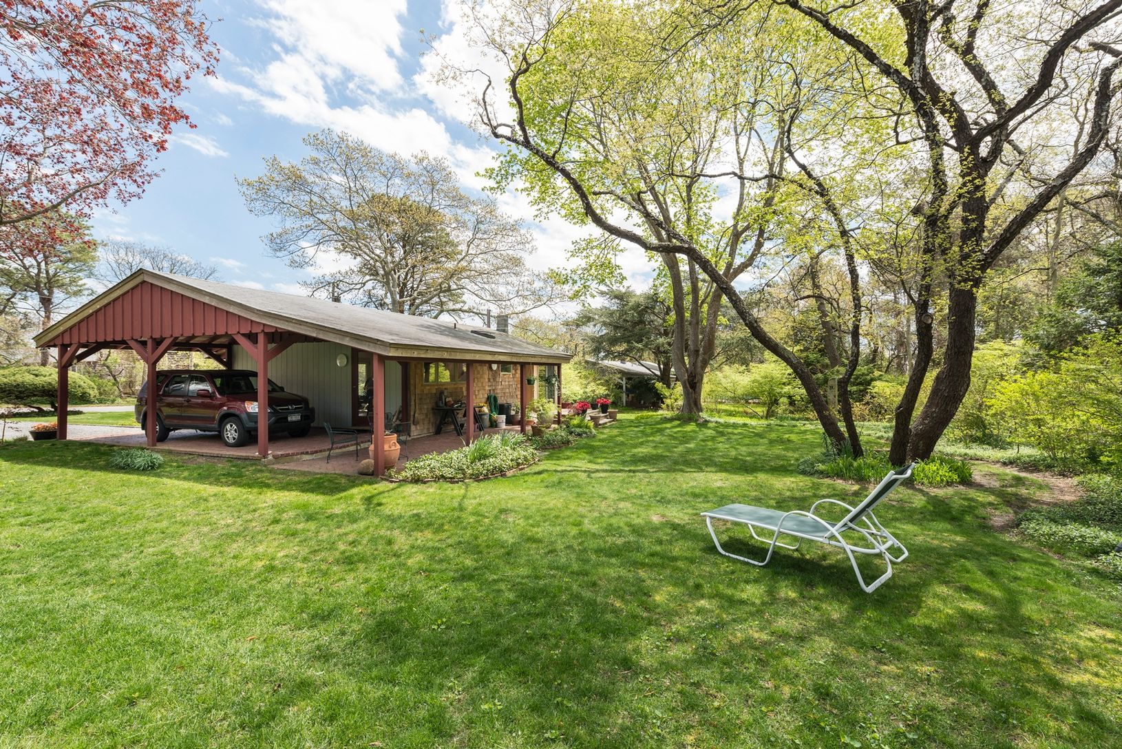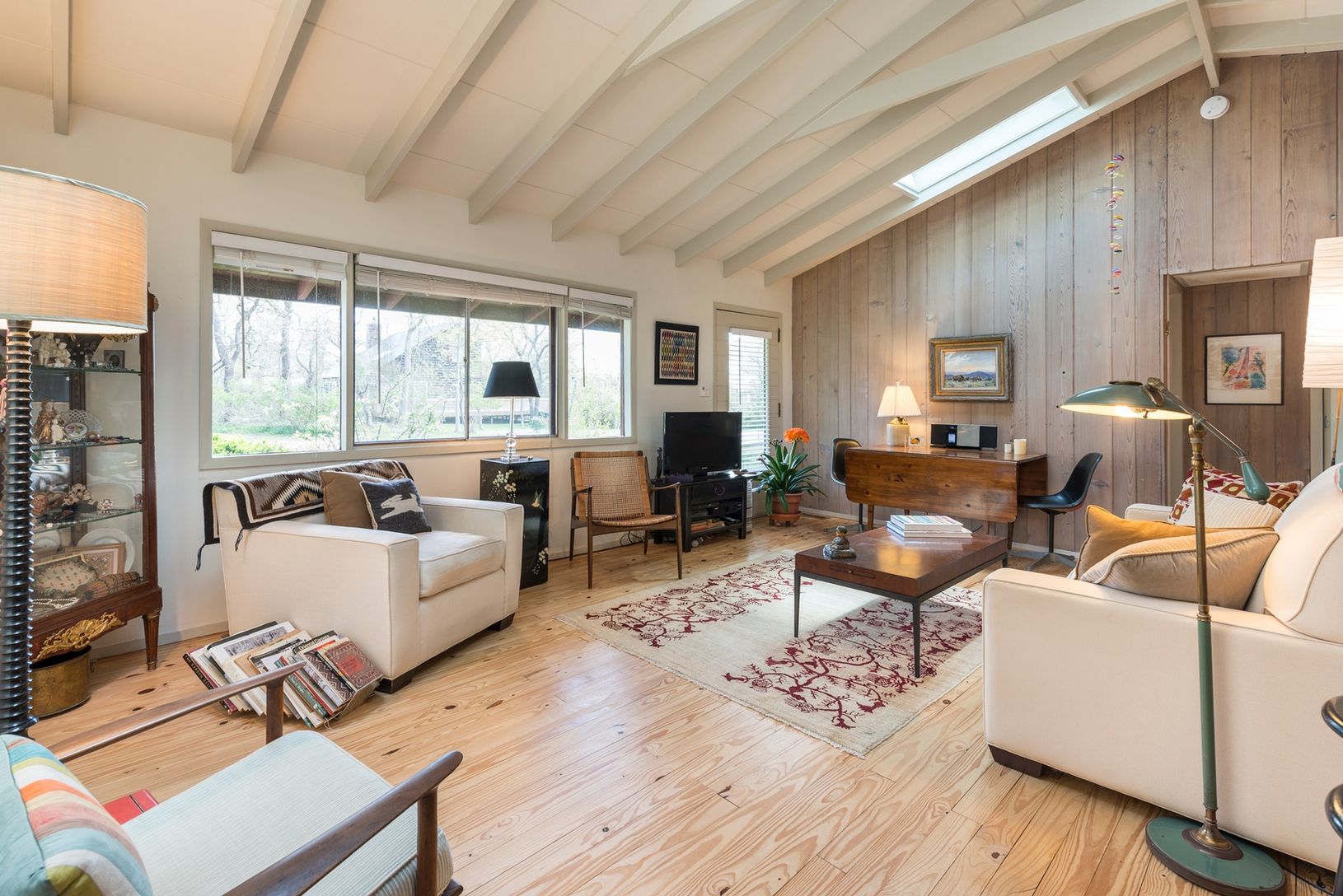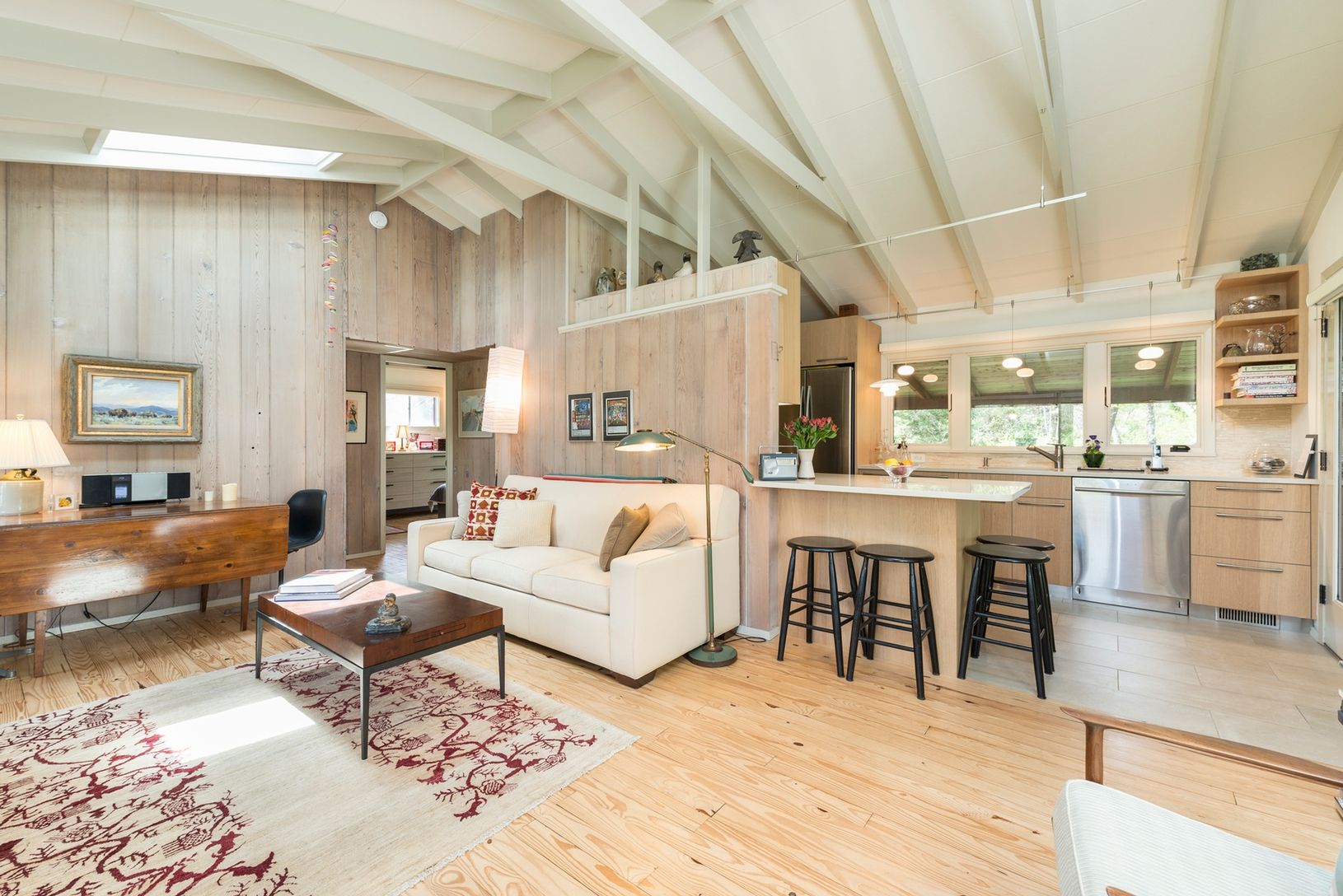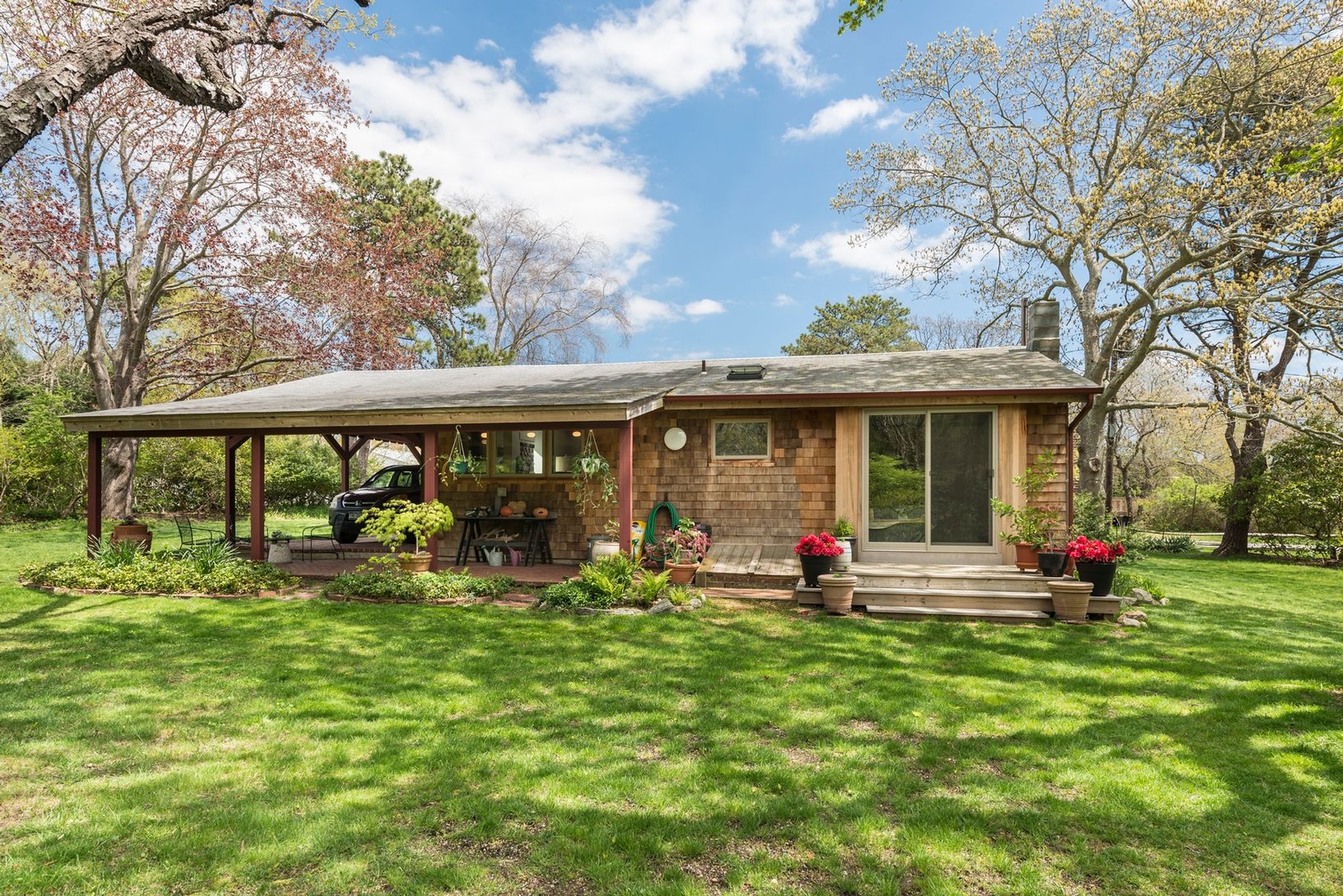 This Shinnecock Hills cedar shake ranch, designed and built by a Scandinavian architect has two-bedrooms, and one bath. The large living room features knotty pine walls, hard wood floors, and a beamed cathedral ceiling. The eat-in kitchen is new, extremely comfortable and fully equipped. The home is internet and cable ready. The house has central A/C and heat, and provides a washer, dryer, dishwasherand outdoor charcoal Weber grill. The love