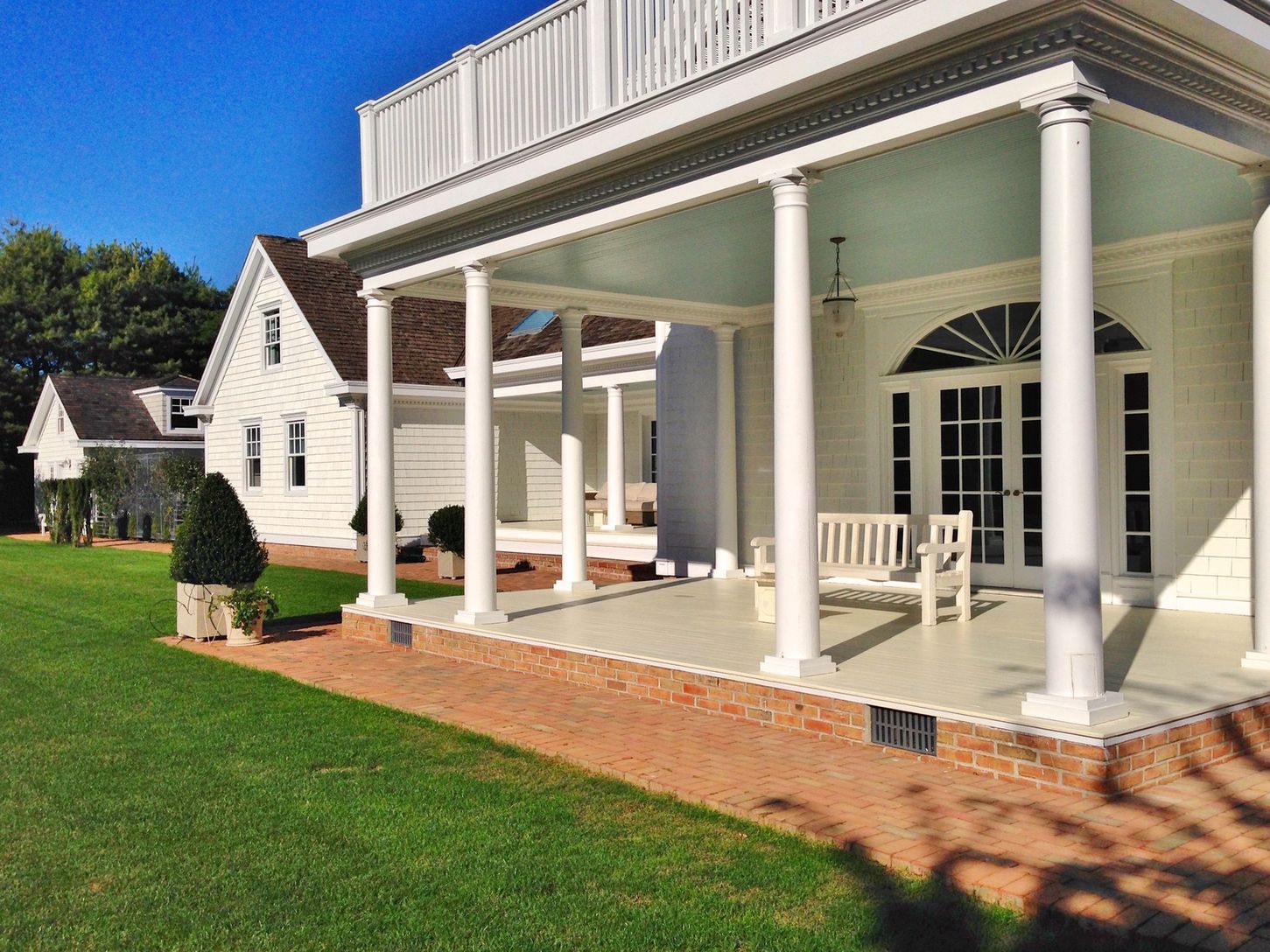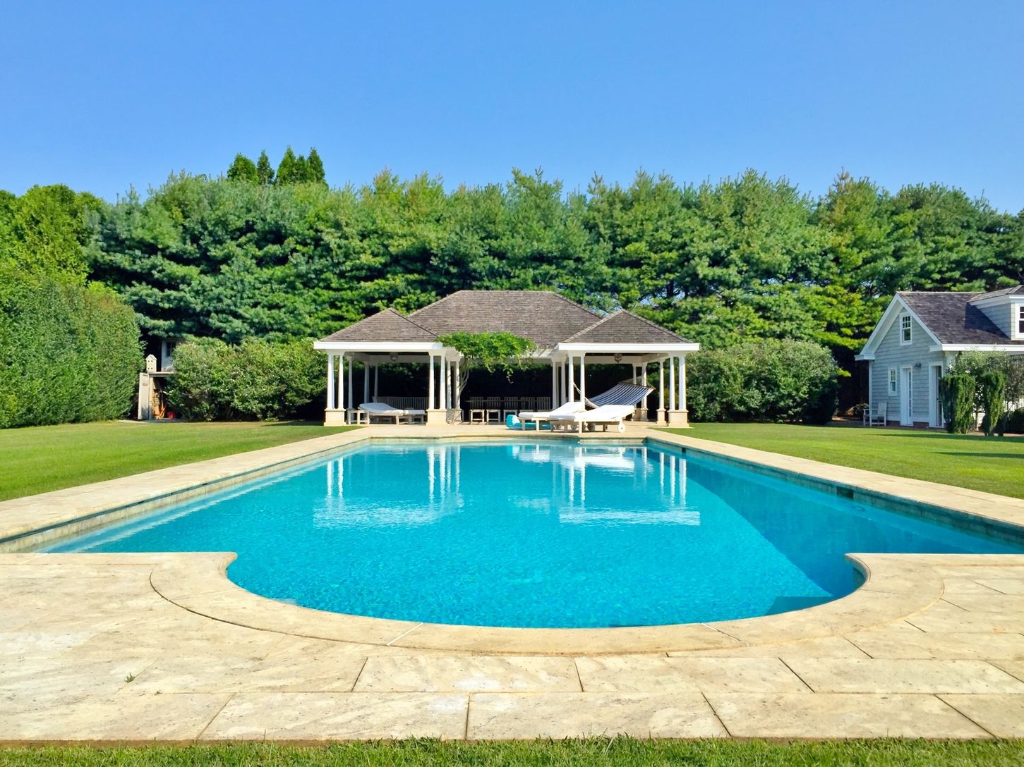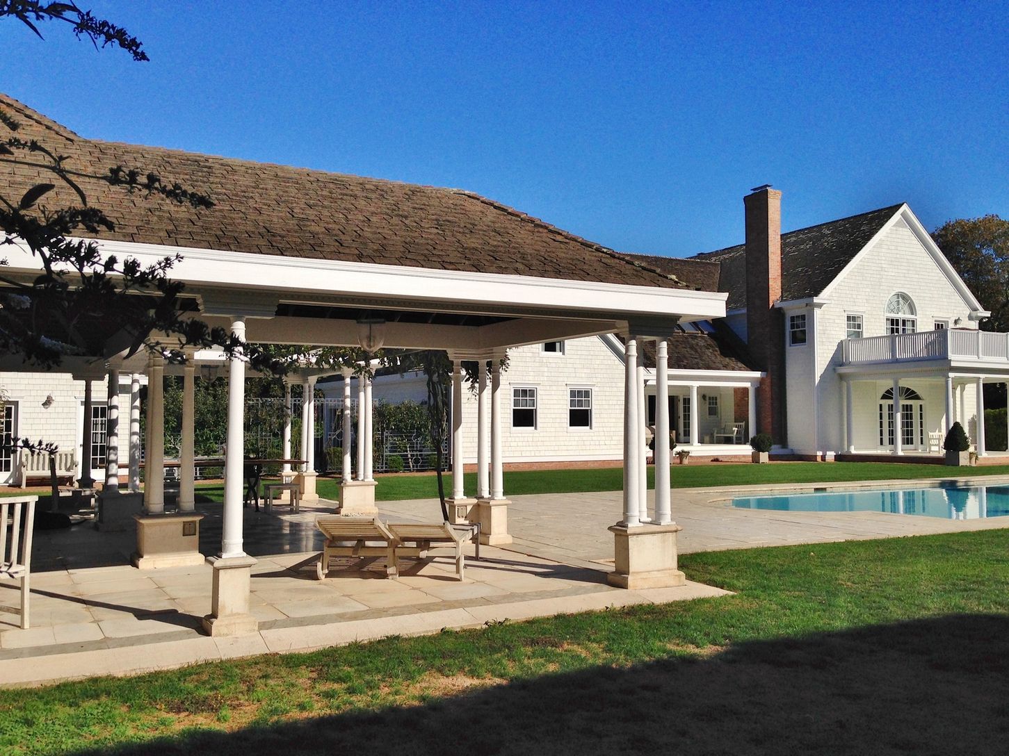 Large gracious home perfectly situated a block from the ocean and very close to the village. Sunny generous rooms, including Large Living room with doors to the porch and lawn, formal dining room, library, eight bedrooms, six bathrooms, two powder rooms, large gourmet cook's kitchen with informal dining and opening onto long porch, a billiards room and a soundproof professional movie theater; Spacious pool house furnished for dining, lounging