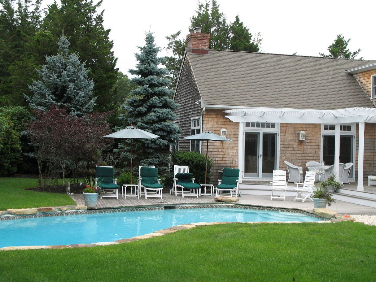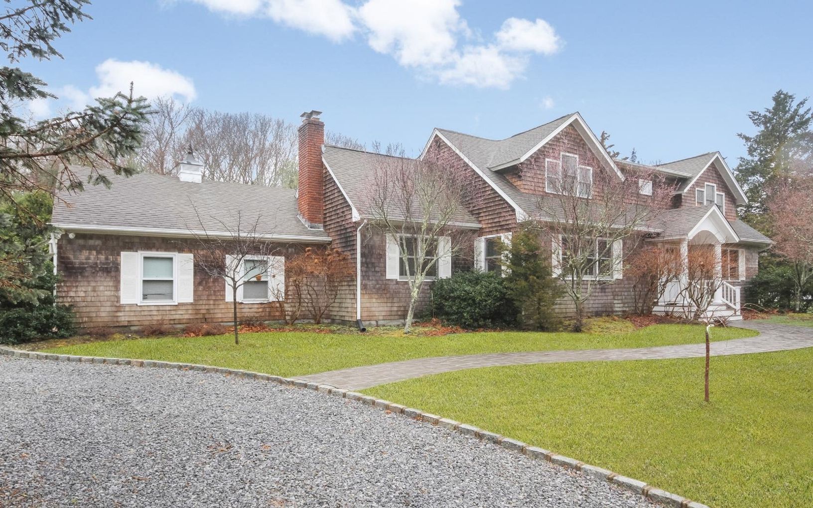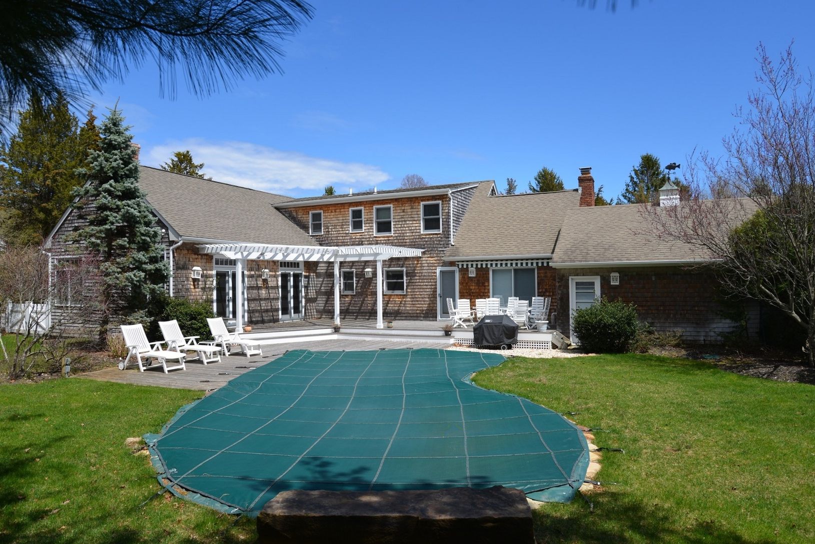 Southampton. This is the perfect gathering home for both friends and family. There is a large cathedral light filled great room with fireplace, wet bar with ice maker and refrigerator with French doors leading to a lovely free form heated gunite pool. The second living room is a cathedral room with fireplace off the kitchen and an oversized dining room. There is one large bedroom on the first floor, den/office and three bedrooms and two bat