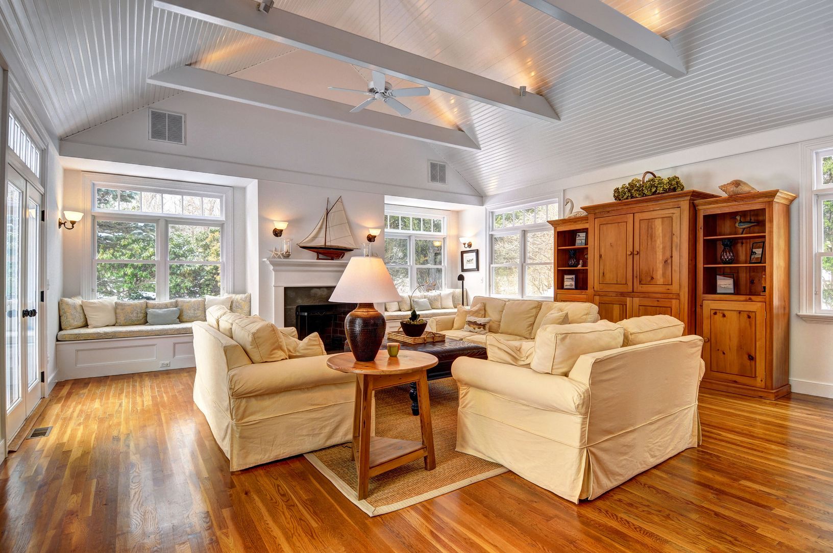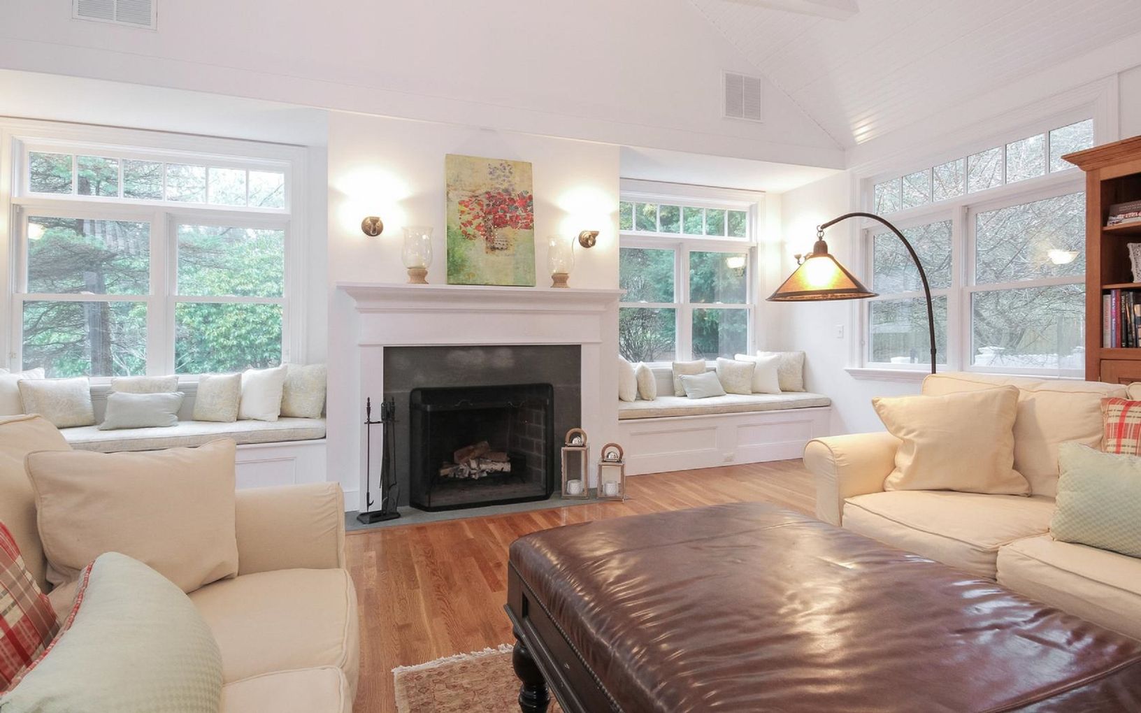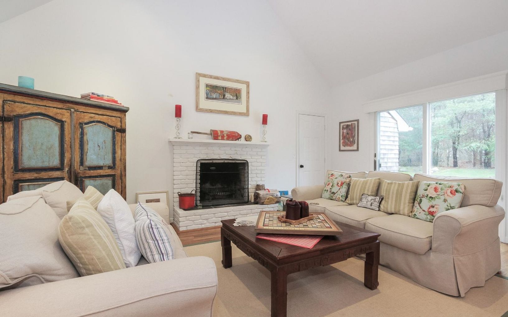 Southampton. This is the perfect gathering home for both friends and family. There is a large cathedral light filled great room with fireplace, wet bar with ice maker and refrigerator with French doors leading to a lovely free form heated gunite pool. The second living room is a cathedral room with fireplace off the kitchen and an oversized dining room. There is one large bedroom on the first floor, den/office and three bedrooms and two bat