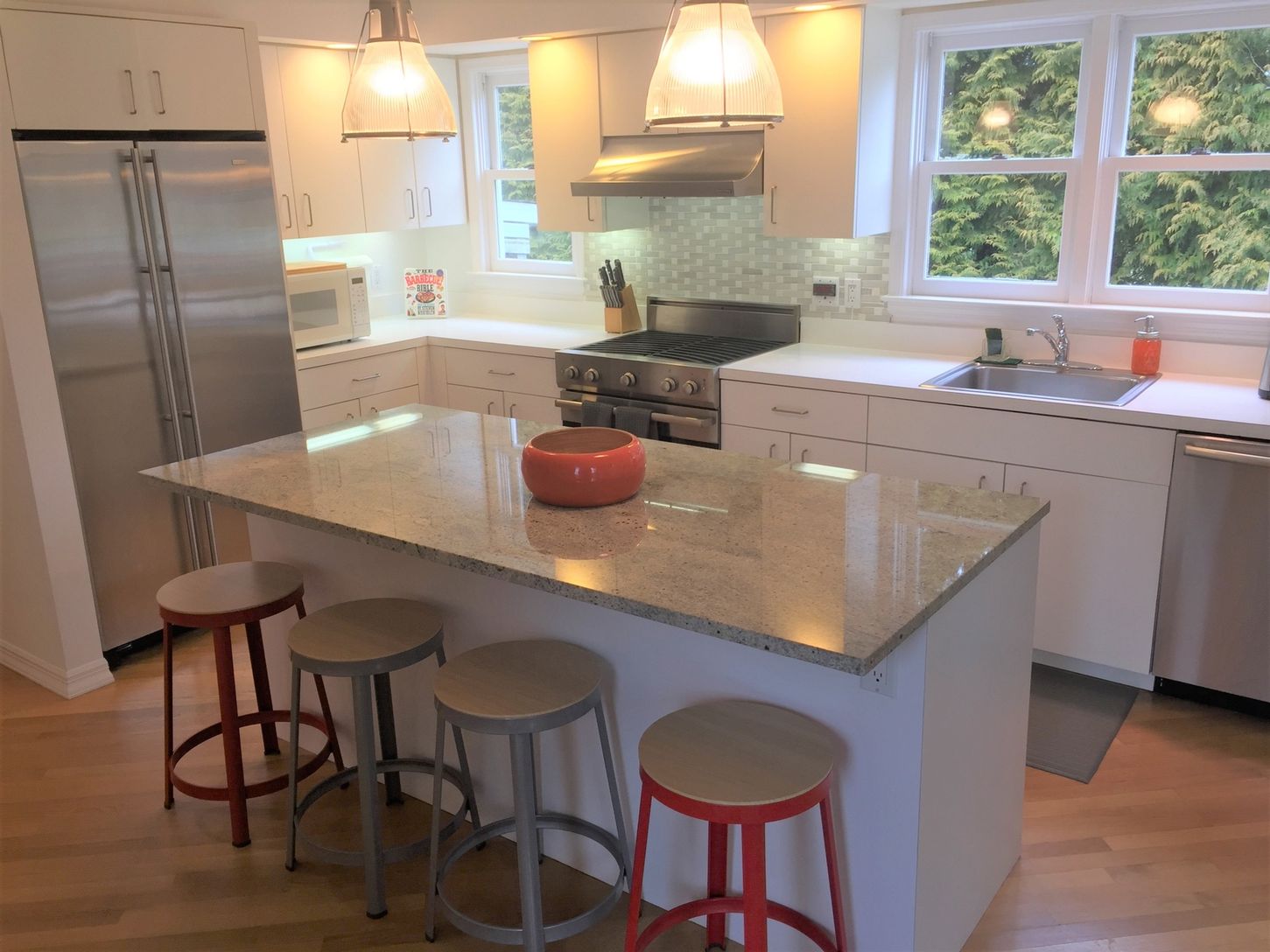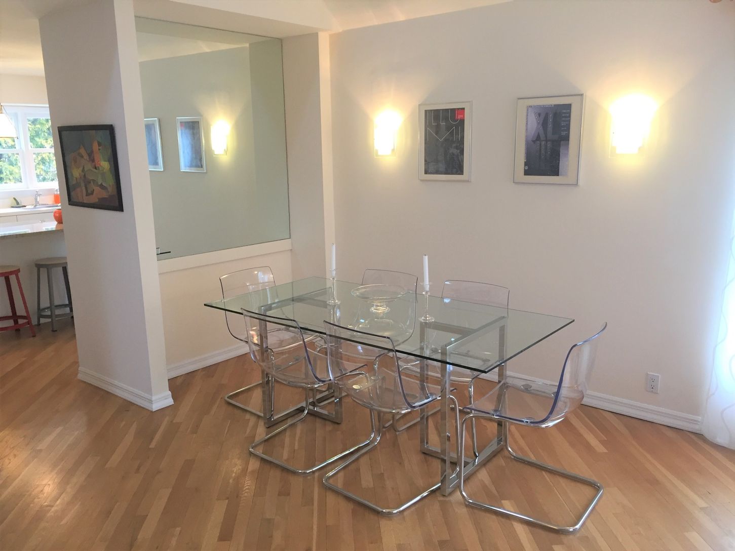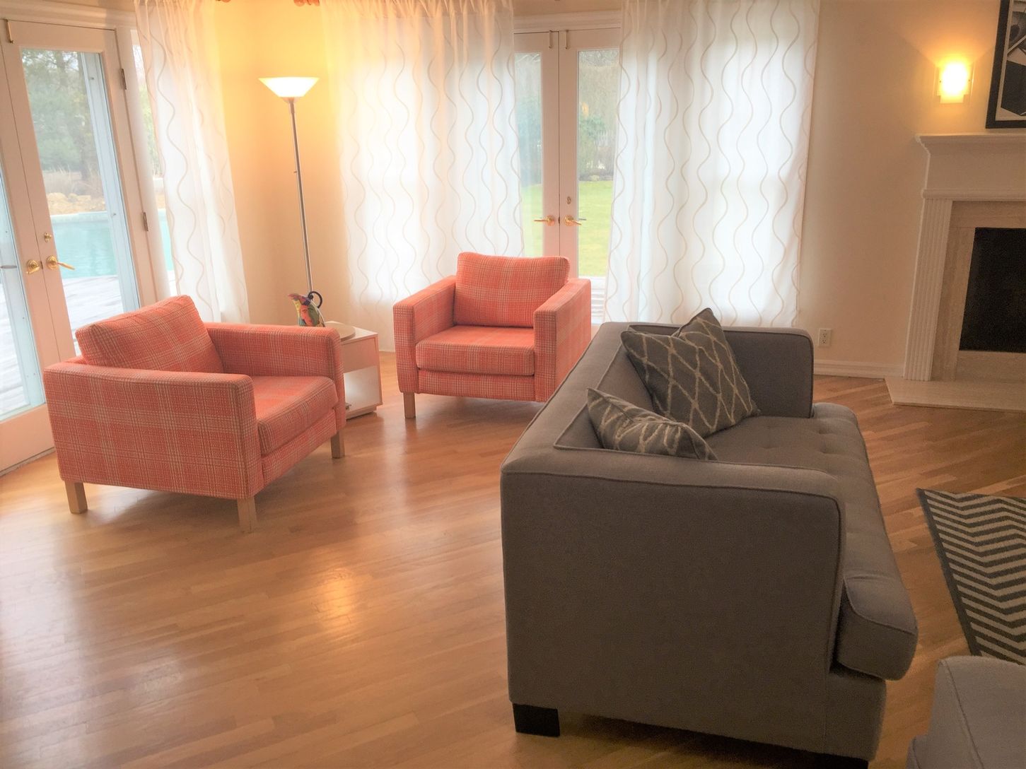 Light filled modern house. The large open space with fireplace is reminiscent of loft living with living and dining room in an open floor plan. Granite and stainless kitchen has an island with stools and a computer desk. Two bedrooms and one bath on the main floor with the master suite above. There is a covered lanai over the deck in view of the lush property. Available July @ $25,000