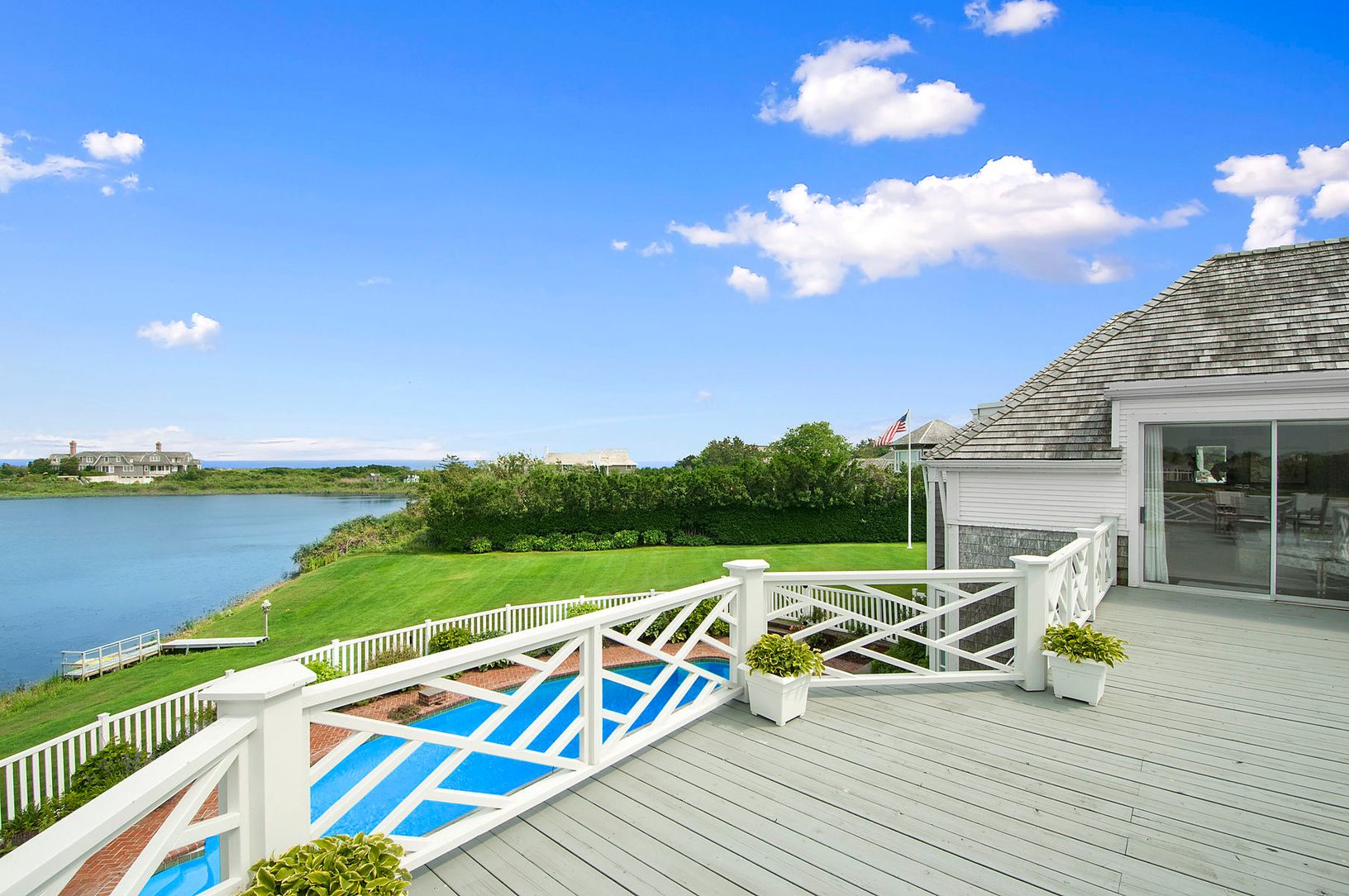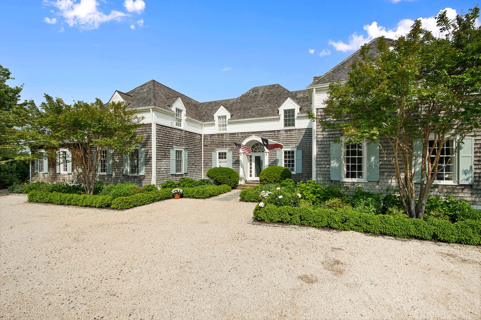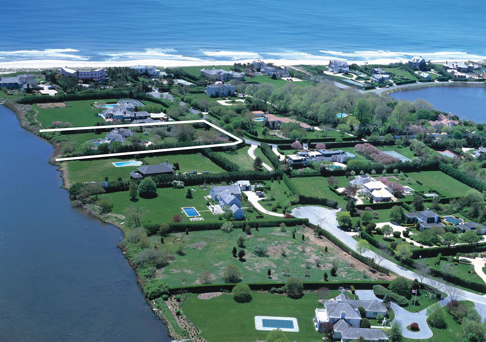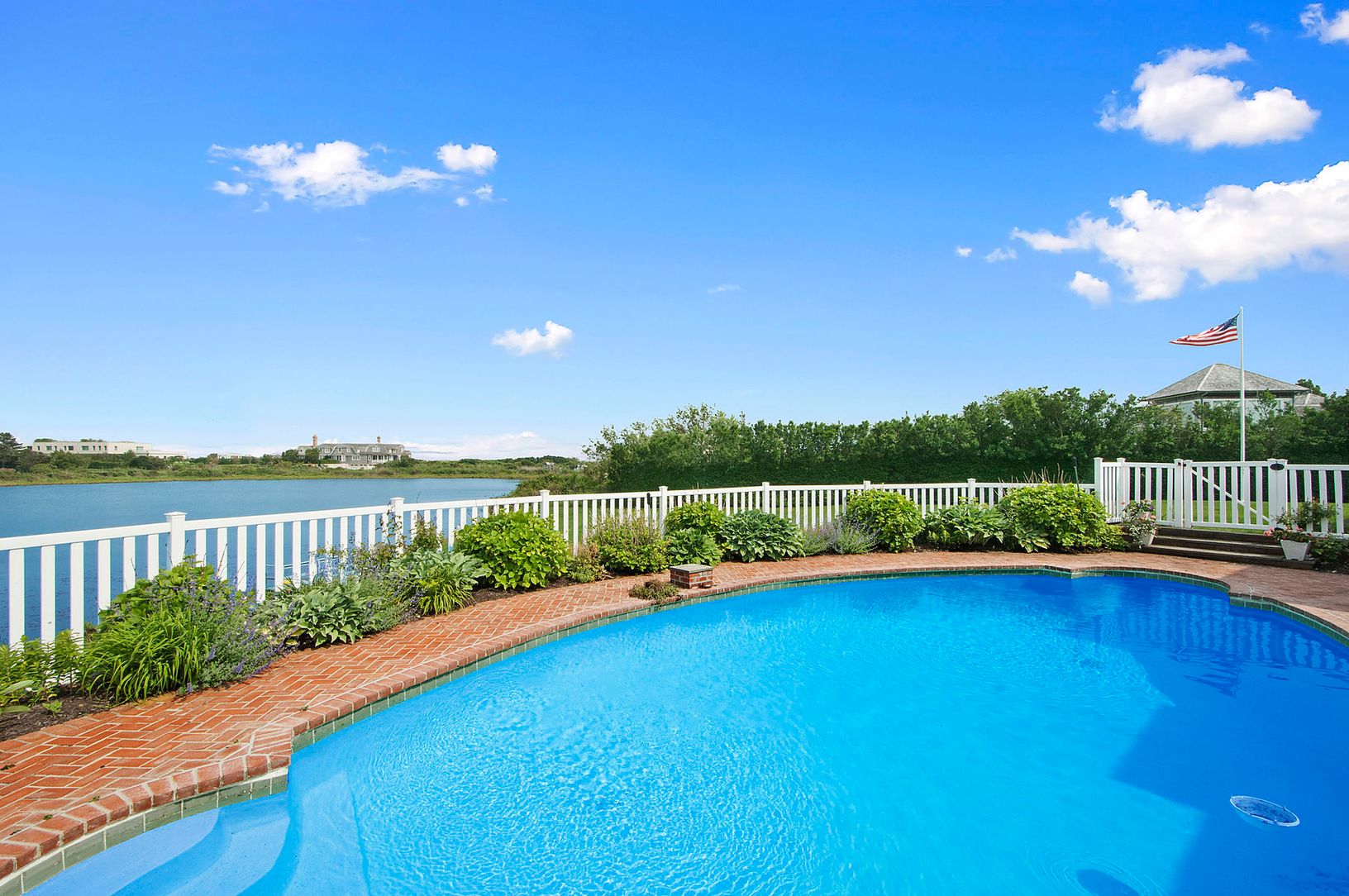 A long private drive leads to this elegant Southampton residence, situated on beautifully landscaped 2-acre pondfront property. The house is exceptionally-appointed and beautifully decorated with features that include a living room with fireplace, den with fireplace, dining room, kitchen, seven bedrooms, and seven and one-half-baths. A swimming pool with water views surrounded by brick patio overlooks the landscaped yard and gardens. The prope