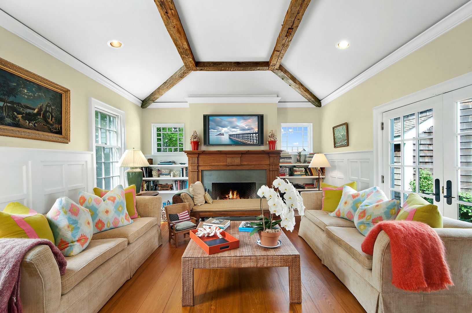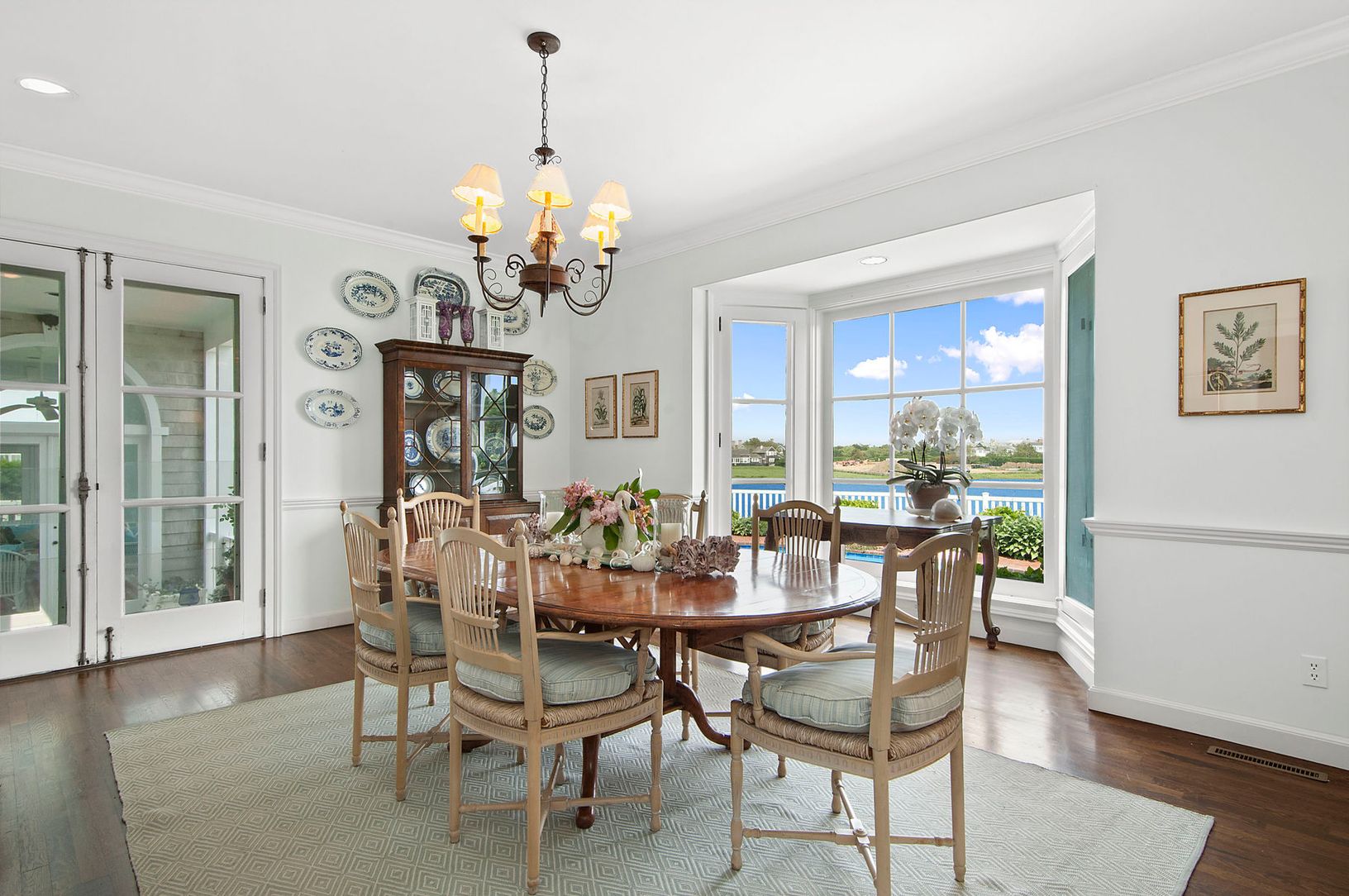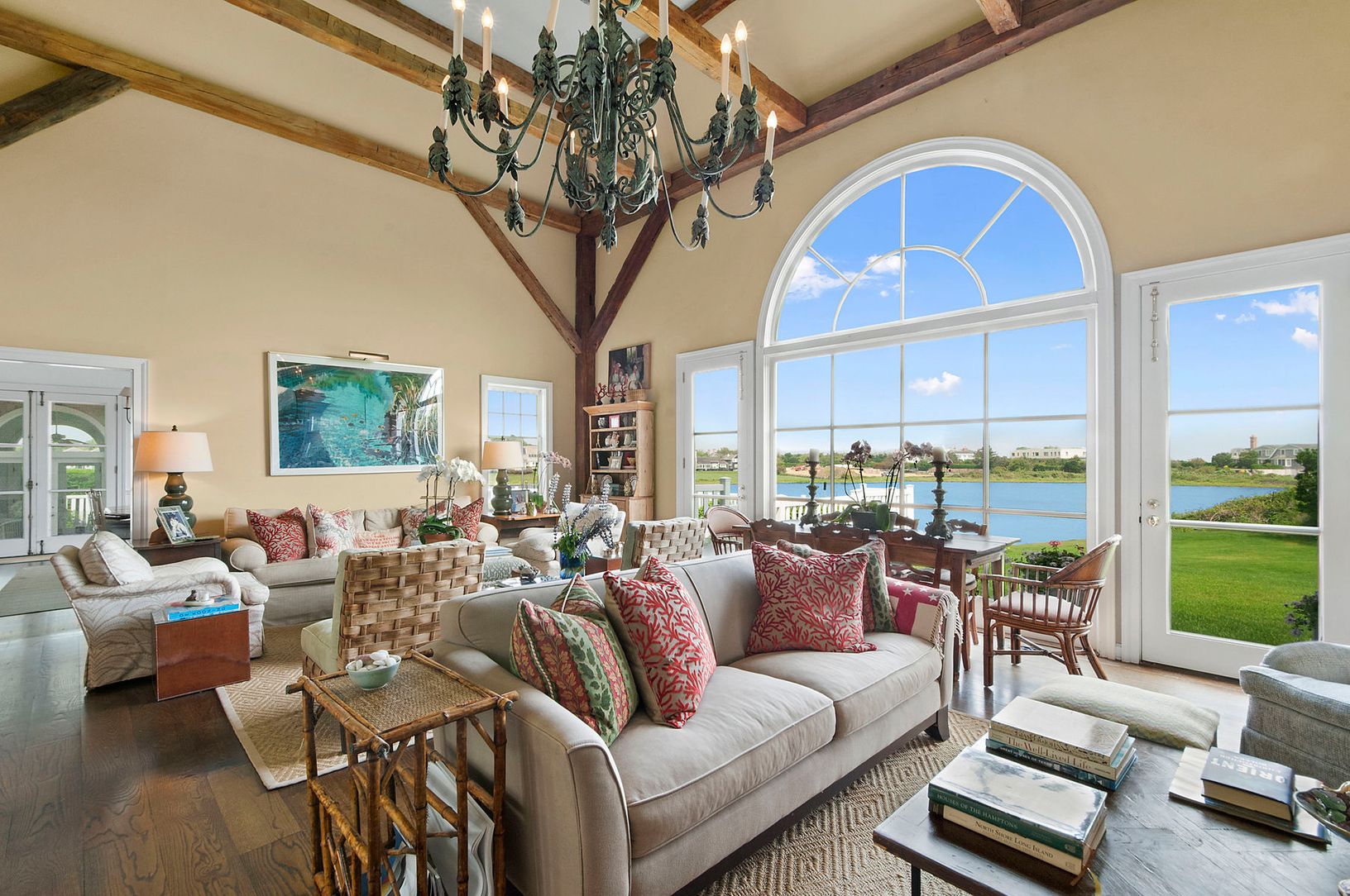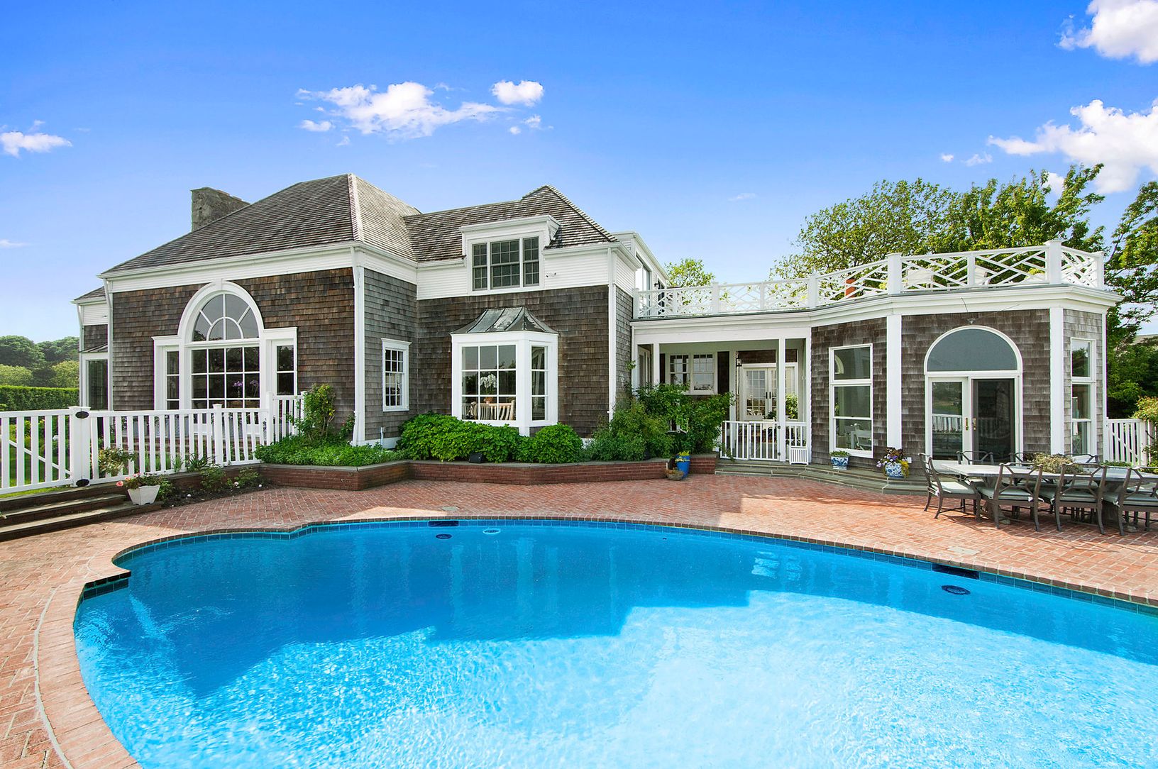 A long private drive leads to this elegant Southampton residence, situated on beautifully landscaped 2-acre pondfront property. The house is exceptionally-appointed and beautifully decorated with features that include a living room with fireplace, den with fireplace, dining room, kitchen, seven bedrooms, and seven and one-half-baths. A swimming pool with water views surrounded by brick patio overlooks the landscaped yard and gardens. The prope