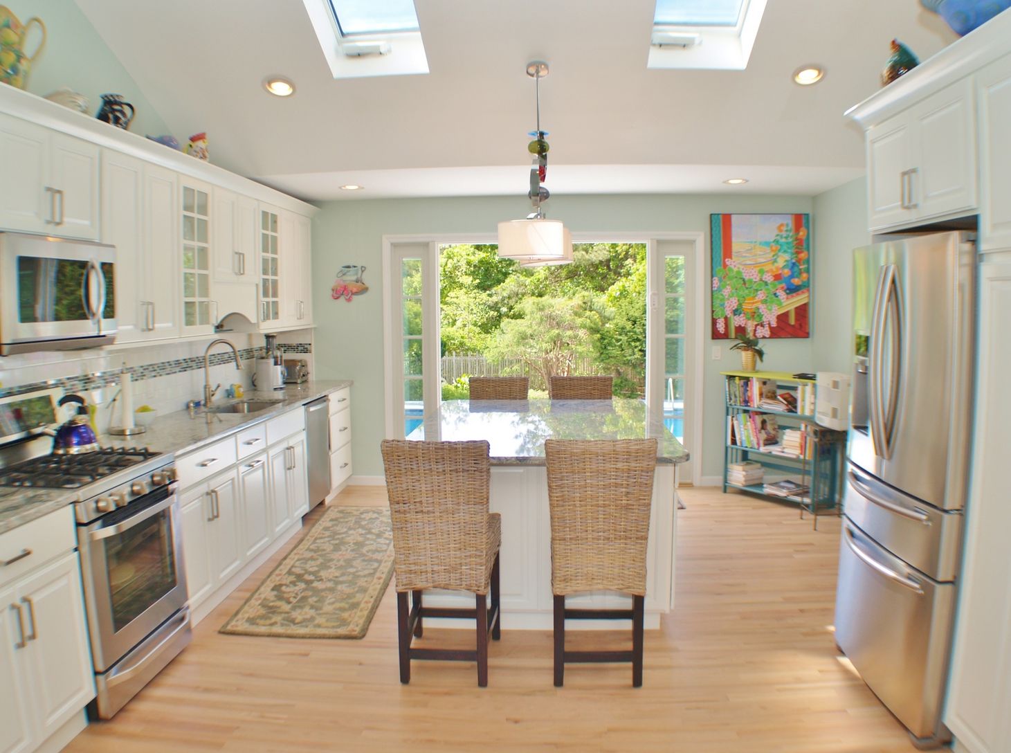 Welcome to this wonderful beach style adorable and completely renovated home with exquisite, high-end taste. House featuring two master suites, two guest rooms and three baths! The living room with fireplace is field up with natural light through remote-controlled skylights. All the rooms are professionally decorated, the back of the house it opens to a spectacular, gourmet, eat-in kitchen with granite island and counter tops. Beautiful French