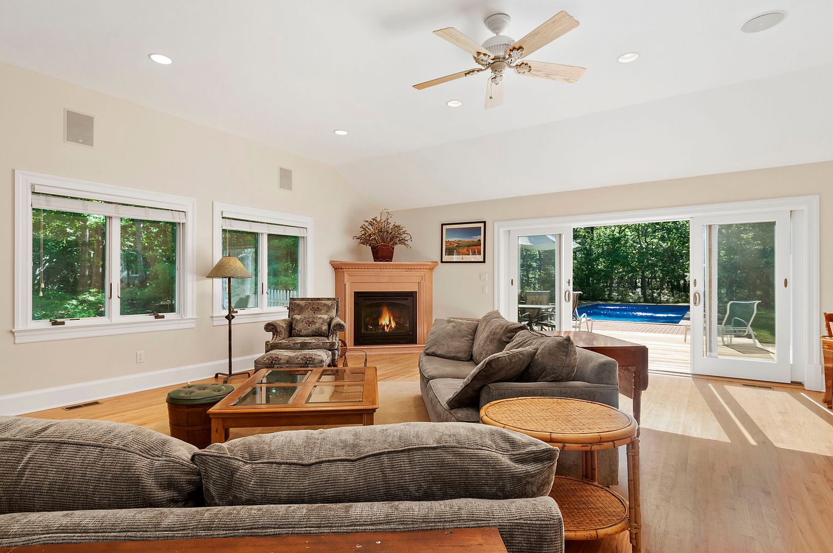 Totally renovated '06. 4 bedrooms, 4 baths, heated pool. Vaulted ceilings. Open floor plan, large kitchen/dining area with beautiful brick fireplace; large, vented insulated skylights. Gourmet kitchen with Silestone countertops, top-of-the-line stainless steel appliances, central heat/A/C, central vac, alarm system, Andersen casement windows, Andersen sliding doors, recessed lighting, ceiling fans in all rooms. The house is also wired for so