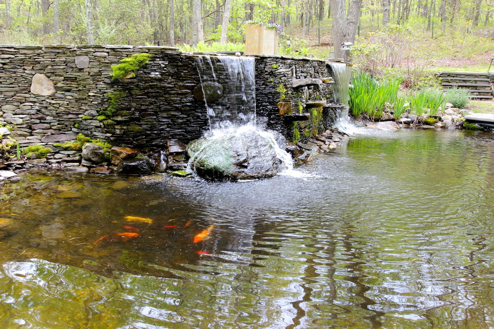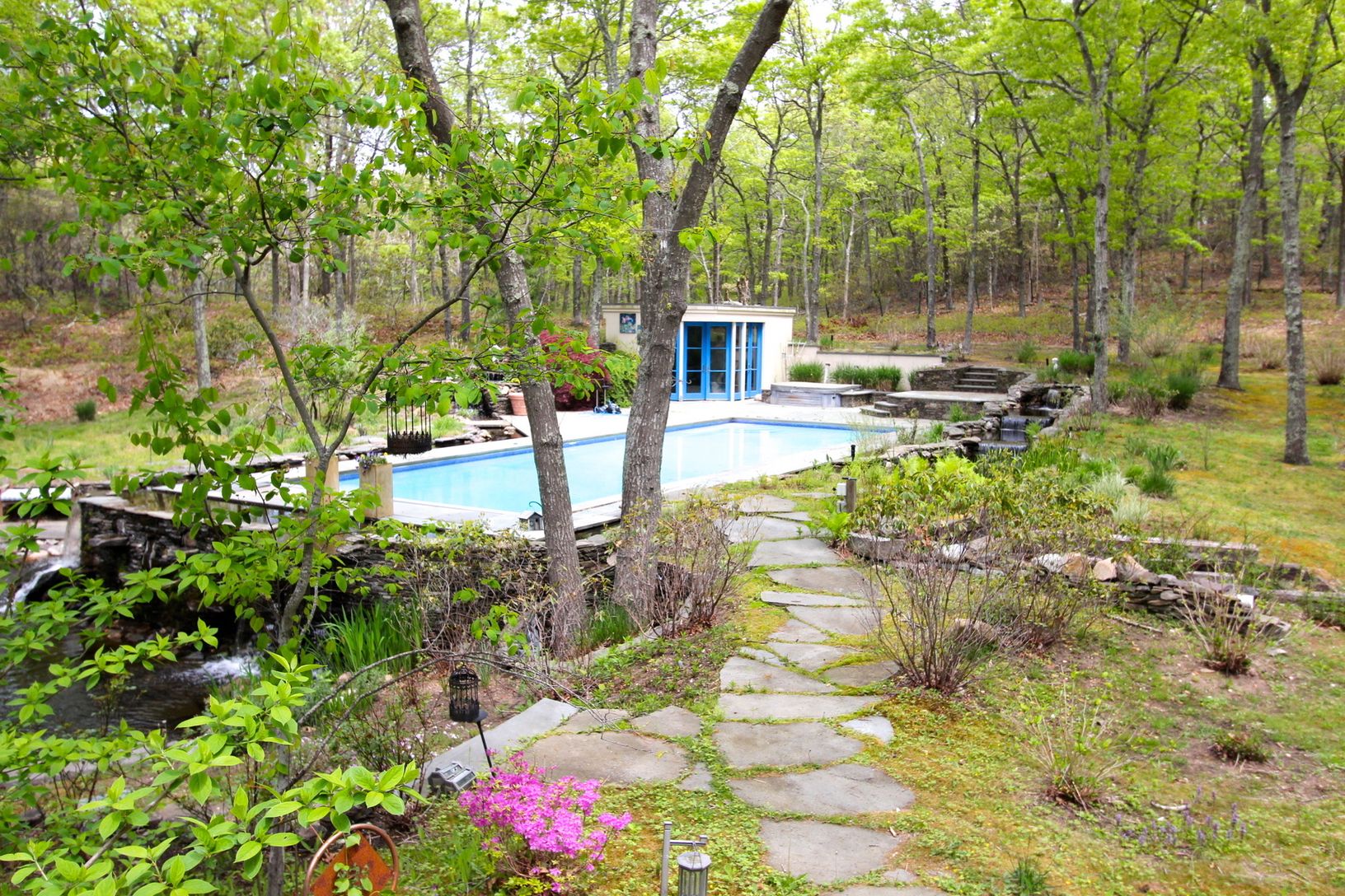 On two acres surrounded by 70 acres of reserve on the border of East Hampton and Southampton Towns, just south of Sag Harbor Village off Division. Private location with a very warm four bedroom, 3.5 bath Main house that has two fireplaces, knotty pine floors as well as a Spanish tiled kitchen and breakfast area. Full basement, double garage, and spectacular river rock waterfalls and flowing streams around a pool large enough for the whole ca