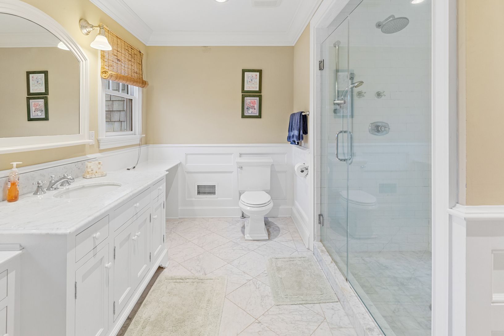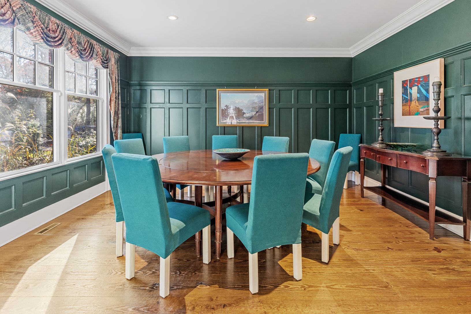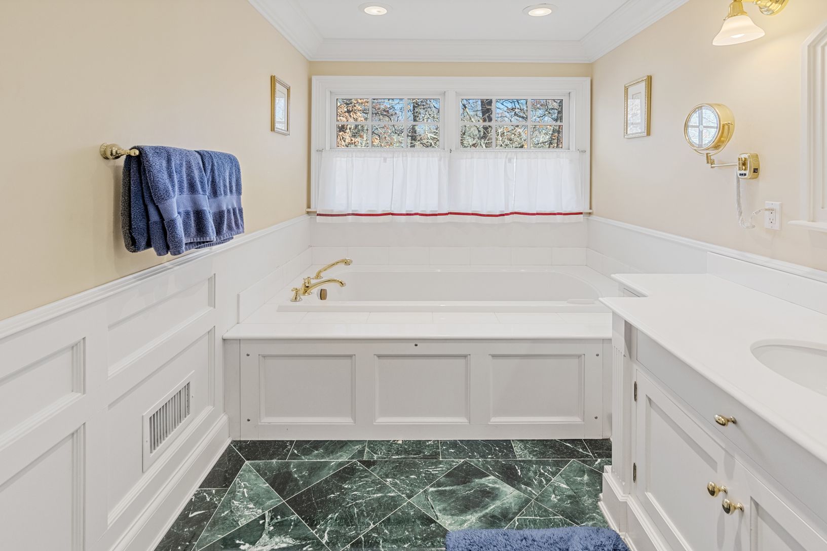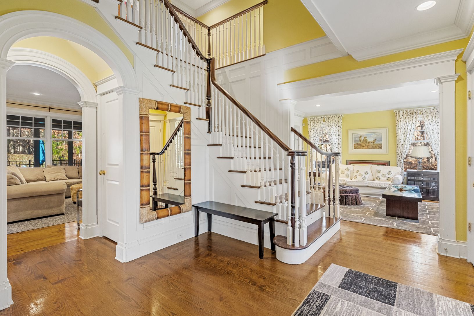 This traditional 5-bedroom, 5-bathroom home offers exquisite attention to detail, spanning over 4,200 +/- sq. ft. Built by renowned architect Peter Curto, the house boasts superior custom cabinetry, crown moldings, and intricate paneling, coupled with a thoughtful layout. The lower level features an impressive foyer, a stunning living room, a charming paneled dining room, and a spacious living room with a gas fireplace that opens onto an overs