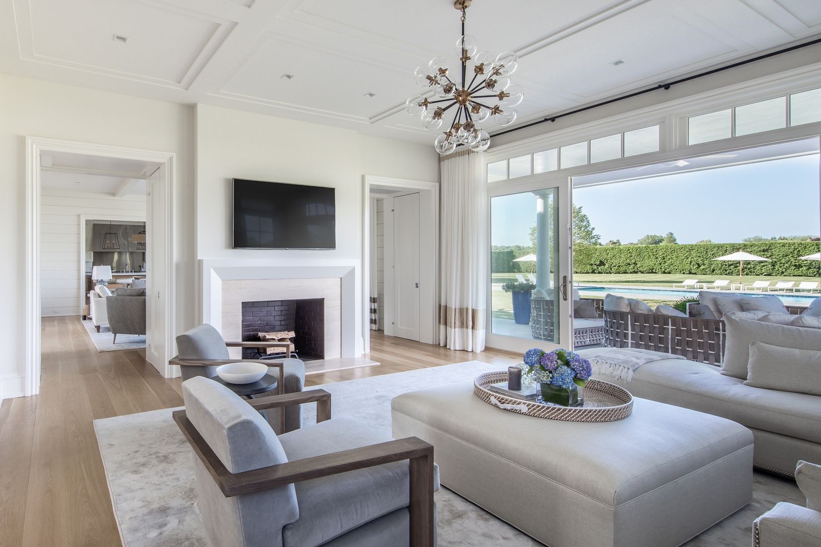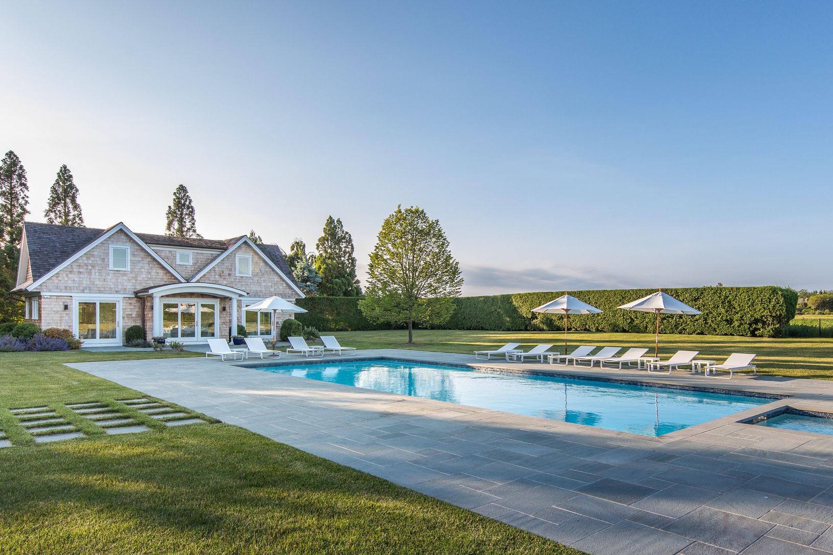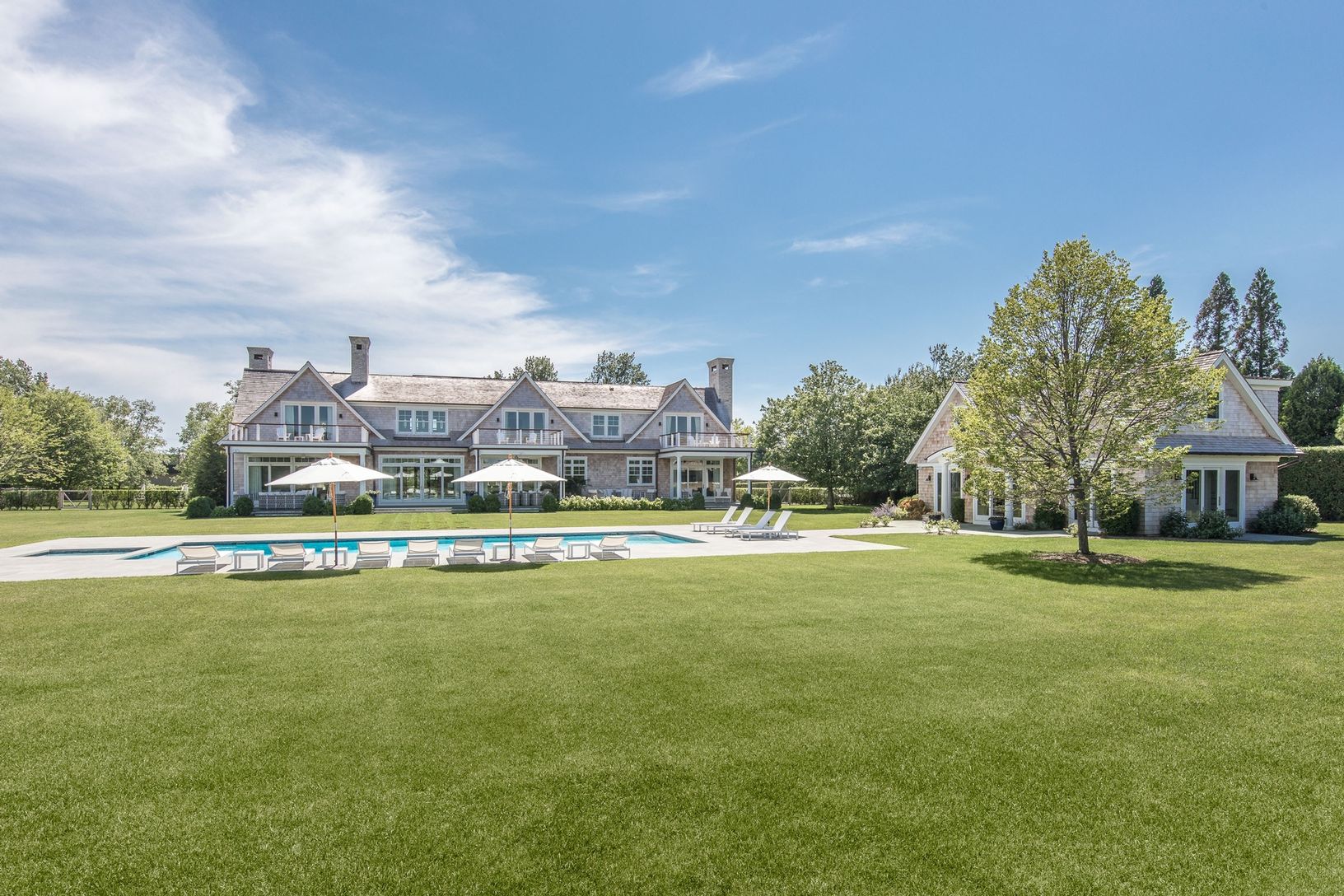 Spectacular resort-style living in Watermill South bordering a tranquil 34-acre reserve, right by the Mecox Bay. This incredible 13,000+/- square foot showplace home sits on 2.6 private acres with a huge finished lower level, 50' heated gunite pool, spa, 2-story pool house, outdoor shower and sunken tennis court the ultimate setting for entertaining and enjoyment. This home is designed to bring the outdoors in with all finishes in a warm and