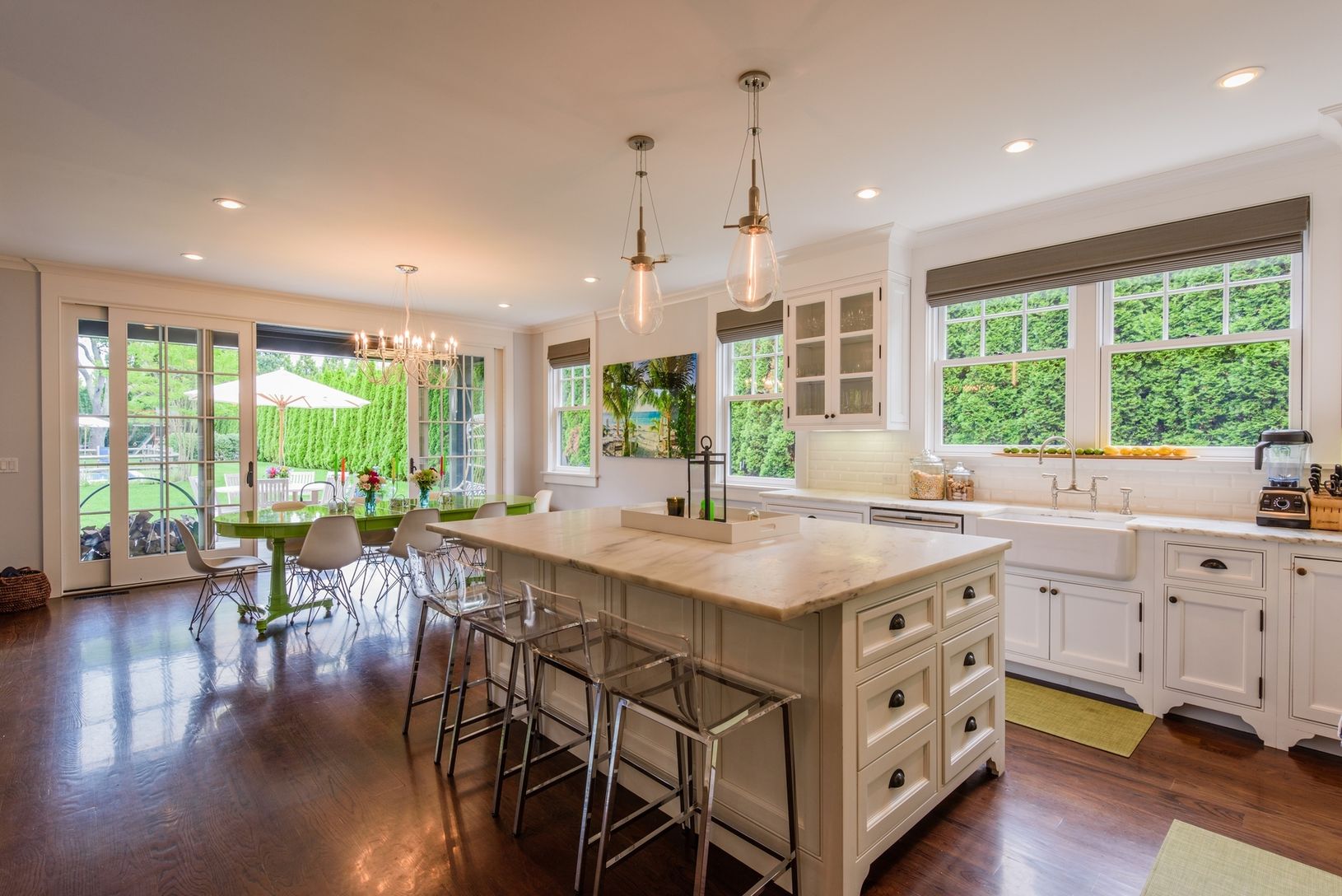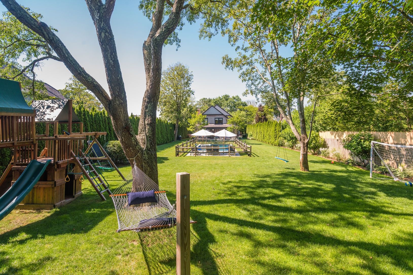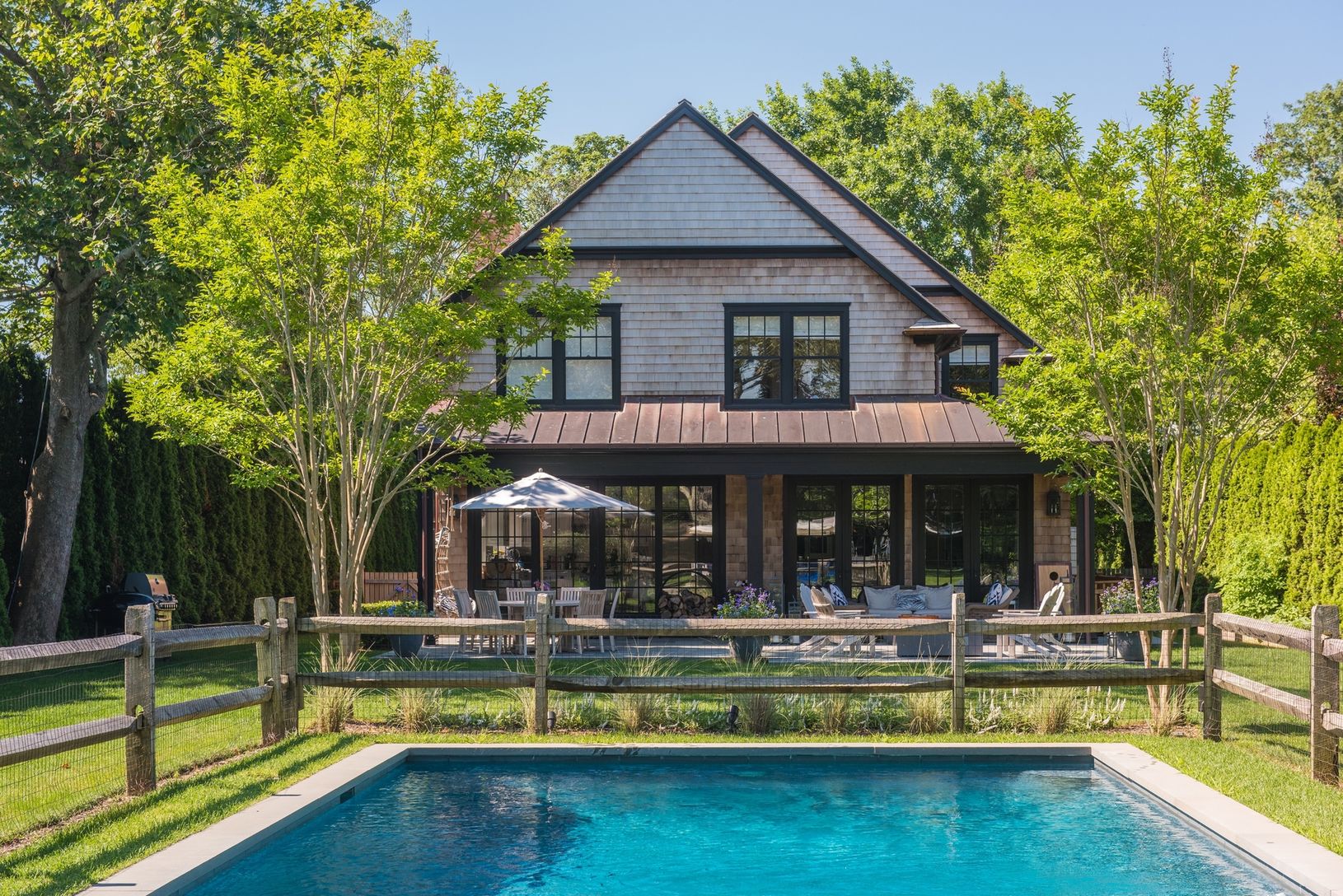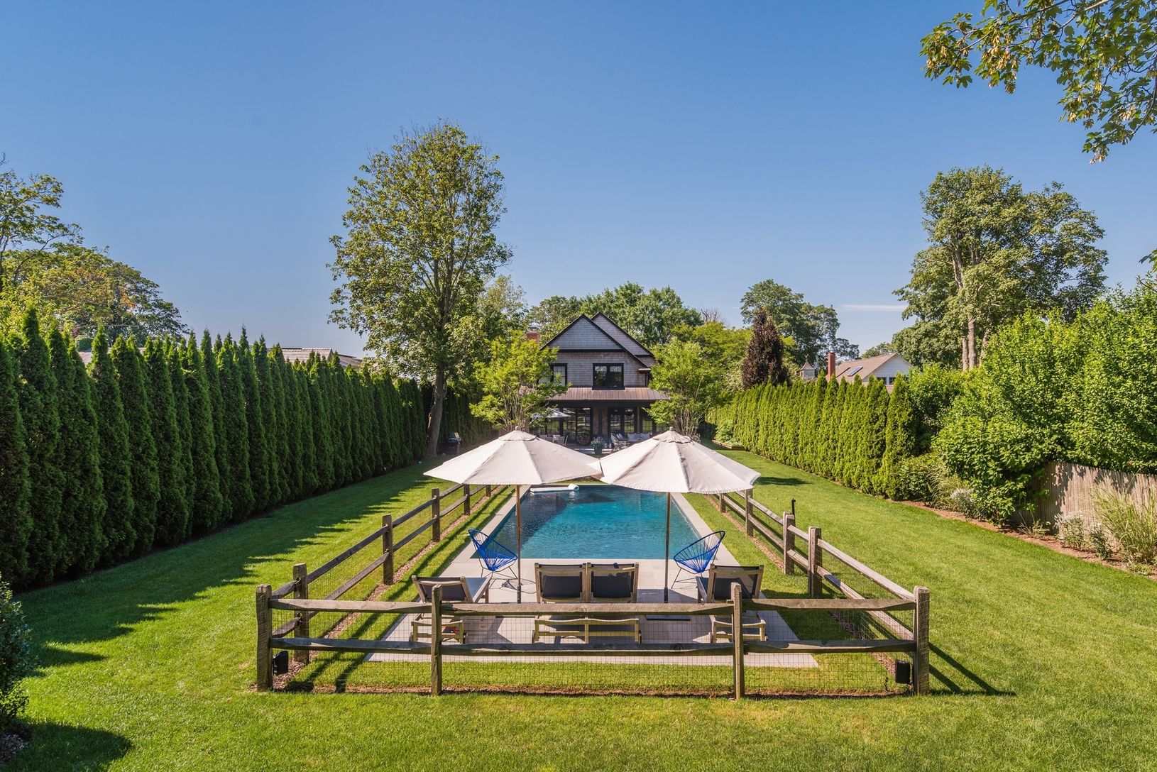 Set on an exceptionally deep and private half acre south of the highway in Water Mill, this 6 bedroom shingle-clad traditional with handsome black trim embraces a style of local agrarian charm improved by modern flourishes. The thoughtfully designed home begins with a welcoming living room with fireplace, high ceilings, and five-inch oak floors. An open kitchen and dining area with Wolf range, Subzero refrigerator and wine cooler has sliding F
