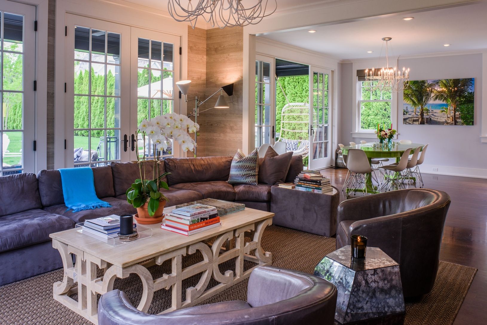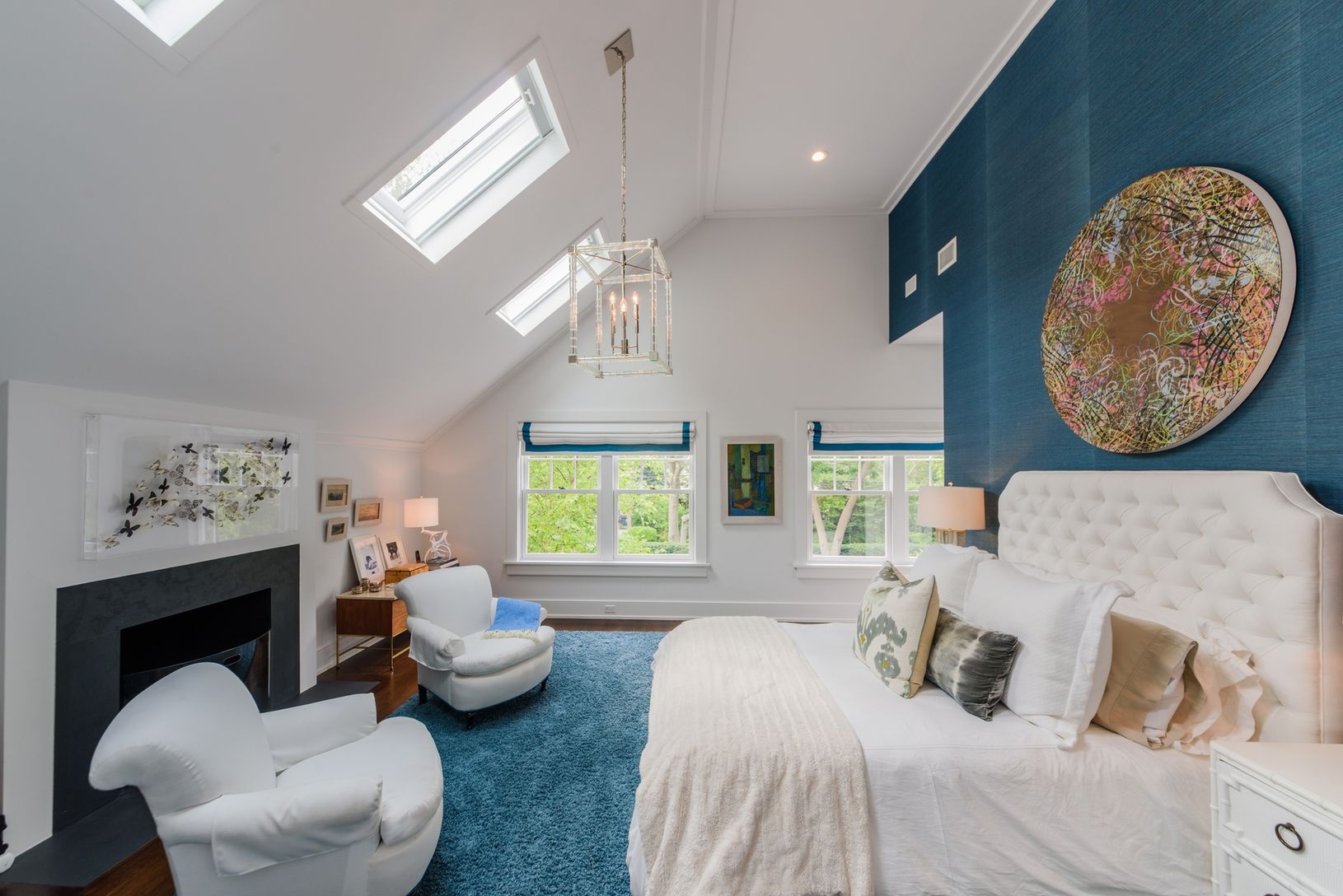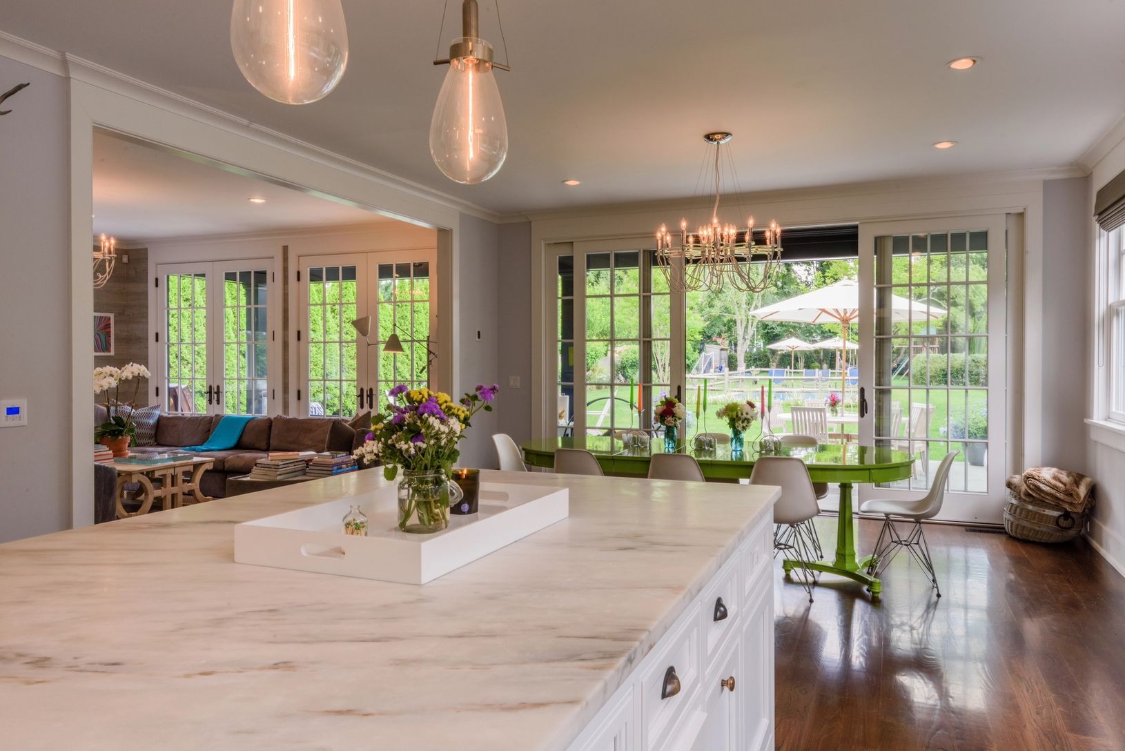 Set on an exceptionally deep and private half acre south of the highway in Water Mill, this 6 bedroom shingle-clad traditional with handsome black trim embraces a style of local agrarian charm improved by modern flourishes. The thoughtfully designed home begins with a welcoming living room with fireplace, high ceilings, and five-inch oak floors. An open kitchen and dining area with Wolf range, Subzero refrigerator and wine cooler has sliding F