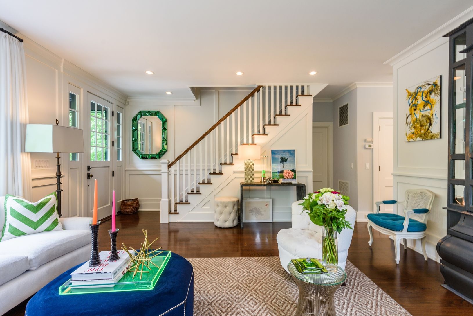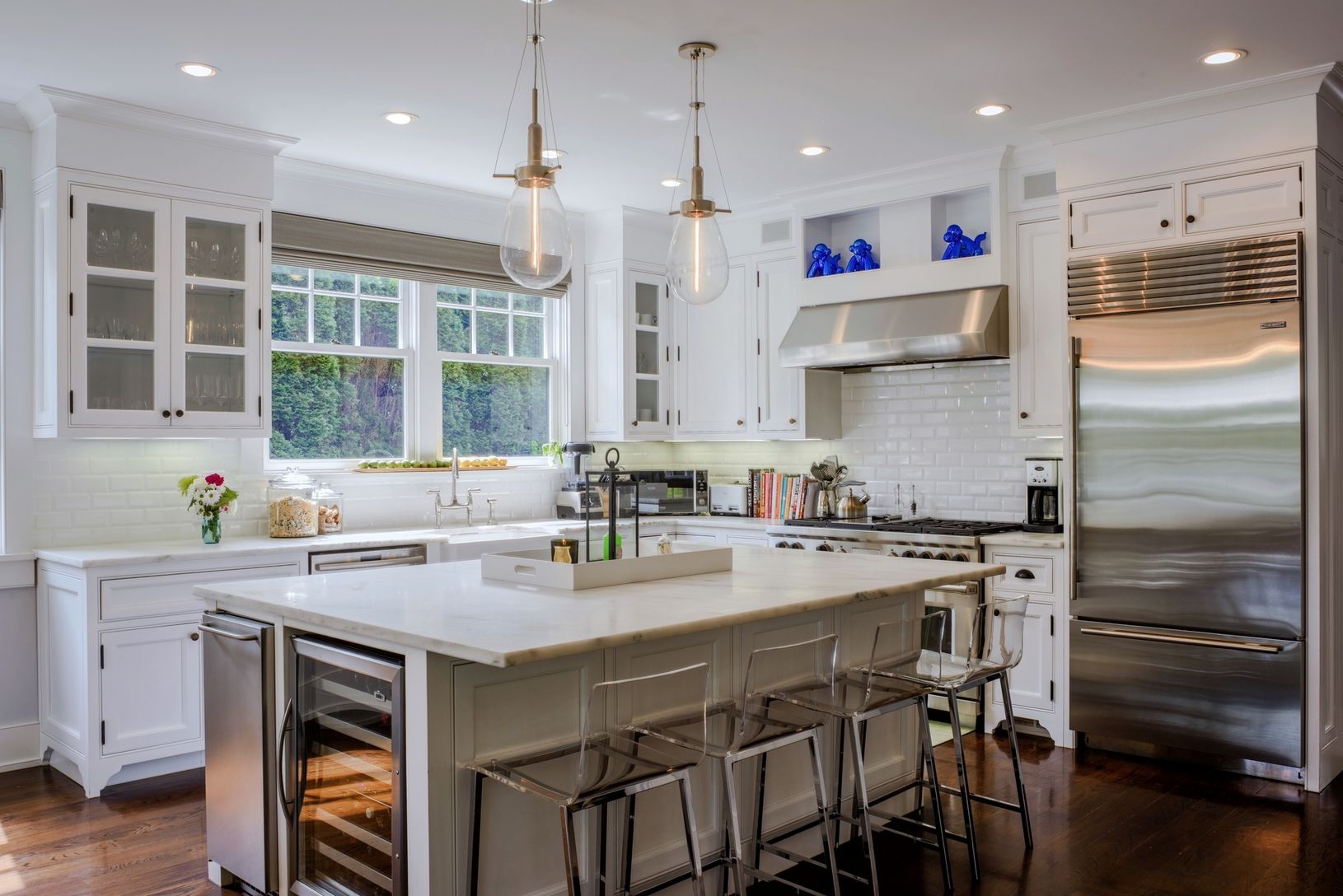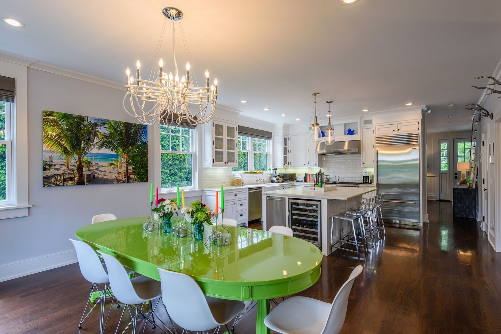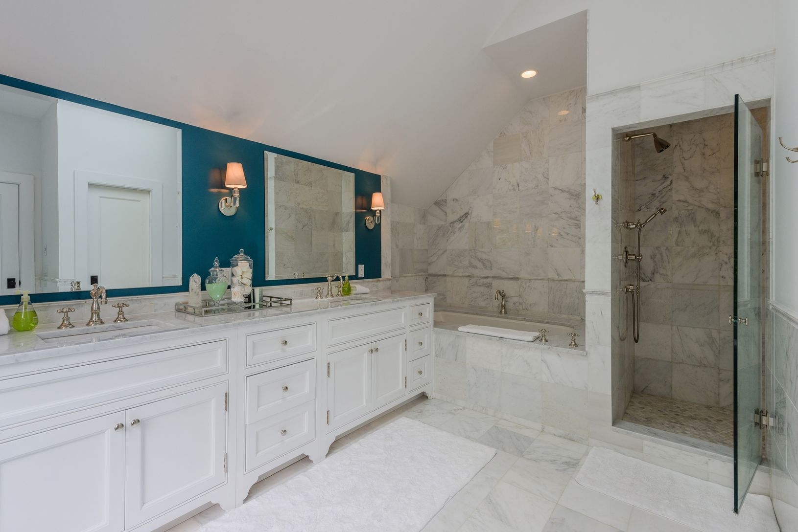 Set on an exceptionally deep and private half acre south of the highway in Water Mill, this 6 bedroom shingle-clad traditional with handsome black trim embraces a style of local agrarian charm improved by modern flourishes. The thoughtfully designed home begins with a welcoming living room with fireplace, high ceilings, and five-inch oak floors. An open kitchen and dining area with Wolf range, Subzero refrigerator and wine cooler has sliding F