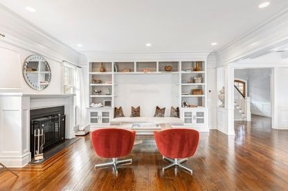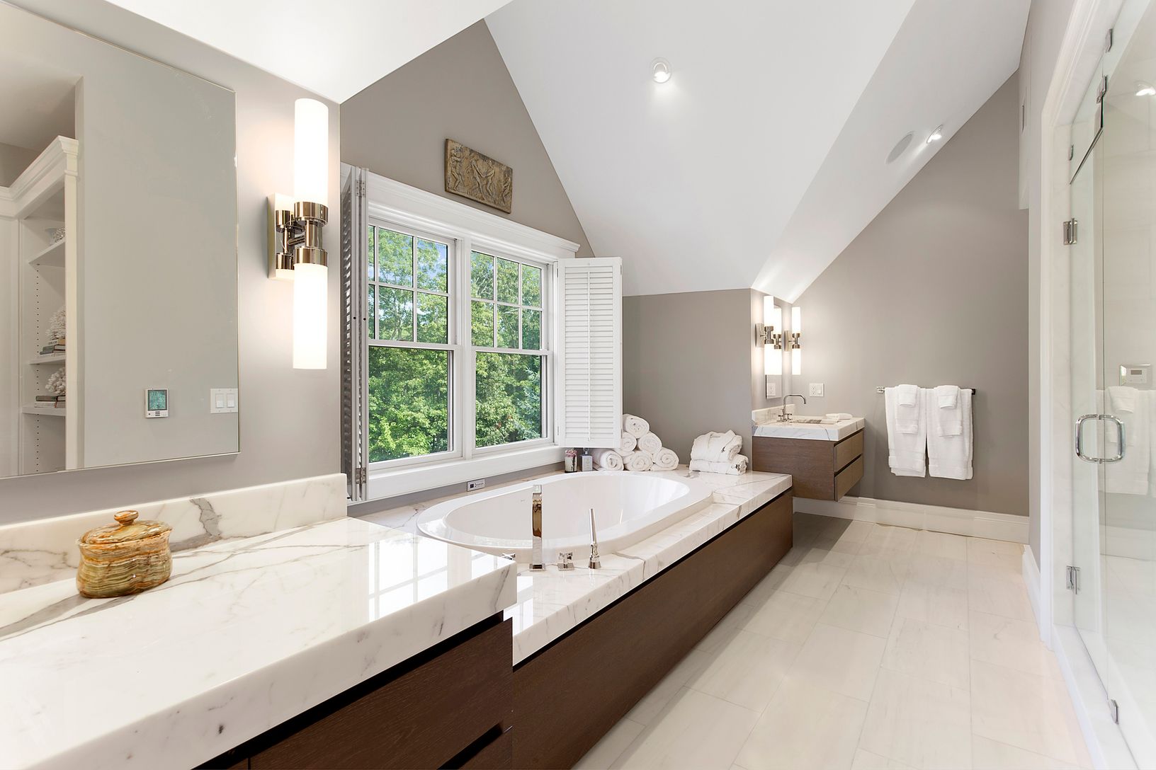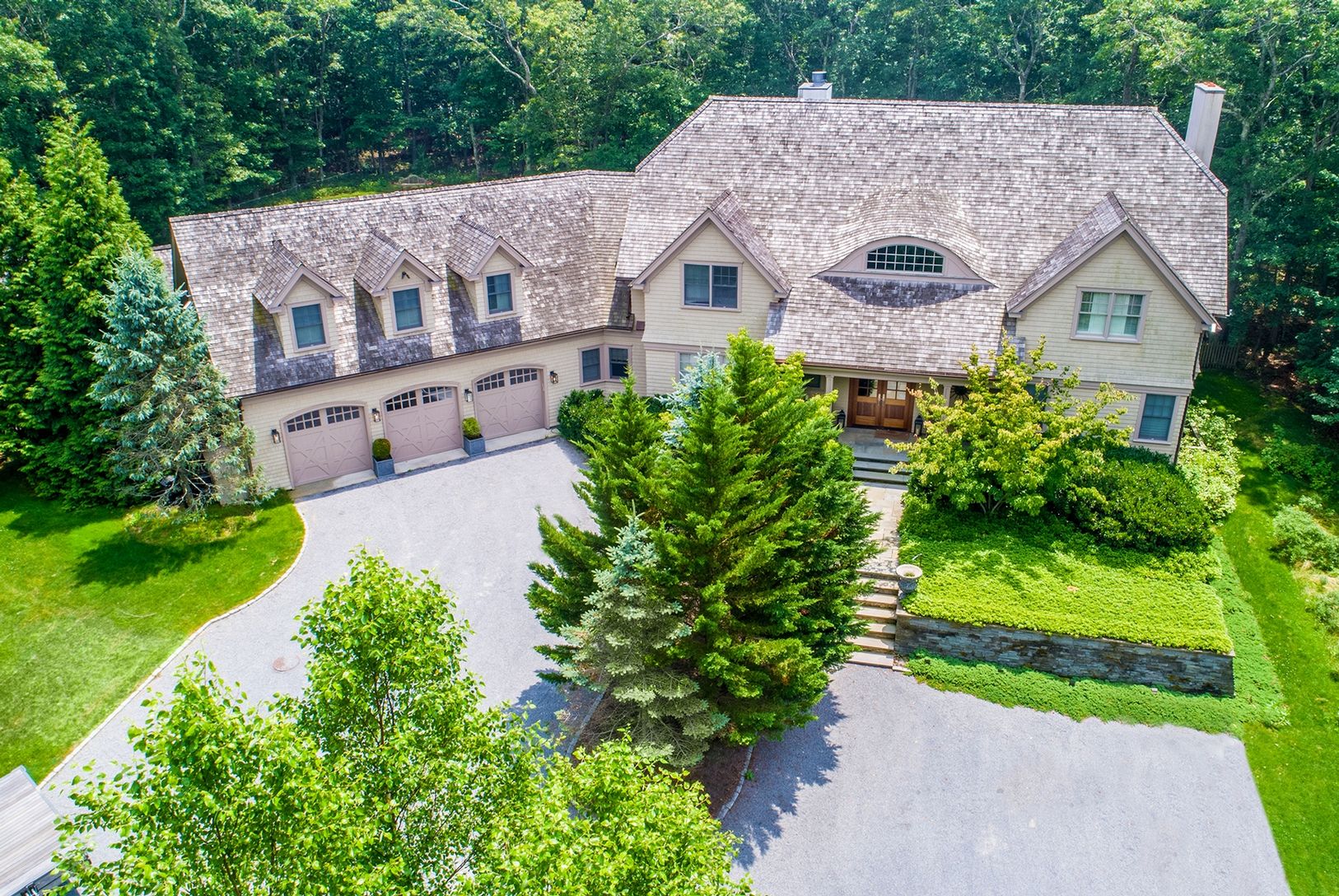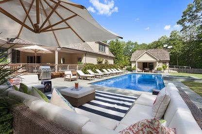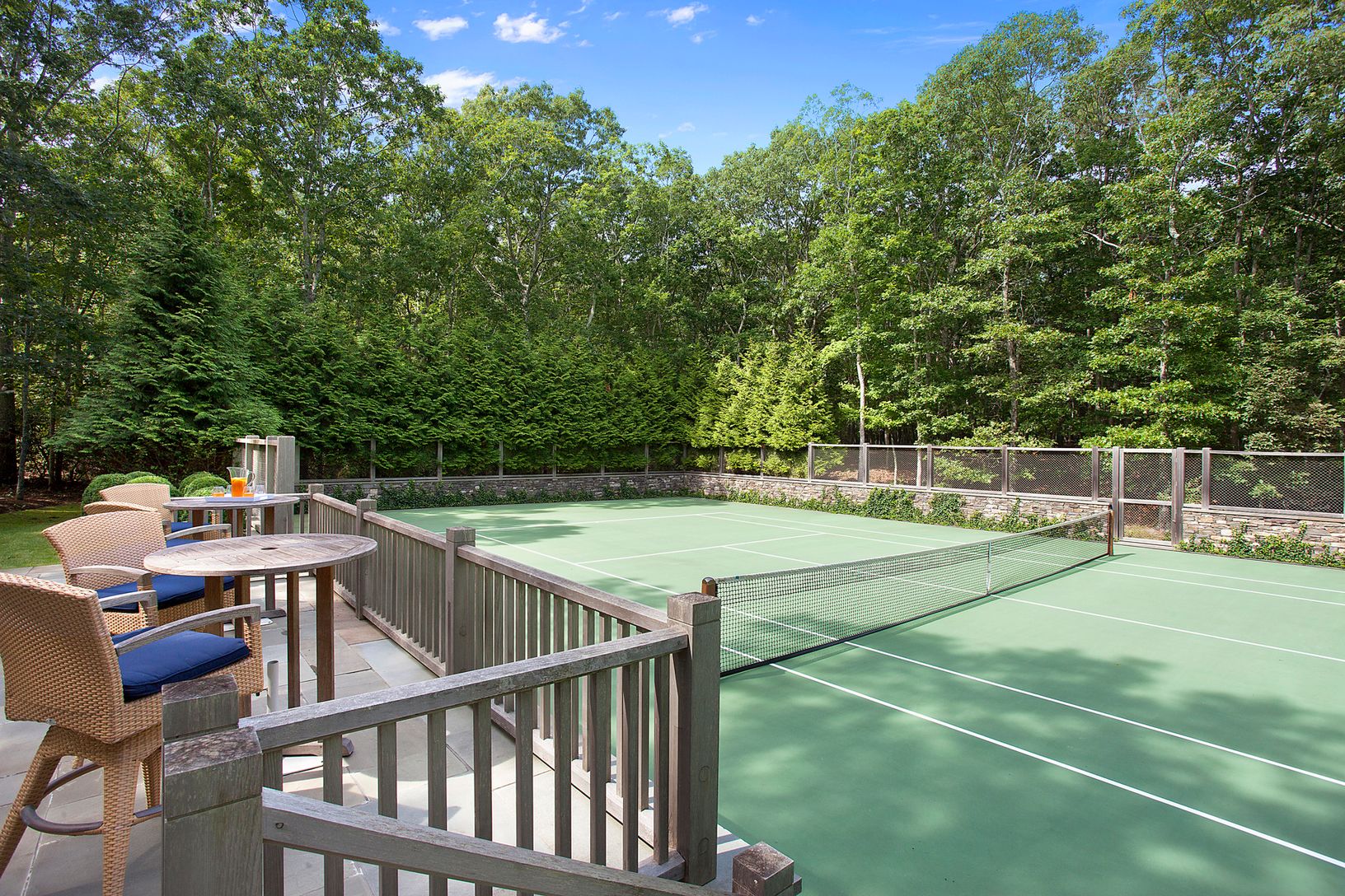 A private sanctuary on 7.90+/- acres in Water Mill, New York. The vast estate features a manicured landscape with a heated gunite pool, pool house, and sunken tennis court with spectator veranda. An elegant traditional is the focal point of the property. With over 7,000 sf of living space the home is a monument to comfort. Designer decorated and boasting 6 luxurious bedroom suites. Beautiful entry with parquet herringbone flooring and rich har