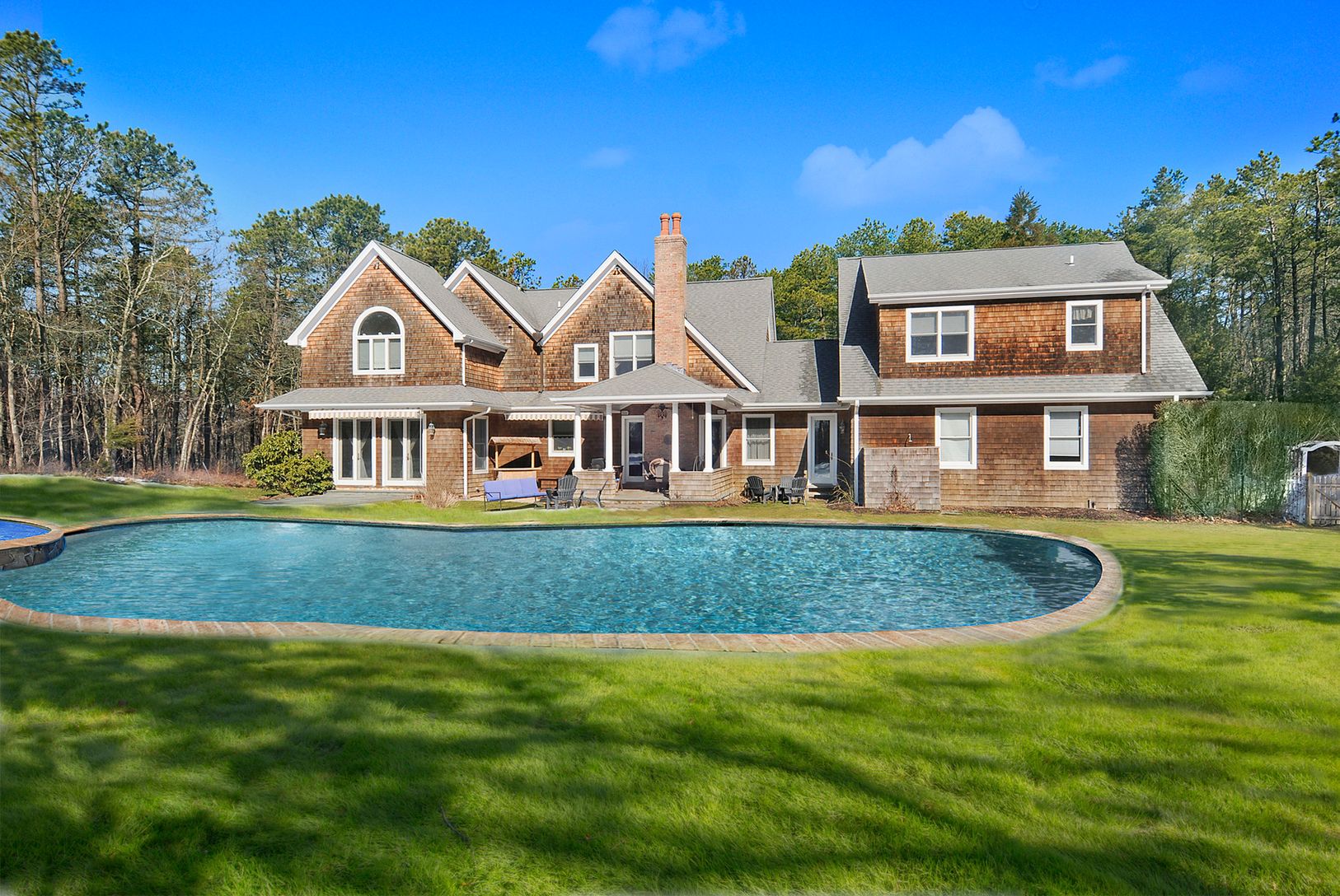 Exceptional offering in Water Mill with amazing heated gunite pool with jacuzzi and bluestone surround with areas for lounging and dining. Additional outdoor dining under a wonderful covered porch with ceiling fan. Professional and lush landscaping on the entire 3+ acre property plus an outdoor shower. Spacious floor plan includes a beautiful formal living room with fireplace, formal dining room, fully equipped kitchen that opens to the den wi