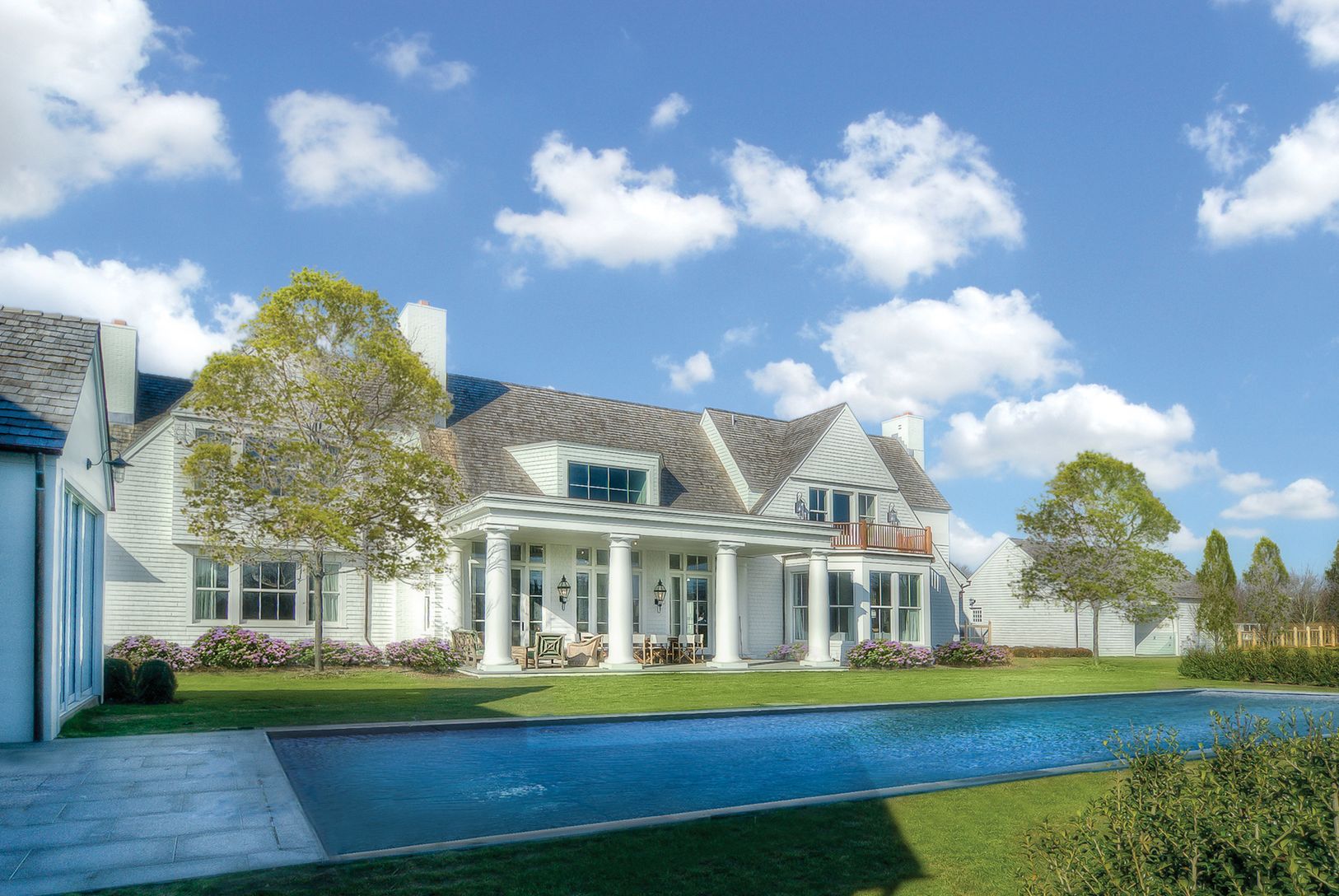 Introducing "Linden House", James Michael Howard's newest creation. This 10,620 +/- sq ft mansion is situated south of the highway in Water Mill, one of the premier areas of The Hamptons. The 7 bedroom, 8 bathroom home sits on 1.22 +/- beautifully landscaped acres with a detached 2 car garage and porte-cochere, large heated gunite pool with spa, and a pool house that features an exercise room, a massage room, and a comfortable living space. Th