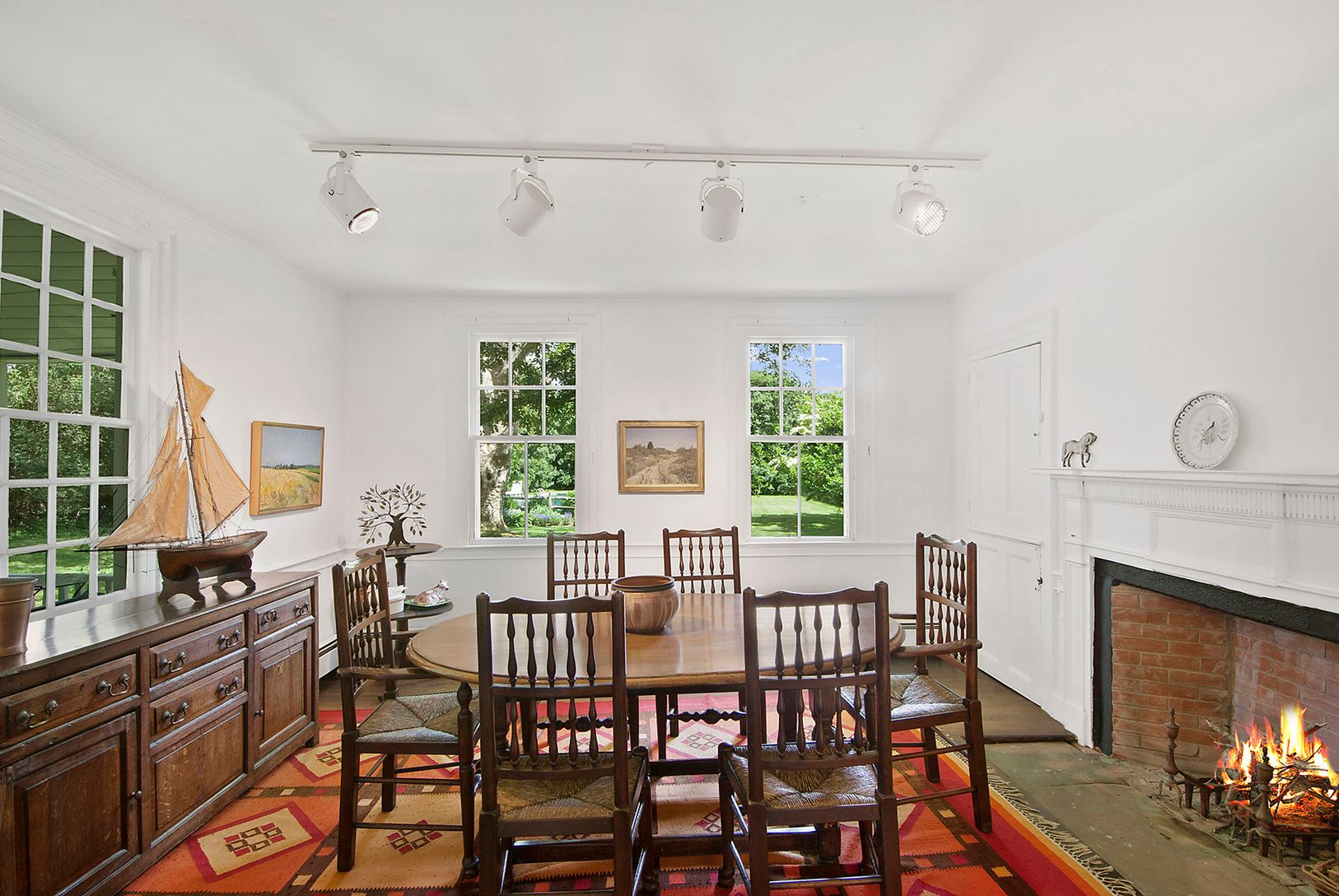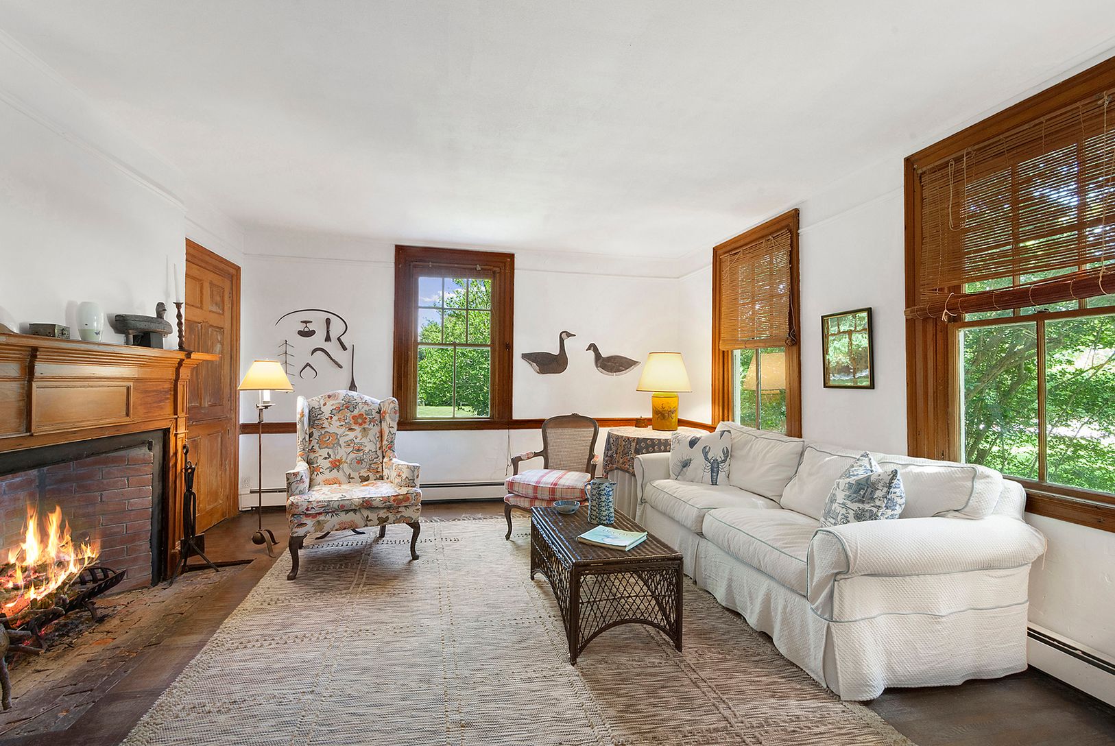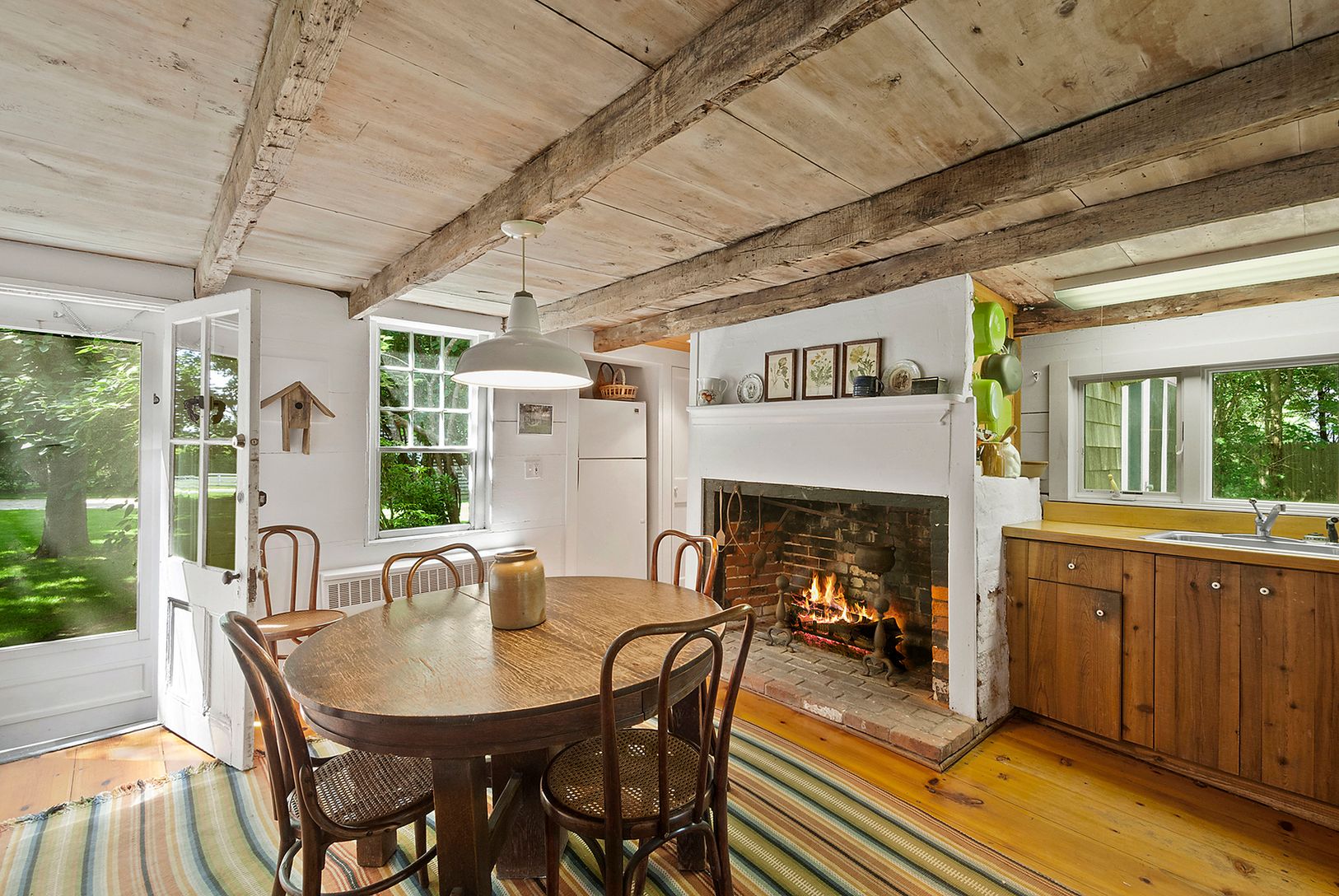 Beautifully renovated and pristinely maintained classic 1800s farmhouse on manicured one acre grounds in premiere Water Mill south location. Chic and rustic with period lines and details, this authentic Hamptons retreat features a country kitchen with wood beamed ceiling and central fireplace, an inviting living room which shares a central fireplace with the comfortably spacious dining room, four bedrooms including ground floor master, three