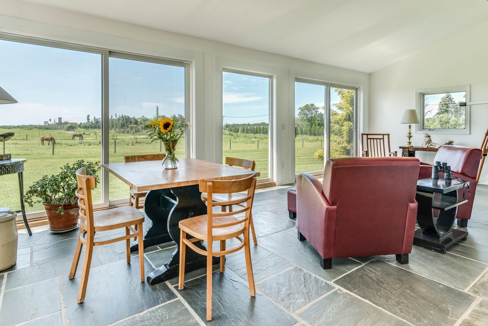 Horse Farm: A three bedroom, two bath home compound with converted horse shed, barn and pool. Massive ceilings and beautiful beams throughout. Incredible views over six paddocks of horses and surrounding 90 acre reserve. Private; part of a 12 acre estate. Dog friendly.