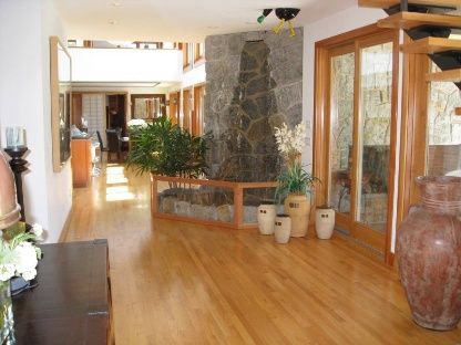 Situated on a private, manicured acre between Meyer's Pond and Mecox Bay you will find this contemporary 6,000 sqft 7BR/8Bath home with every conceivable amenity including indoor/outdoor pool, spa, sauna, gym/7 fireplaces/4 waterfalls, open living area, media room, extensive outdoor decking, outdoor BBQ pit, separate guest/staff apartment, and your own private dock.