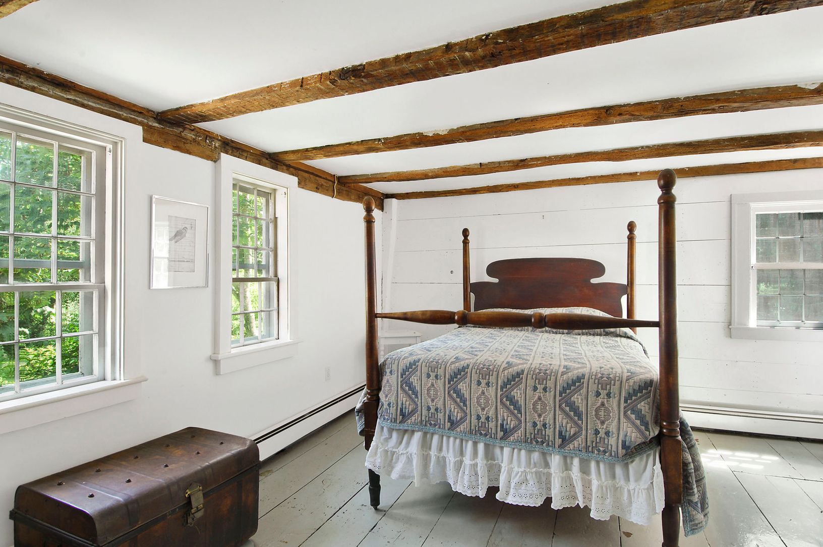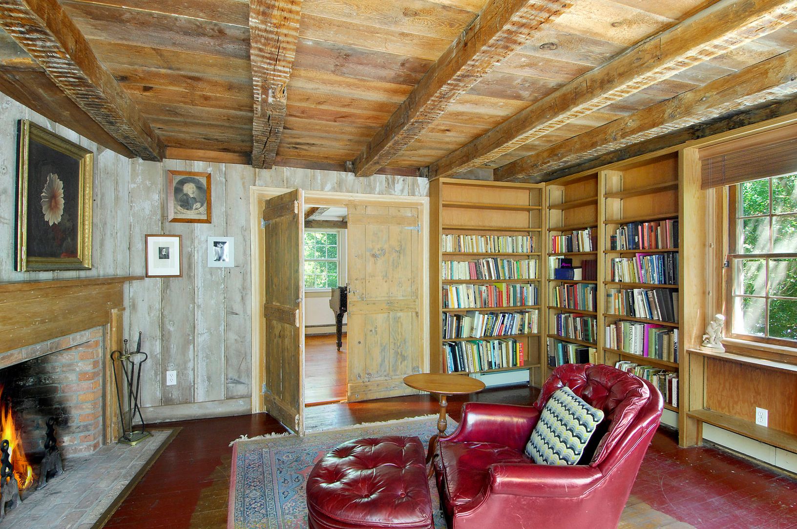 This welcoming renovated classic 1740's farmhouse on almost 2 acres with charming porch entry features original wide plank floors, exposed beams, five fireplaces, pool, barn, mature landscaping, and farm field views all in a rare setting in coveted Water Mill. Open country kitchen and dining room with French doors open to covered patio and the expansive grounds beyond. Living room features grand central fireplace, a wood paneled library with