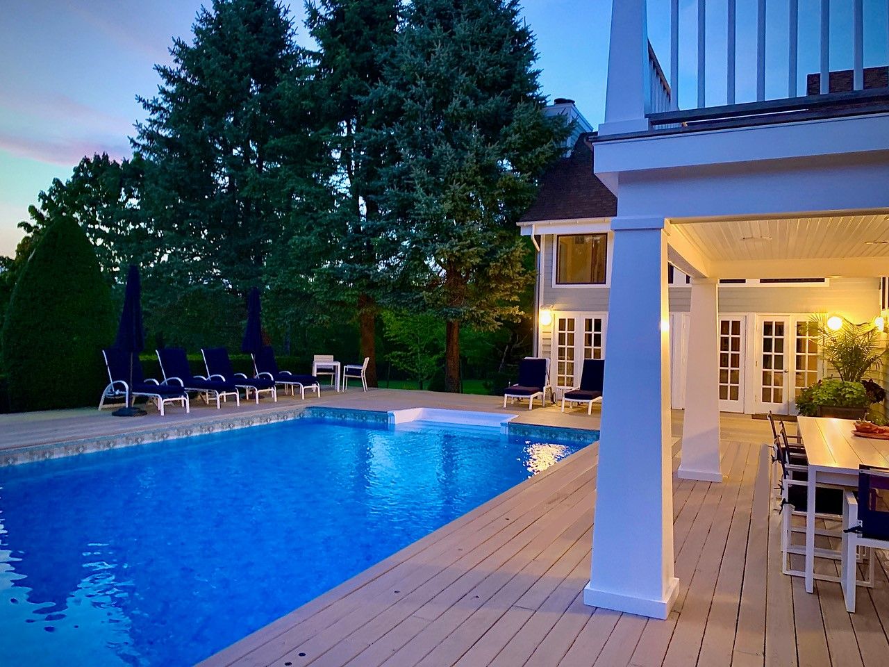 This newly-renovated traditional presides over an estate of 2.50 acres. Features include a living room with fireplace, dining room, eat-in kitchen, five bedrooms (including first-floor master), four baths and a powder room. Additional amenities include central air-conditioning, sound system and a heated 20' x 40' pool. The beautiful property is privately situated on a cul-de-sac.