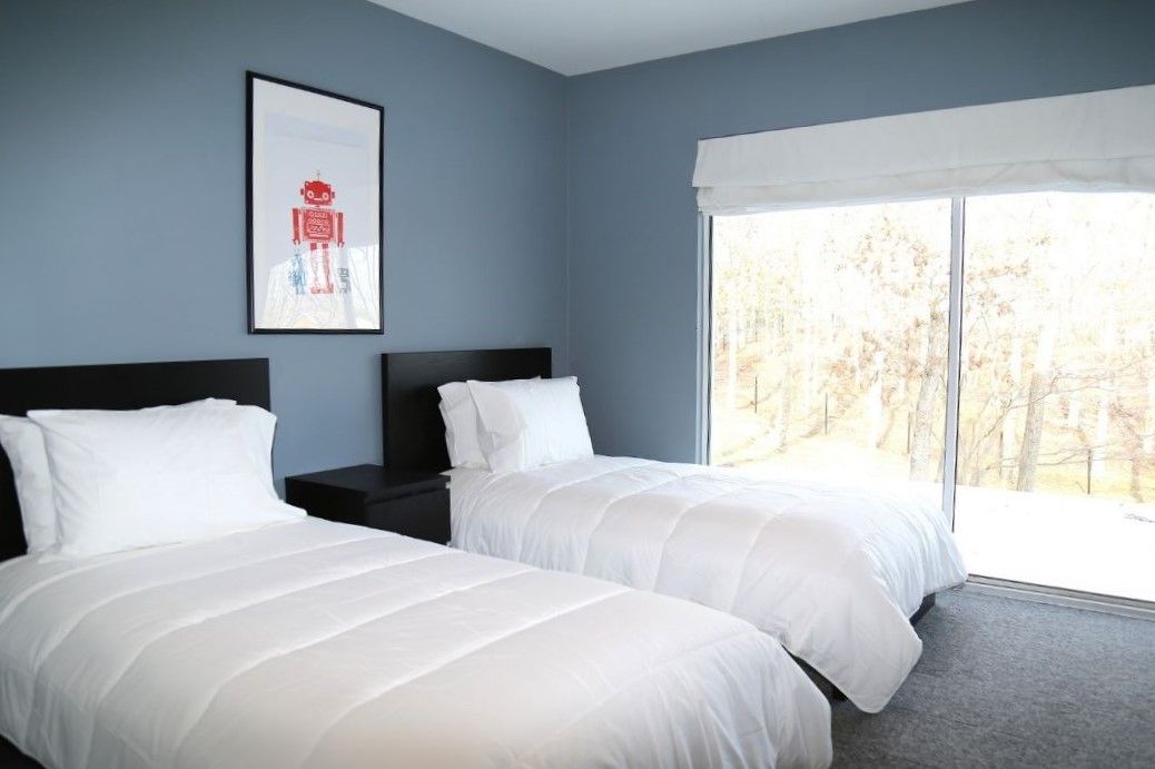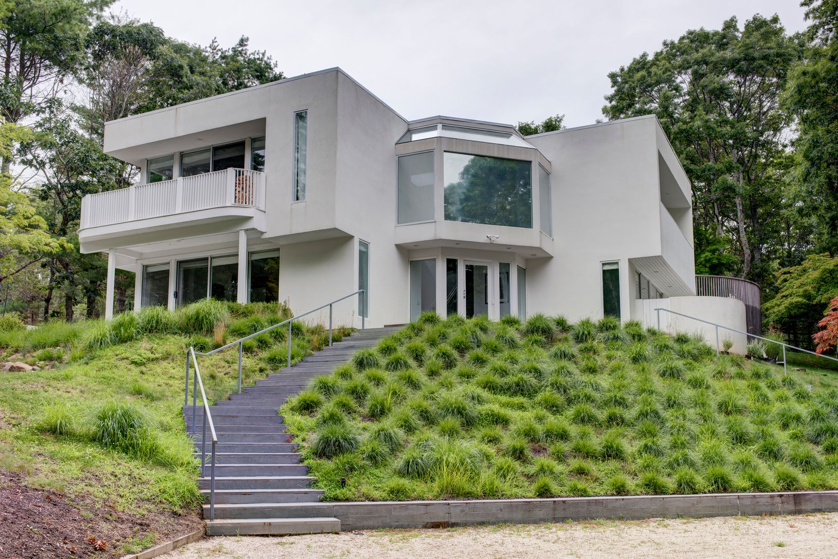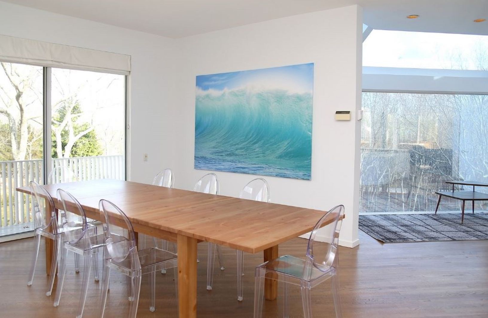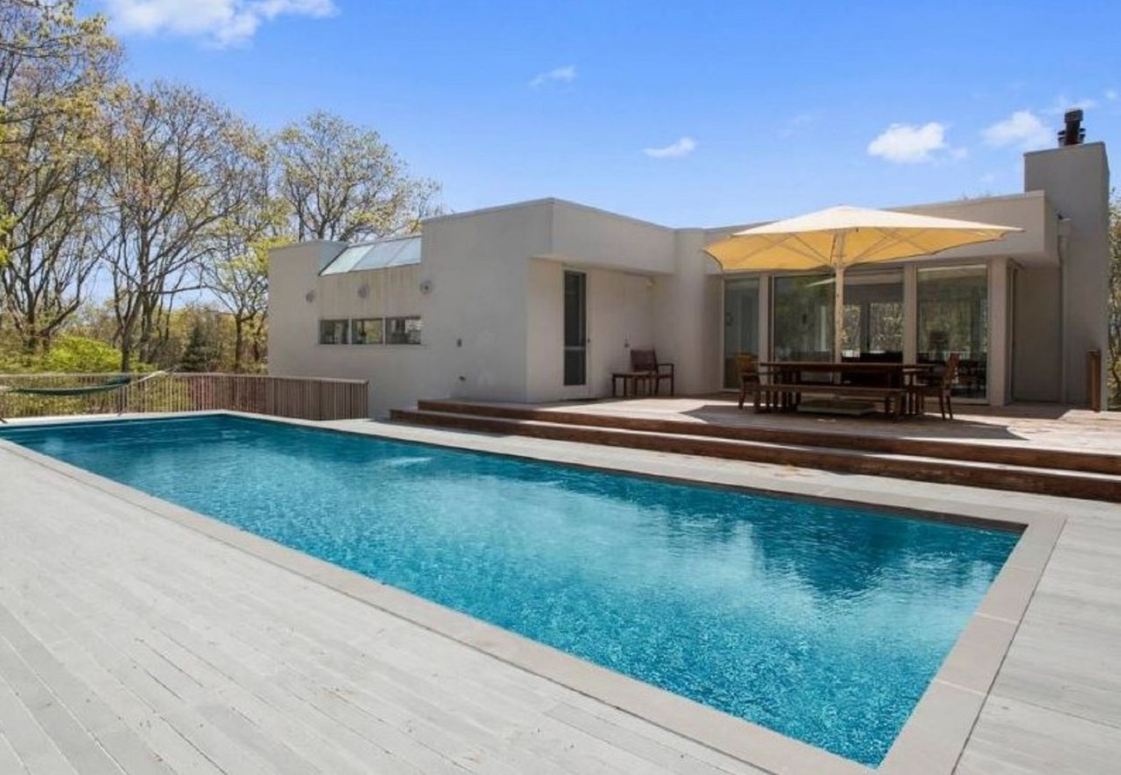 This striking modern beach house on a very private acre was designed by award-winning architect Harry Bates. The open-plan living area with wood-burning fireplace and wet bar is flooded with light and opens directly to a spacious deck with large dining table and a heated Gunite pool with bluestone surround. This beautiful home offers three bedrooms, each with private deck access, plus two-and-a-half baths. Located on a very quiet cul-de-sac fo