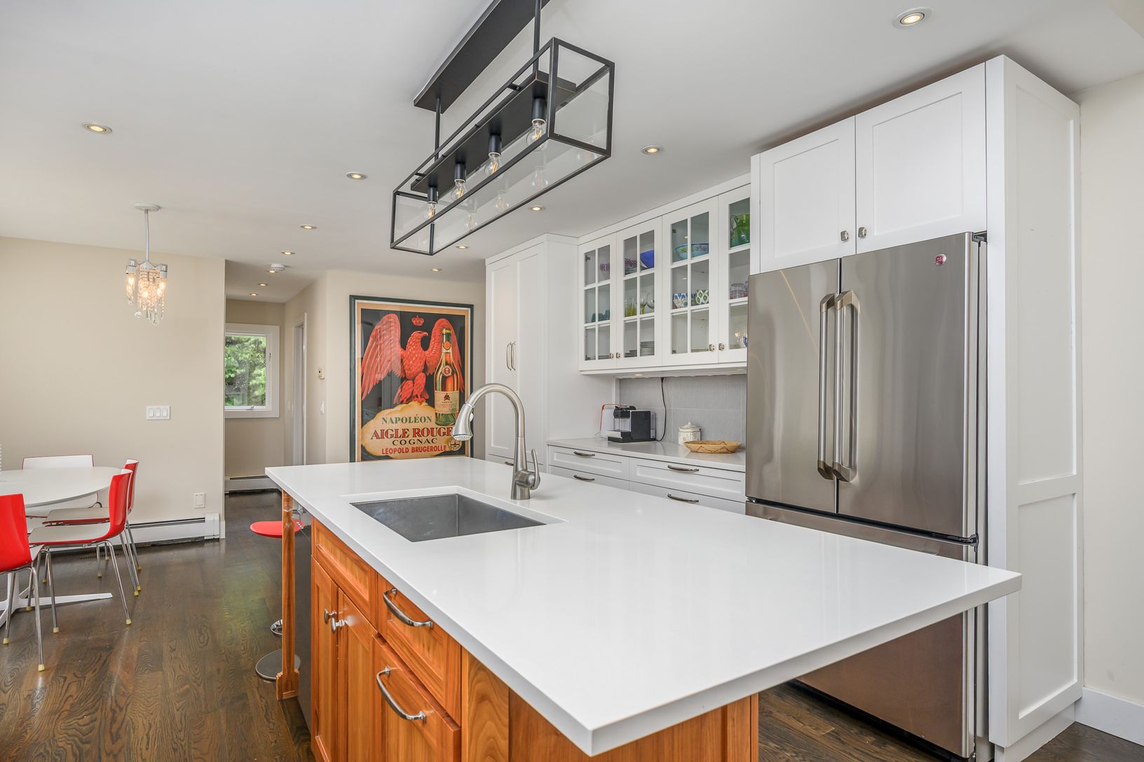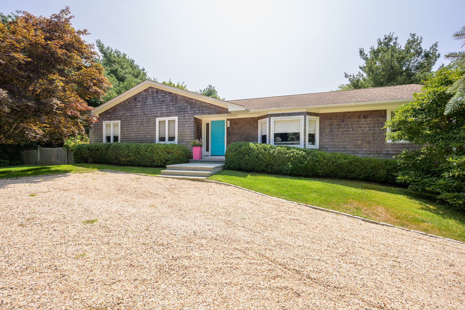 Located in the serenity of Water Mill, this gorgeous and recently renovated home is a testament to beachy chic elegance. Spanning a generous 3,200 +/- sq. ft. on a shy acre of lush landscape, this newly shingled one-level home encapsulates the essence of luxury living in the Hamptons. Upon entry, one is greeted by an expansive living space bathed in natural light, thanks to its vaulted ceilings and large windows. The heart of the home features
