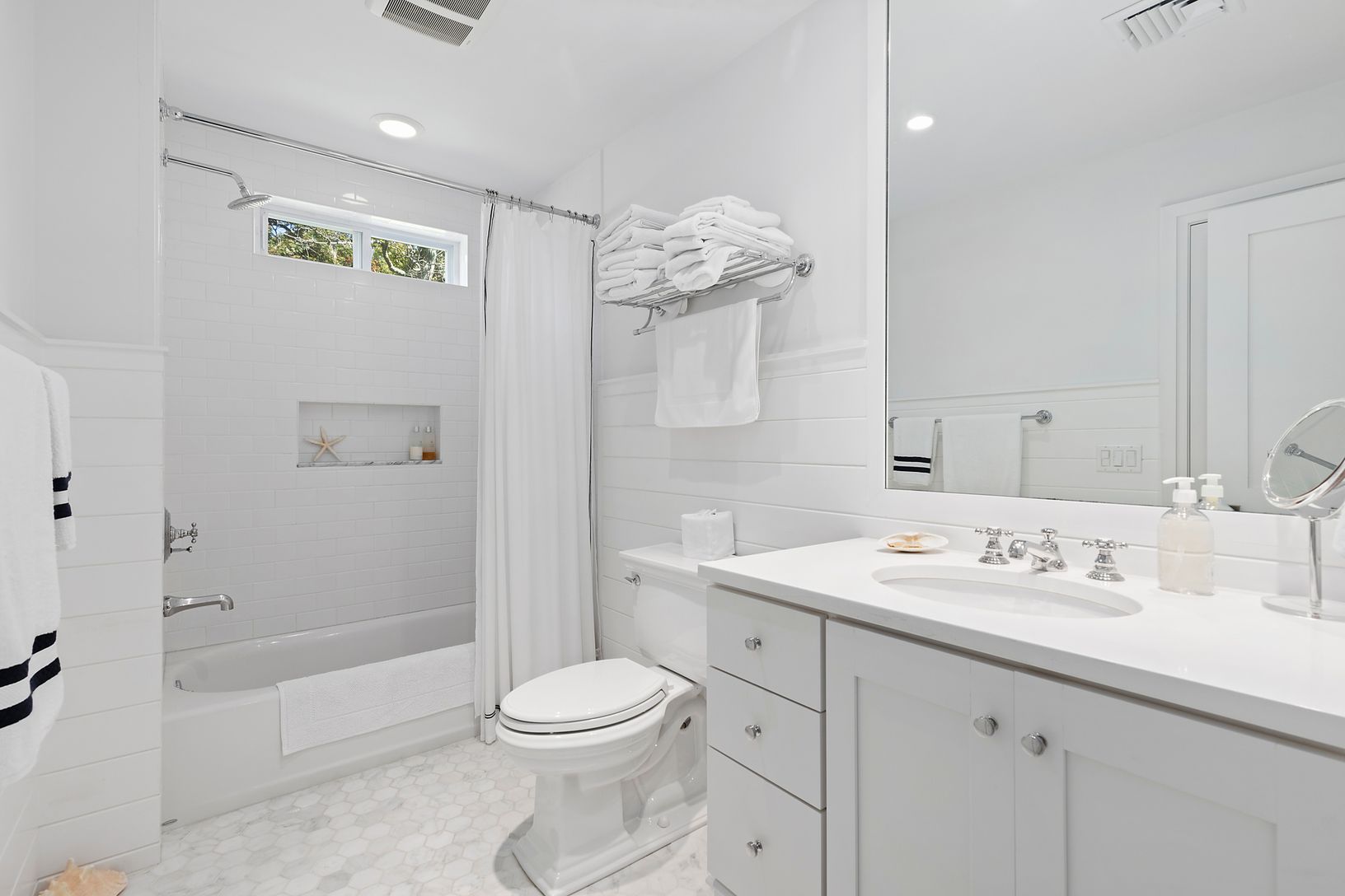 Enjoy spectacular sunsets over a scenic horse farm from this meticulously renovated dream summer home, in Water Mill. A light and airy great room, center island Carrera marble chef's kitchen equipped with Wolf, Sub-Zero & Bosch, formal dining room and large-screen media room offer multiple entertaining options. This home has a primary suite with luxurious marble bath, two guest bedrooms and two additional full and one half baths. A fabul