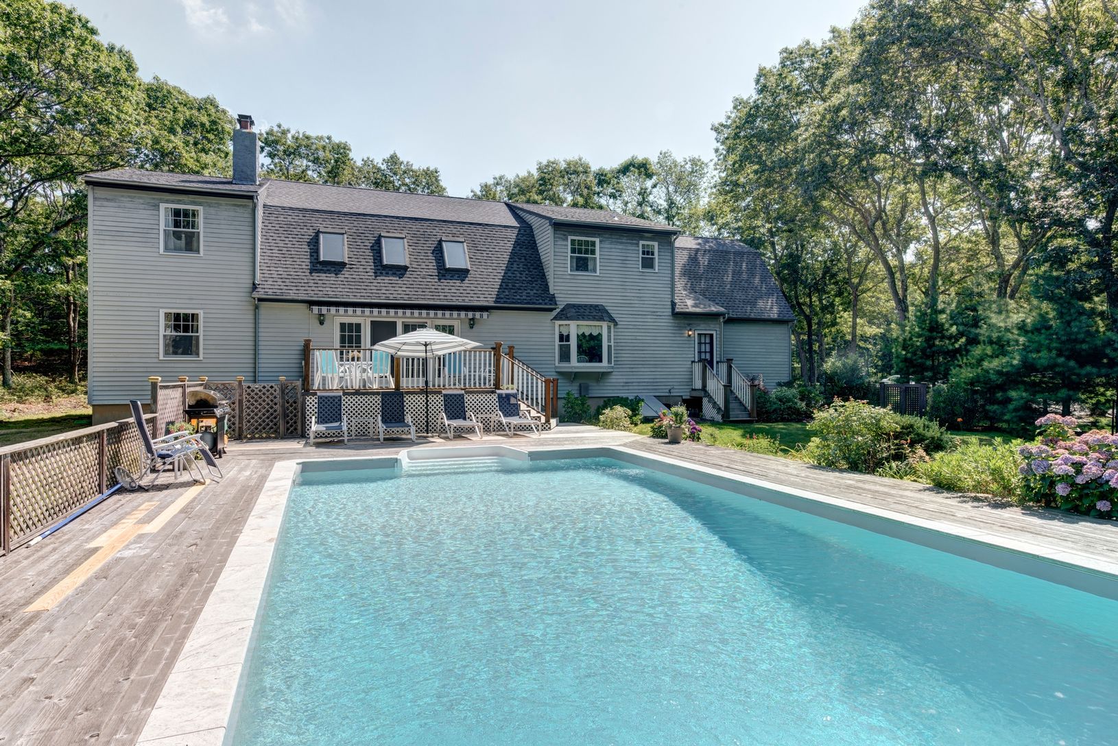 In a neighborhood of leafy cul-de-sac streets, this 5-bedroom, 3-bath traditional sits on a full acre with mature landscaping and a heated pool. The dramatic double-height entry leads to a light-filled great room with stone fireplace and sliding doors that open to the deck and pool area, providing a great flow for summer entertaining. Close to bay beaches and marinas.