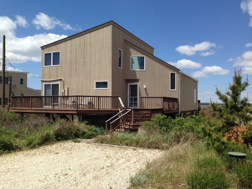 Bayfront beach house with access to ocean. Four bedrooms, two baths, with large sun-filled dining and living room. Watch natures wonders from the large deck overlooking Moriches Bay. Move in by summer.
