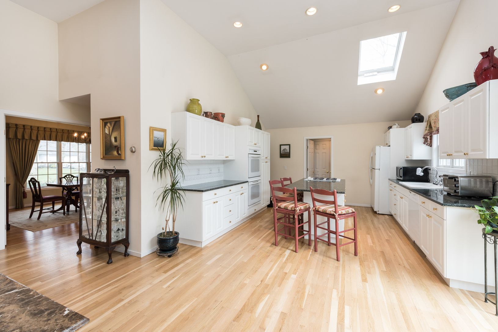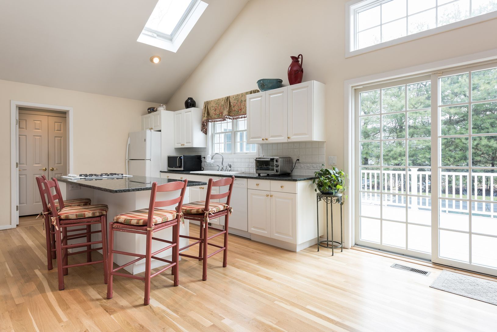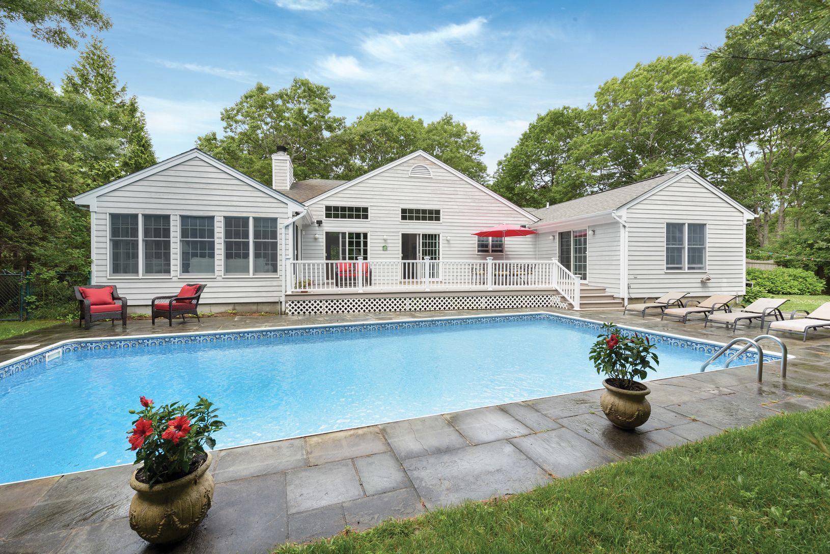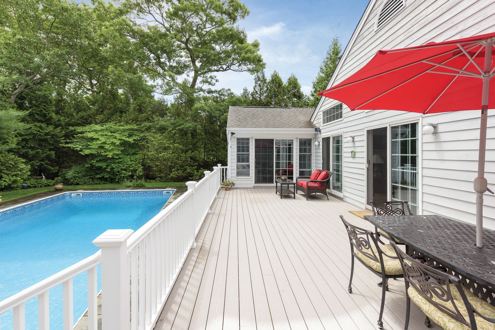 This beautiful village open concept home features three spacious bedrooms, three full bathrooms, a light bright sunroom and a separate dining room. The kitchen is open to the living room with vaulted ceilings, skylights, wood burning fireplace, and several sliding doors out to the deck and pool. The laundry room is off the kitchen and there is access to the two car garage from the kitchen. This home is carefully planned and well maintained for