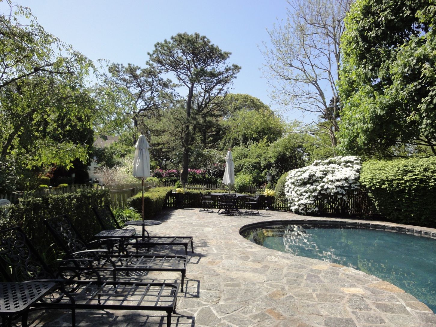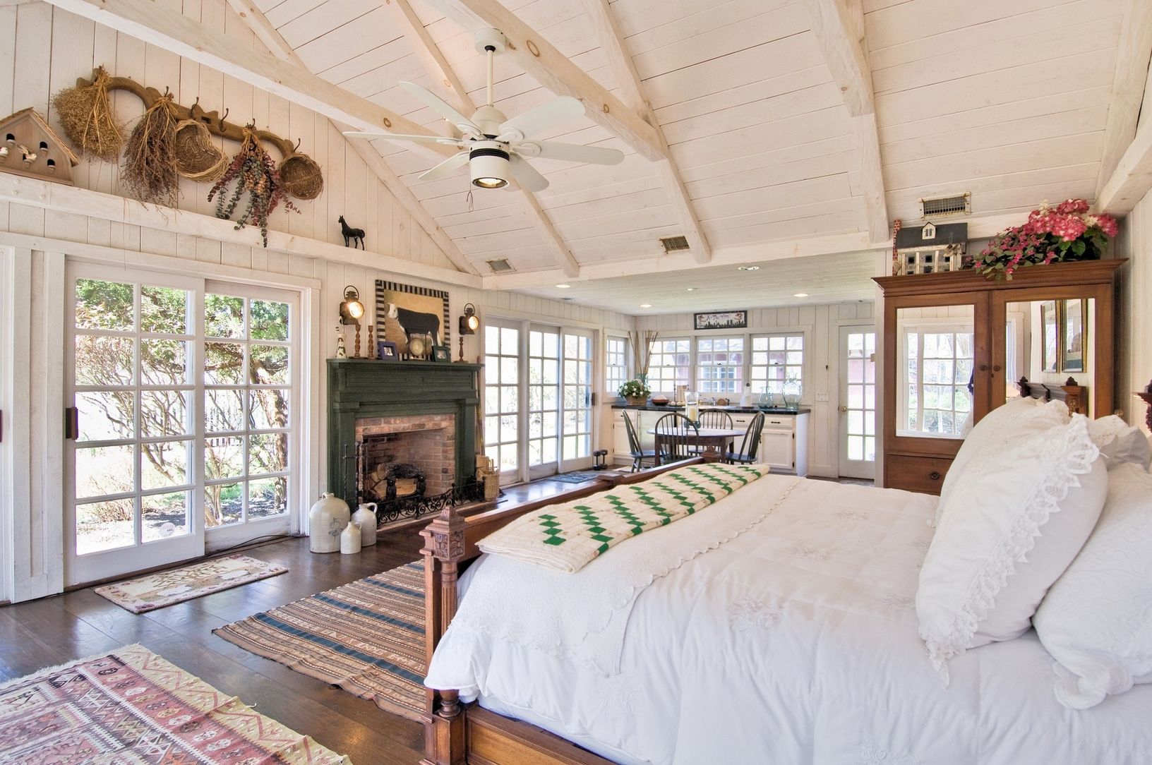 1-A traditional living room with large original brick fireplace. 2-A den with pot bellied stove and walls of glass overlooking the flowering garde