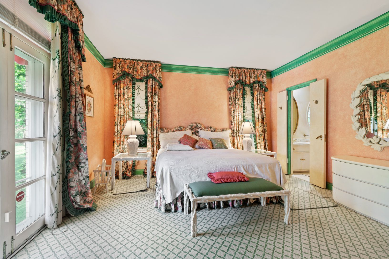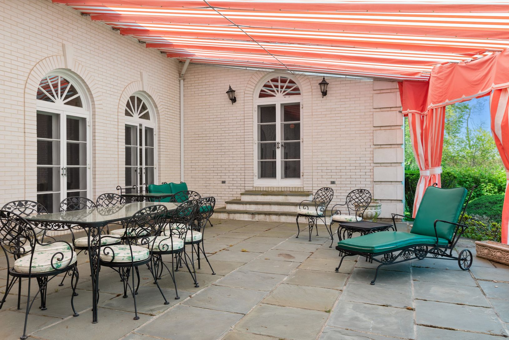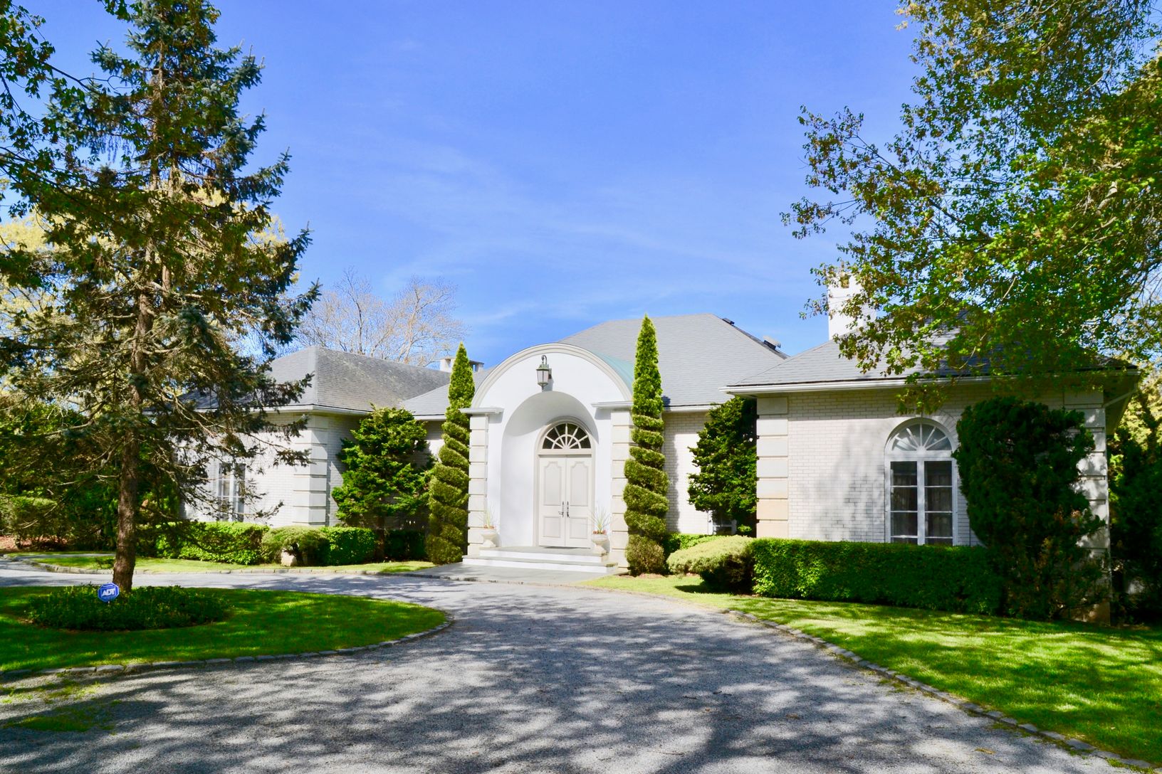 A downsized reminder of Long Island’s Golden Age, this classy 4-bedroom French Provincial has an elegant step-down living room, with clerestory windows lighting up the room, a marble-front fireplace for warmth, and a Steinway piano to set the mood; a large wood-beamed study with floor-to-ceiling field stone fireplace, quilted suede walls, oak floors and built-in corner bar; with shady veranda overlooking the pool, adjacent to a golf course. A