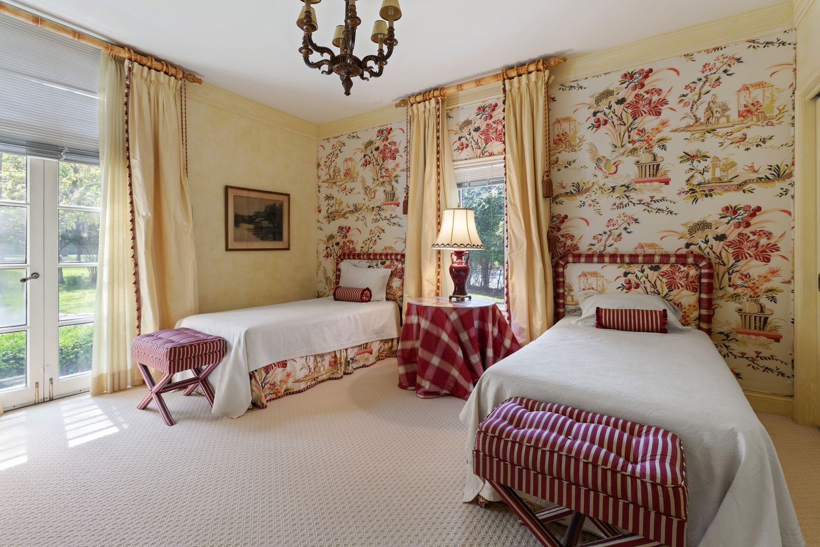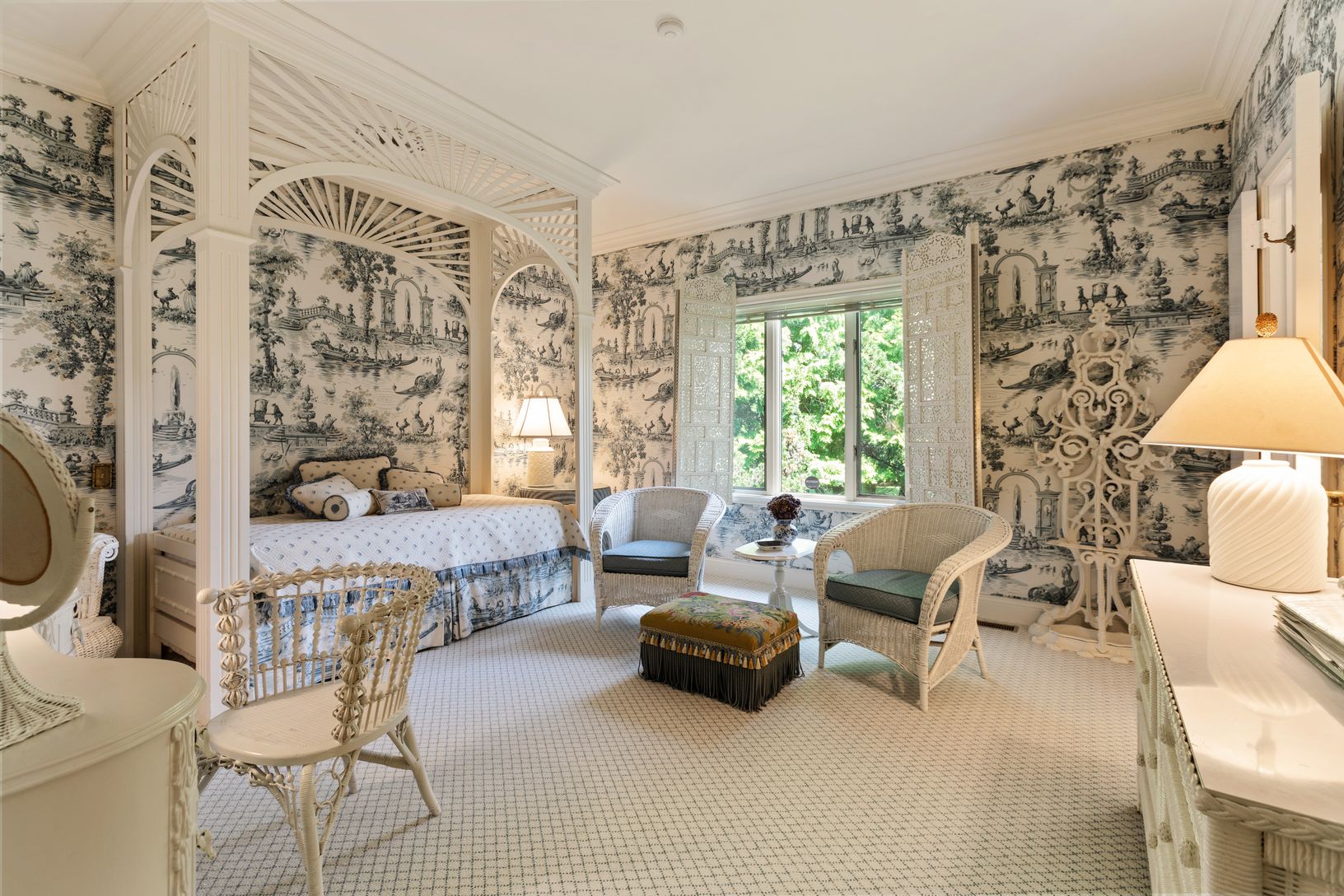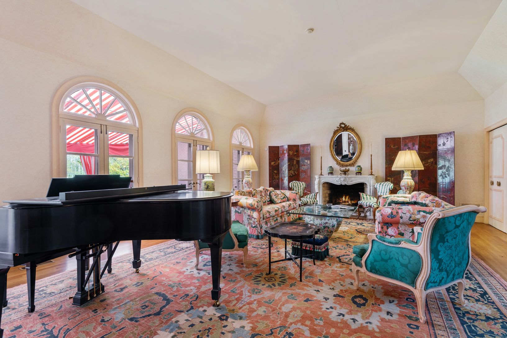 A downsized reminder of Long Island’s Golden Age, this classy 4-bedroom French Provincial has an elegant step-down living room, with clerestory windows lighting up the room, a marble-front fireplace for warmth, and a Steinway piano to set the mood; a large wood-beamed study with floor-to-ceiling field stone fireplace, quilted suede walls, oak floors and built-in corner bar; with shady veranda overlooking the pool, adjacent to a golf course. A